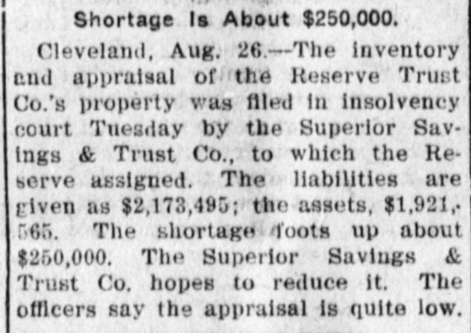 Shortage Is About $250,000. Cleveland, Aug. 26.-The inventory and appraisal of the Reserve Trust Co.'s property was filed in insolvency court Tuesday by the Superior Savings & Trust Co., to which the Reserve assigned. The liabilities are given as $2,173,495; the assets, $1,921,565. The shortage foots up about $250,000. The Superior Savings & Trust Co. hopes to reduce it. The officers say the appraisal is quite low.