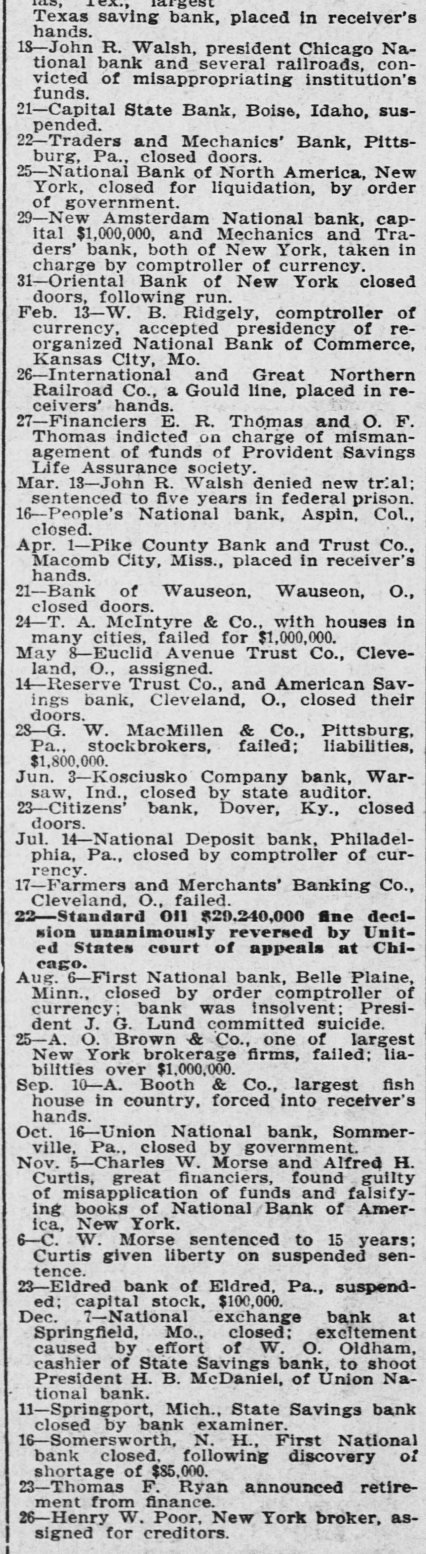 Texas saving bank, placed in receiver's hands. 18-John R. Walsh, president Chicago National bank and several railroads, convicted of misappropriating institution's funds. 21-Capital State Bank, Boise, Idaho, suspended. 22-Traders and Mechanics' Bank, Pittsburg. Pa., closed doors. 25-National Bank of North America, New York, closed for liquidation, by order of government. 29-New Amsterdam National bank, capital $1,000,000, and Mechanics and Traders' bank. both of New York, taken in charge by comptroller of currency. 31-Oriental Bank of New York closed doors. following run. Feb. 13-W. B. Ridgely, comptroller of currency, accepted presidency of reorganized National Bank of Commerce, Kansas City, Mo. 26-International and Great Northern Railroad Co., a Gould line, placed in receivers' hands. 27-Financiers E. R. Thomas and O. F. Thomas indicted on charge of mismanagement of funds of Provident Savings Life Assurance society. Mar. 13-John R. Walsh denied new trial: sentenced to five years in federal prison. 16-People's National bank, Aspin, Col., closed. Apr. 1-Pike County Bank and Trust Co., Macomb City, Miss., placed in receiver's hands. 21-Bank of Wauseon, Wauseon, O., closed doors. 24-T. A. McIntyre & Co., with houses in many cities, falled for $1,000,000. May 8-Euclid Avenue Trust Co., Cleveland. O., assigned. 14-Reserve Trust Co., and American Savings bank, Cleveland, O., closed their doors. 28-G. W. MacMillen & Co., Pittsburg, Pa., stockbrokers, failed: liabilities, $1,800,000. Jun. 3-Kosclusko Company bank, Warsaw, Ind., closed by state auditor. 23-Citizens' bank, Dover, Ky., closed doors. Jul. 14-National Deposit bank, Philadelphia, Pa., closed by comptroller of currency. 17-Farmers and Merchants' Banking Co., Cleveland, O., failed. 22-Standard on $29,240,000 fine declstep unanimously reversed by United States court of appeals at Chiengo. Aug. 6-First National bank, Belle Plaine, Minn., closed by order comptroller of currency: bank was insolvent: President J. G. Lund committed suicide. 25-A. O. Brown & Co., one of largest New York brokerage firms, failed; liabilities over $1,000,000. Sep. 10-A. Booth & Co., largest fish house in country, forced into receiver's hands. Oct. 16-Union National bank, Sommerville, Pa., closed by government. Nov. 5-Charles W. Morse and Alfred H. Curtis, great financiers, found guilty of misapplication of funds and falsifying books of National Bank of America, New York. 6-C. W. Morse sentenced to 15 years: Curtis given liberty on suspended sentence. 23-Eldred bank of Eldred, Pa., suspended: capital stock, $100,000. Dec. 7-National exchange bank at Springfield. Mo., closed; excitement caused by effort of W. O. Oldham, cashier of State Savings bank, to shoot President H. B. McDaniel, of Union National bank. 11-Springport, Mich., State Savings bank closed by bank examiner. 16-Somersworth, N. H., First National bank closed, following discovery of shortage of $85,000. 23-Thomas F. Ryan announced retirement from finance. 26-Henry W. Poor. New York broker, assigned for creditors.