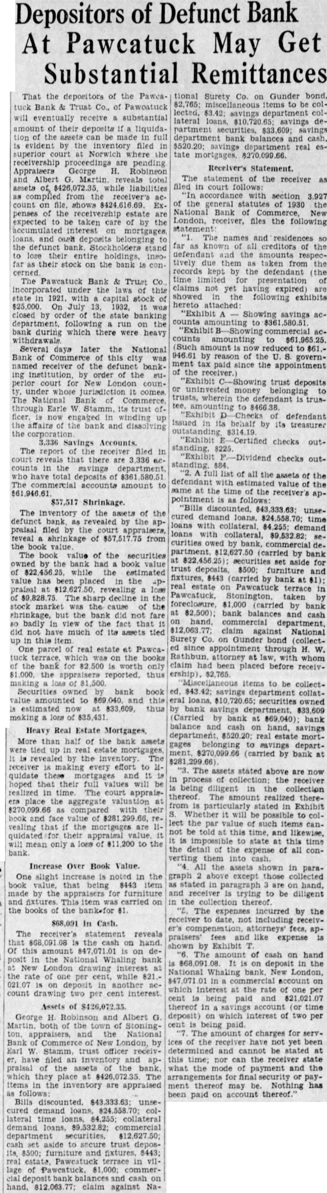 Depositors of Defunct Bank At Pawcatuck May Get Substantial Remittances That the depositors of the Pawea tional Surety Co. Gunder be colBank & Trust Co., of Pawcatuck lected, savings department colwill eventually receive substantial lateral savings amount of their deposits partment securities, savings tion the made full department bank balances and is by the inventory filed department real essuperior at Norwich where the tate $270,099.66. receivership proceedings are pending Receiver's Statement. Appraisers George Robinson and Albert Martin reveals The statement of the receiver as assets of $426,072.35. while liabilities filed court follows: as from receiver's section 3.927 count on shows Ex- of the general 1930 the the estate National Bank penses receivership expected taken care of the London, receiver, files the following accumulated interest statement and cash deposits belonging The names and residences the defunct far as known creditors of the stand lose entire the respectheir stock on the bank is tively due taken the records kept the defendant The Pawcatuck Bank Trust Co. time limited presentation claims not expired) this 1921. with capital stock showed following exhibits hereto attached On July 13, was closed order the state banking "Exhibit Showing savings acdepartment, run on bank during which there heavy amounting to Several days later the National Bank this 946.61 by reason of the governcity was named receiver the defunct ment tax paid since the appointment ing institution, by order the su. court for coun- "Exhibit Showing trust deposits comes The wherein the defendant trusEarle its trust "Exhibit defendant now engaged in winding affairs the bank issued in its behalf by its treasurer and dissolving the corporation 3.336 Savings Accounts. -Certified checks outThe report of filed in "Exhibit reveals that are checks out$84. in the savings list of all the assets of the who deposits defendant value of the amount to at the time of the receiver's ap- $57,517 Shrinkage The inventory of the assets the defunct bank by the appraisal the of $57,517.75 from the The value of the securities had book value while estimated value has placed the revealing loss The in the stock was the bank did not fare badly the fact that not much of its assets tied in this One parcel real estate at Pawcathe books the thus bank book to and estimated thus making Heavy Real Mortgages More than half the bank assets estate mortgages, revealed by receiver making every effort quidate mortgages hoped that full court place aggregate compared with their book and face that the mortgages are quidated appraisal will mean only to the Increase Over Book Value. One slight noted in the value, 8443 item by the appraisers for furniture was carried the books the 81. $68,091 in Cash. The receiver's statement reveals on or this the New the rate of per while 821 another count drawing two per cent interest Assets of $426,072.35 George and Albert G. Martin both the of Stoning. and the National Bank Commerce New London, by Earl trust officer and apthe the which they The items the are appraised follows: discounted. $43,333.63; unsecured demand loans, lateral collateral securities, $12,627.50; cash set trust terrace in lage commerbalances cash claim against Na- pointment "Bills unseloans with collateral. loans collateral, $9,532.82: curities owed partment $12,627 (carried by bank securities set aside for trust deposits. $500; furniture $443 by bank real estate Pawcatuck terrace taken foreclosure, $1,000 (carried by bank bank balances and cash on department, claim against National Surety on Gunder bond (collectsince appointment through H. W. whom claim had placed before receivitems to be collected. savings department collatsecurities owned bank savings (Carried by bank at $69,040) bank balance and savings real estate mortgages belonging to depart(carried by bank The assets stated above process collection: the receiver being diligent the collection thereof realized thereparticularly stated in Exhibit Whether be lect the value of items canbe told this time, and state this time detail the expense of all converting them into All assets shown in paragraph above except those collected stated paragraph on hand. and receiver trying to be diligent in the thereof The incurred by the date, including er's appraisers' and like expense shown Exhibit The amount of cash on hand on deposit the National Whaling bank, London, on rate per paid and thereof (or deposit) which interest of two per being paid The amount charges for ices of the receiver have not yet been determined and cannot be stated time; nor can the what the mode payment and the ment thereof may Nothing has been paid on account thereof.'
