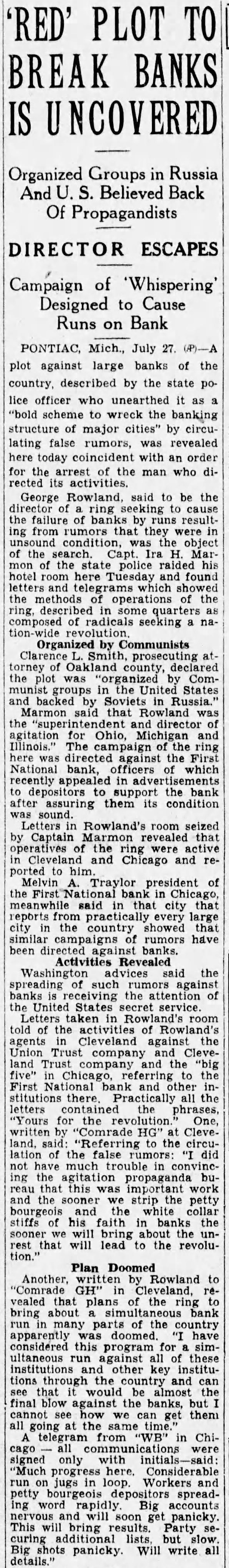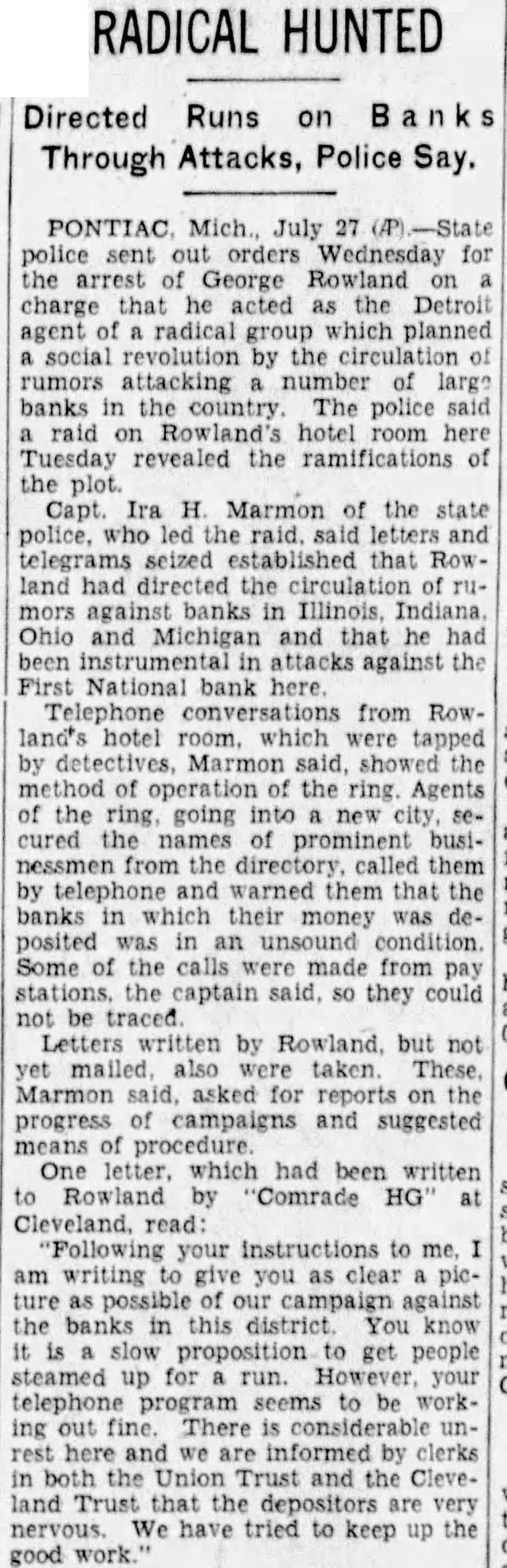 [By The Associated Press.] PONTIAC, MICH., July plot against banks the described by State police officer who "bold scheme structure major circulating false rumors, was here today coincident with order for the arrest of the ected its activities George Rowland. said be the rector of ring seeking to failure banks by runs resulting from rumors that they were in unsound condition. the object of the search. Captain Ira Marmon of the police raided his hotel and letters and the methods of operation of the ring, described of radicals seeking revolution Smith prosecuting Oakland County declared the plot was by Commungroups the United States and backed Soviets in Russia Directed Activities States. Marmon Rowland the and director of tation for Ohio, and Illinois the ring was the First Bank which cently depositors to support the bank after assuring them was sound Letters Rowland's room seized Captain Marmon revealed the ring were active CleveChicago reported Letters written Rowland the operati in those two cities for the the campaign and asked for president the National Bank Chicago, that city that refrom practically every city country similar campaigns rumors have been directed banks advices the spreadof such rumors banks the attention the United States Service. Secret Service agents already number Moran. chief the said, and every found that the stories untrue the were financial Close operation with State officials cases was promised Letters Rowland's room told the activities of Rowland's agents in Cleveland against the Union Trust Company and Cleveland Trust Company and the "Big Five" Chicago, the Bank and other there Practically the letters contained the "Yours for the revolution. One. written by Comrade HG, referring the circulation the false did not have trouble in convincing the agitation bureau that this important work the sooner strip petty bourgeois the white-collar his faith banks will about the unrest that will lead to the Another written by Rowland "Comrade plans of the to about run many parts the country apparently was considered this program simultaneous against institutions and other key institutions through the country and