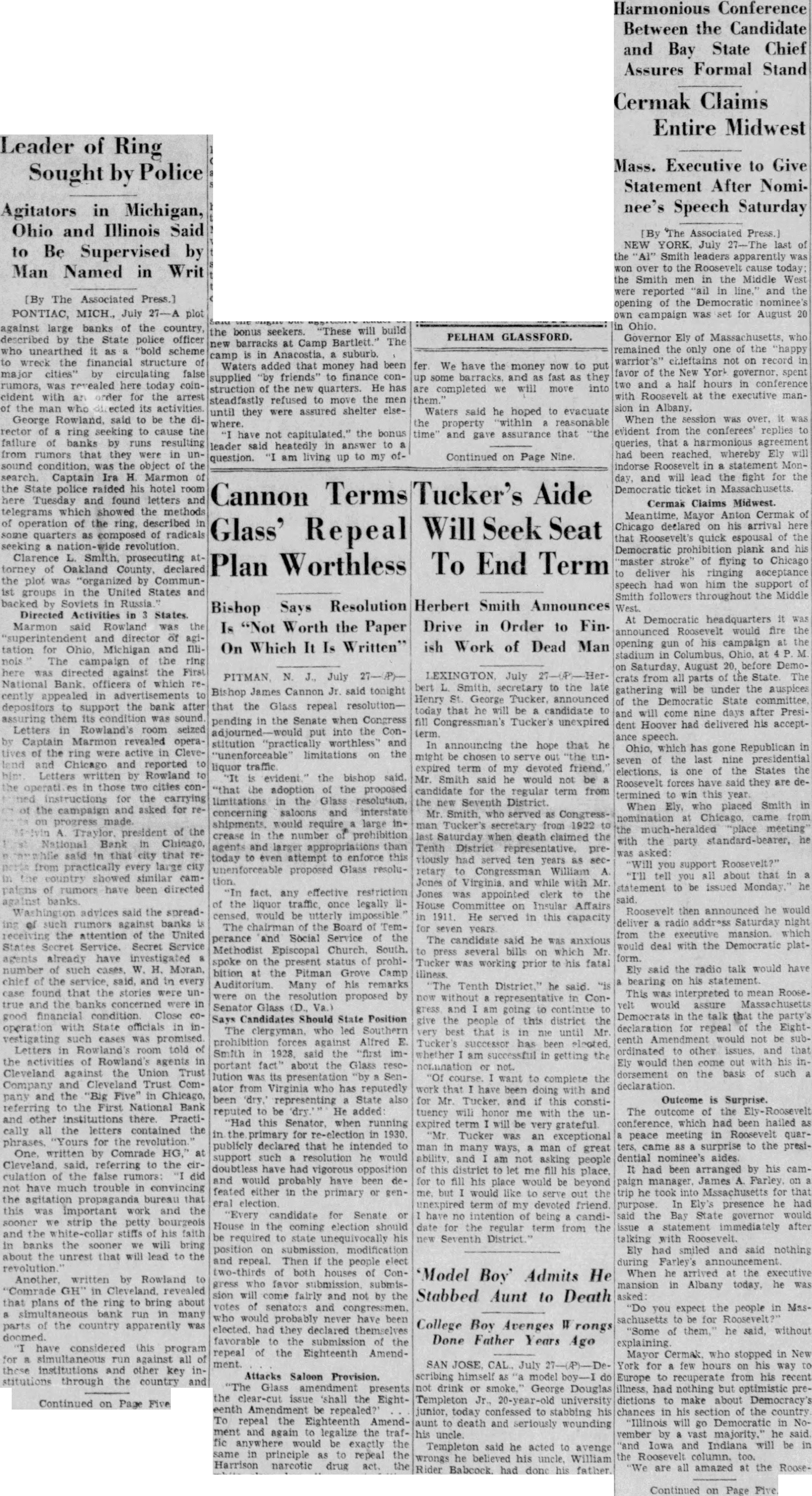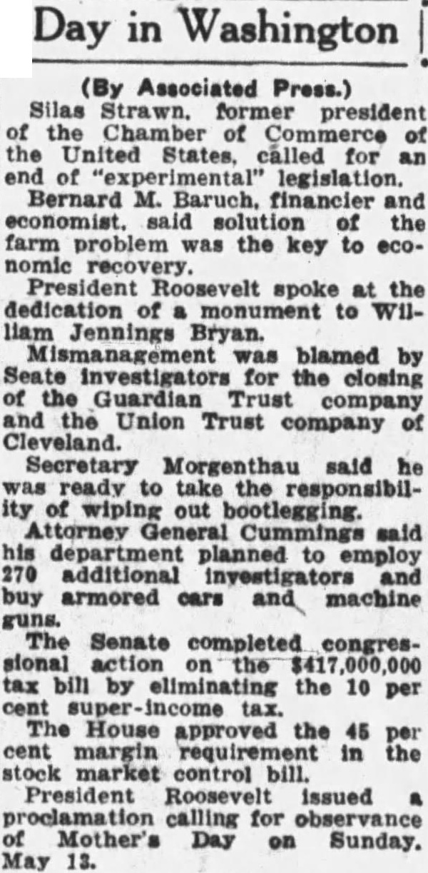 (By Associated Press.) Silas Strawn. former president of the Chamber of Commerce of the United States. called for an end of "experimental" legislation. Bernard M. Baruch. financier and economist. said solution of the farm problem was the key to economic recovery. President Roosevelt spoke at the dedication of monument to Willliam Jennings Bryan. Mismanagement was blamed by Seate investigators for the closing of the Guardian Trust company and the Union Trust company of Cleveland. Secretary Morgenthau said he was ready take the responsibility of wiping out bootlegging. Attorney General Cummings said his department planned to employ 270 additional investigators and buy armored cars and machine guns. The Senate completed congressional action the $417,000,000 tax bill by eliminating the 10 per cent super income tax. The House approved the 45 cent margin requirement in stock market control bill. President Roosevelt issued proclamation calling for observance of Mother's Day on Sunday. May 13.