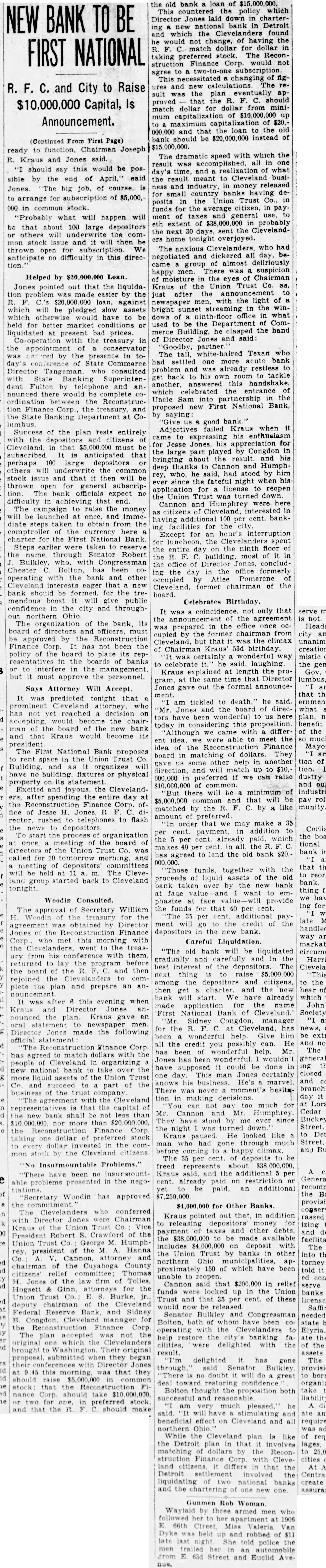 Jones pointed out that the liquidation problem easier by the R. loan, against which will pledged slow assets have to be for or prices. the treasury in appointment the presence in toState Commerce Director Tangeman consulted State Banking SuperintenFulton by and announced ordination the Reconstruction Finance the treasury. and the State Banking at CoSuccess the plan rests entirely the that must subscribed anticipated that perhaps 100 others underwrite the stock issue and that then will thrown for general subscripbank officials expect difficulty in achieving The to raise the money will launched and immethe of the charter the First National Steps earlier taken reserve the name, through Senator Robert Bulkley with Congressman Chester been operating the and other that new bank be for the tremendous give public confidence the city and throughout The organization of the bank, its board of directors and officers, must by the has not been the policy of the repthe interfere in the but the personnel.