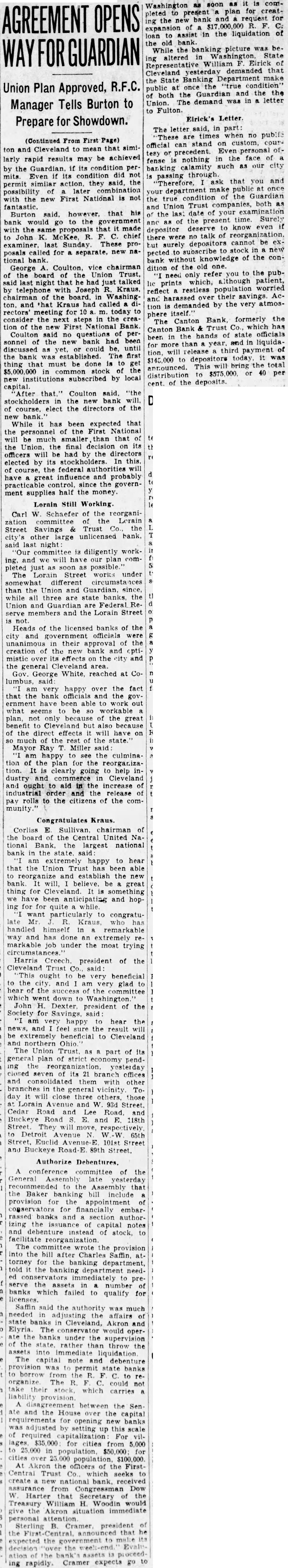The approval of Secretary William H. of the by Director Finance this with the the treasury from his with returned program the of the R. and then rejoined plete and prepare an after 6 evening when Kraus and Director Jones the plan. Kraus gave oral statement newspaper men. Jones made the following official statement Corp. bank take the liquid assets the Union Trust and succeed to part of the business the company agreement the Cleveland that the capital the shall not nor the Finance Corp. taking one dollar preferred dollar invested by the Cleveland citizens.