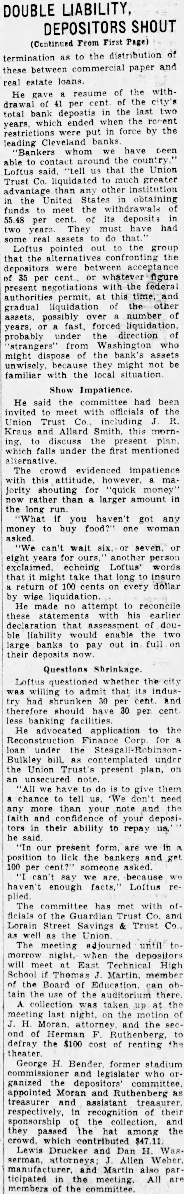 President Creech's dramatic appearance before the depositors yesterday had the effect of restoring confidence among depositors, and only handfull were in the lobby when the bank finally closed The statement of Gov. Fancher of the Federal Reserve, said: "Anxiety concerning deposits licensed banks in Cleveland is warranted. These banks were censed and reopened after careful determination of their condition. They are sound and they have and will continue to have the full support of the Federal Reserve bank.' The run on the Cleveland Trust and its branches came while officials of the Union Trust and Guardian Trust, the city's second and third largest were working reorganization plans which will allow the institutions to reopen. Sale of common stock in new tional bank to succeed both Union and Guardian now underway.