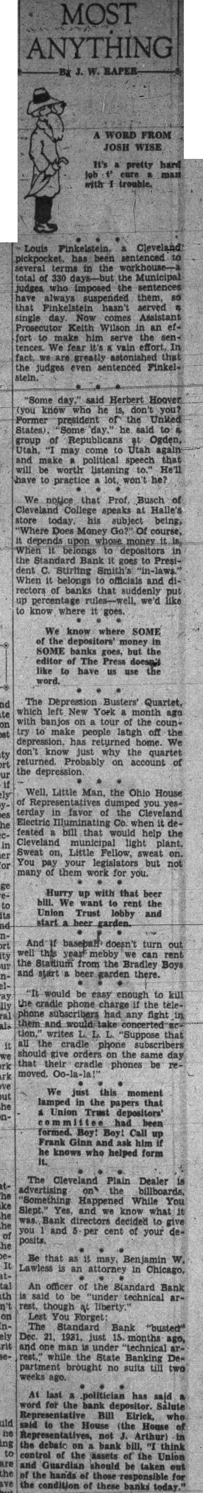 Depositors' Plan Due the plan being worked out the three closed with the Don Loftus, of the the plan being whipped into final alike stockholders and employees of closed reported of the tures the proposal called for 100 to depositors with than Yesterday Oscar Cox, conthe Union Trust the appointment James Rogan Austin, the jection to the appointment Dougherty counsel for the Co. "Mr. estimable gentlelawyer, his record in similar capacity the of the Realty and Savings Loan where he was one charges for such shared the disburse$368,000 above which cost including all other taxed against the depositors with counsel, total of $1,060,000." conThe committee, in renewing its objection to Mr. evidence that his former law firm Tolles. Hogsett Ginn had been counsel well advisers for the Trust Co. Cases The name Luther Day, attoradded today to those ported to be under for Daniel Morgan. city also conferred Mr. Cox yesterday John Bricker no further made until after his return Columbus from next Wednesday