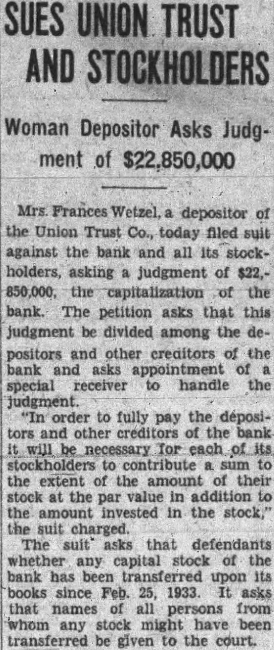 Mrs. Frances depositor of the Union Trust Co., today filed suit against the bank and all its stockholders, asking judgment of $22,850,000, the capitalization of the bank. The petition asks that this judgment be divided among the positors and other creditors of the bank appointment special receiver handle the judgment. to fully pay the dépositors and of the bank for the extent the amount the par the in the stock, the suit charged. that defendants any capital of the bank has transferred its books since Feb. 25, 1933. asks that names all persons whom stock might have transferred be given to the court.
