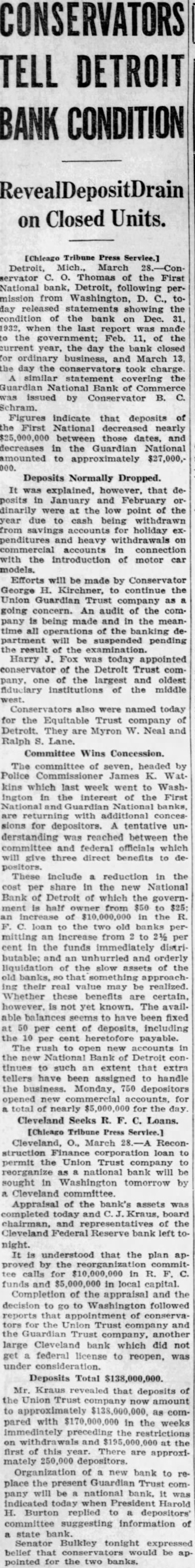 [Chicago Tribune Press Service.] Detroit, Mich., March Thomas the First National bank, Detroit, following permission from Washington, D. toreleased statements showing the condition bank on Dec. 31. 1932, the report made Feb. 11, the year, the day the bank for business, March 13, the day the took statement the Guardian Bank issued by Conservator B. Schram. Figures indicate that deposits of the First National decreased nearly those dates, and decreases in the Guardian National amounted approximately $27,000,-