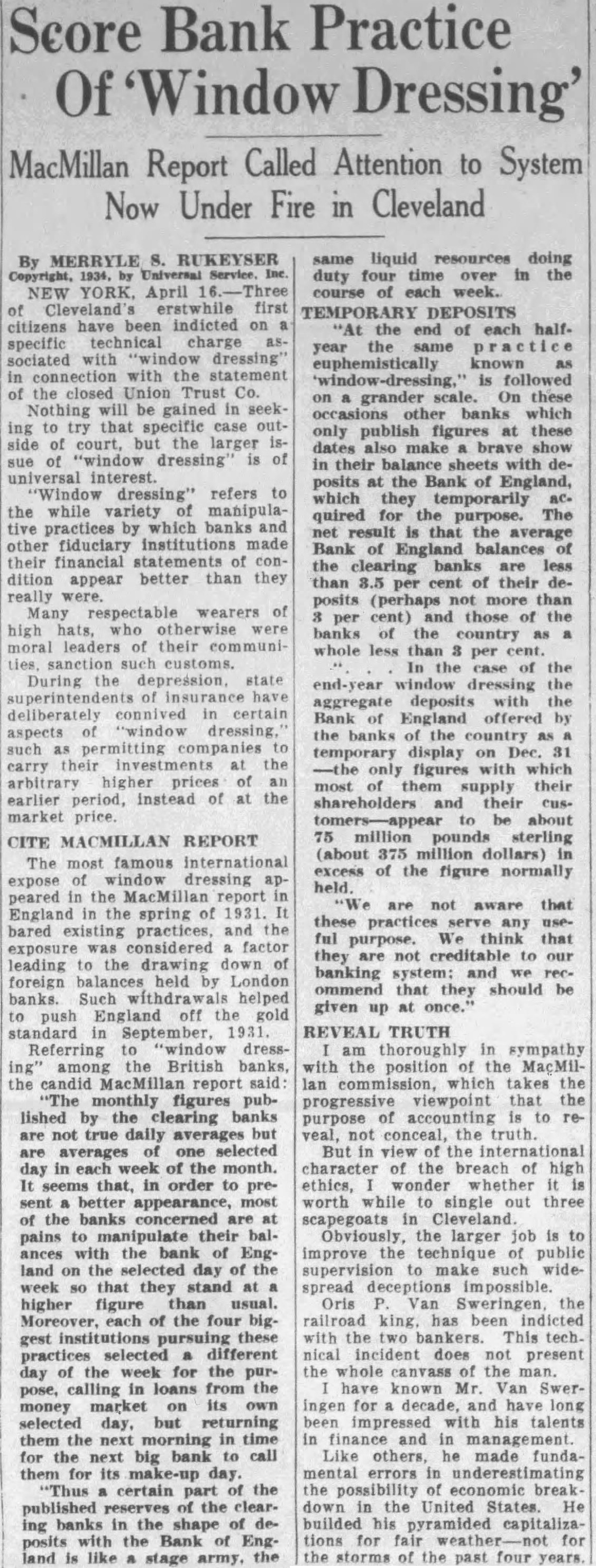 By MERRYLE S. RUKEYSER Copyright, 1934, NEW YORK, April of Cleveland's erstwhile first citizens have been indicted on specific technical charge associated with "window dressing in connection with the statement of the closed Union Trust Co. Nothing will be gained in seek ing to try that specific case outside of court, but the larger issue of "window dressing is of universal interest "Window dressing" refers to the while variety of manipulative practices by which banks and other fiduciary institutions made their financial statements of condition appear better than they really were. Many respectable wearers of high hats, who were moral leaders of their communities, sanction such customs. During the depression, state superintendents of insurance have deliberately connived in certain aspects of "window dressing, such as permitting companies carry their investments at the arbitrary higher prices of earlier period, instead of at the market price.