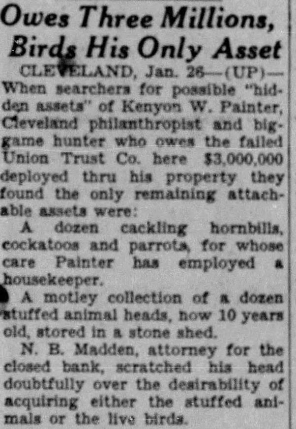 Owes Three Millions, Birds His Only Asset CLEVELAND Jan. When searchers for possible "hidden assets' of Kenyon W. Painter, Cleveland philanthropist and big. game hunter who owes the failed Union Trust Co. here $3,000,000 deployed thru his property they found the only remaining attachable assets were A dozen cackling hornbills, cockatoos and parrots, for whose care Painter has employed housekeeper. motley collection of a dozen stuffed animal heads, now 10 years old, stored in stone shed. N. B. Madden, attorney for the closed bank, scratched his head doubtfully over the desirability of acquiring either the stuffed animals or the live birds.