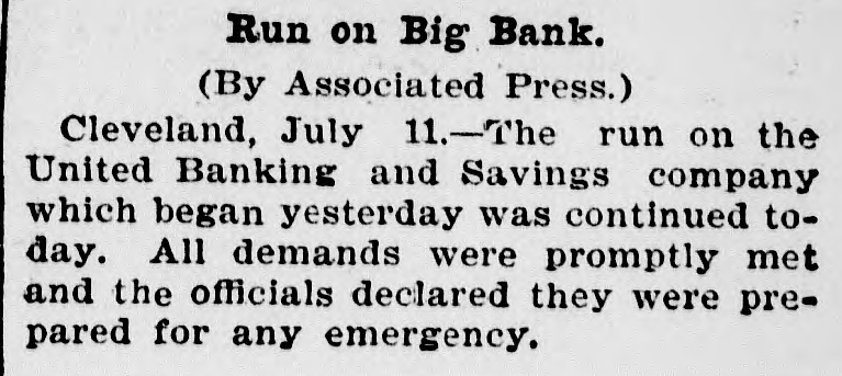 Run on Big Bank. (By Associated Press.) Cleveland, July 11.-The run on the United Banking and Savings company which began yesterday was continued today. All demands were promptly met and the officials declared they were prepared for any emergency.