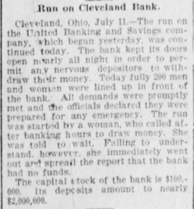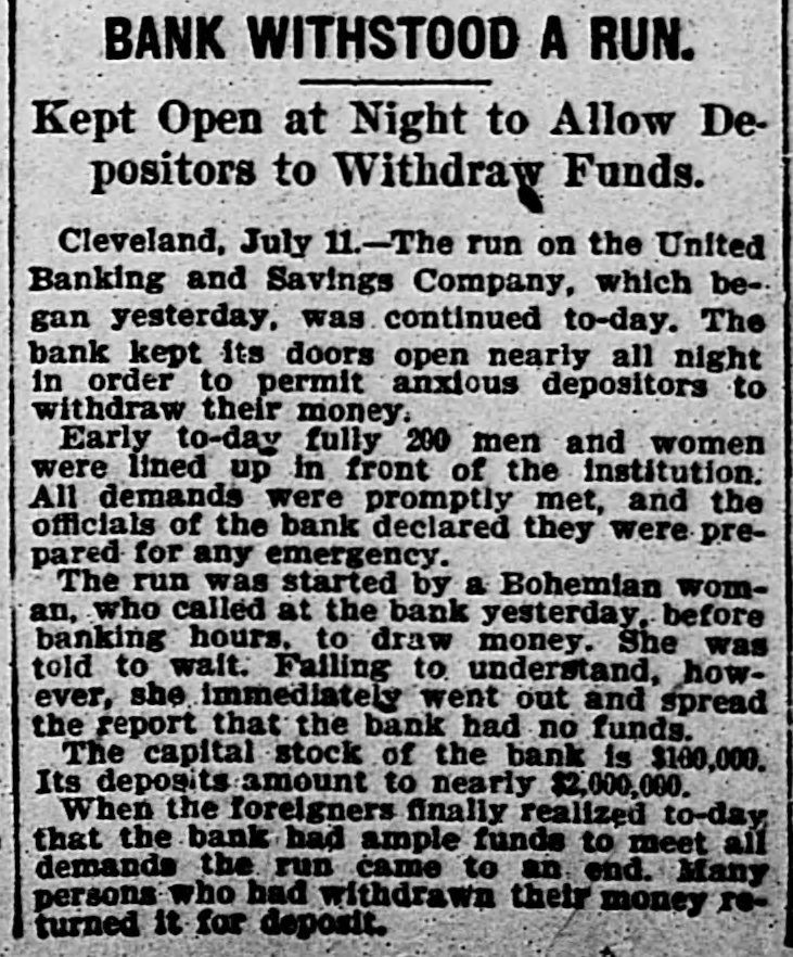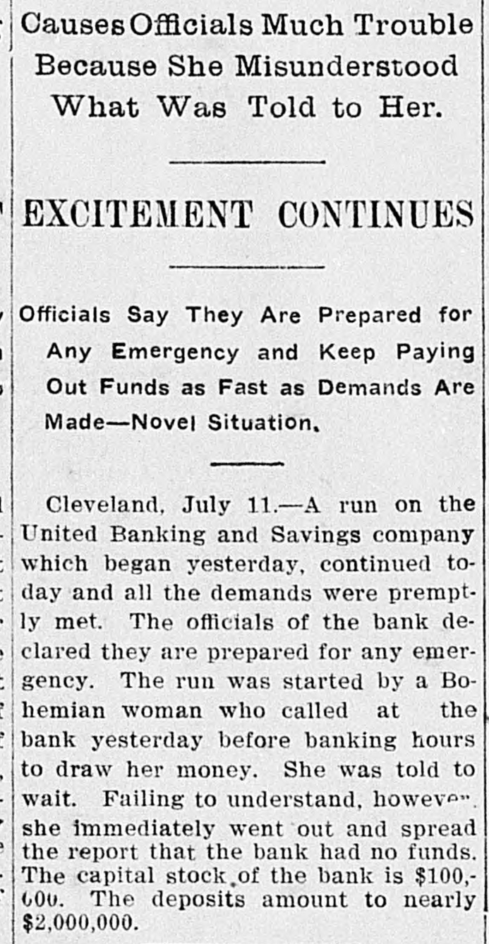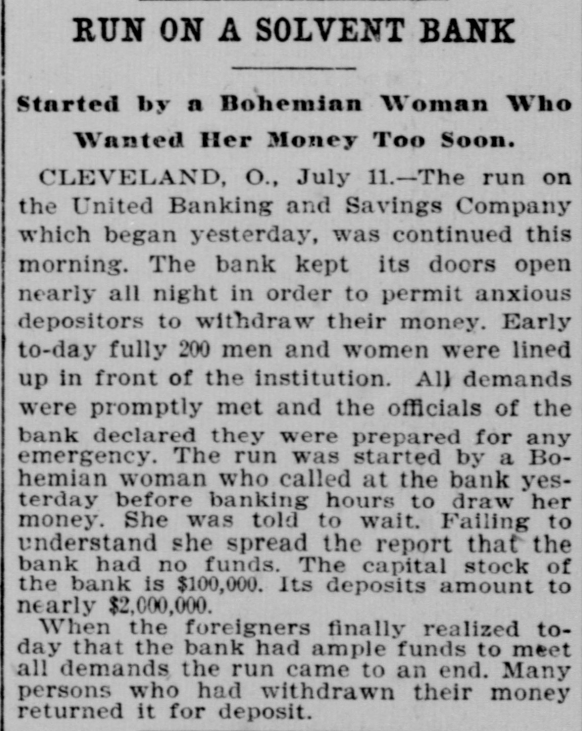 RUN ON A SOLVENT BANK Started by a Bohemian Woman Who Wanted Her Money Too Soon. CLEVELAND, O., July 11.-The run on the United Banking and Savings Company which began yesterday, was continued this morning. The bank kept its doors open nearly all night in order to permit anxious depositors to withdraw their money. Early to-day fully 200 men and women were lined up in front of the institution. All demands were promptly met and the officials of the bank declared they were prepared for any emergency. The run was started by a Bohemian woman who called at the bank yesterday before banking hours to draw her money. She was told to wait. Failing to understand she spread the report that the bank had no funds. The capital stock of the bank is $100,000. Its deposits amount to nearly $2,000,000. When the foreigners finally realized today that the bank had ample funds to meet all demands the run came to an end. Many persons who had withdrawn their money returned it for deposit.