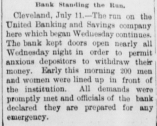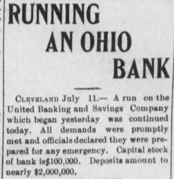 Run on a Cleveland Bank. Cleveland. July 11.-The run on the United Banking and Savings company, which began yesterday, continued today. All demands were promptly met and the officials of the bank declared they were prepared for any emergency. The run was started by a Bohemian woman who called at the bank yesterday before banking hours to draw her money. She was told to wait. Failing to understand, however, she immediately went out and spread the report that the bank had no funds. The capital stock of the bank is $100,000. The deposits amount to nearly $2,000,000. When the foreigners finally realized it had ample funds the run ceased.