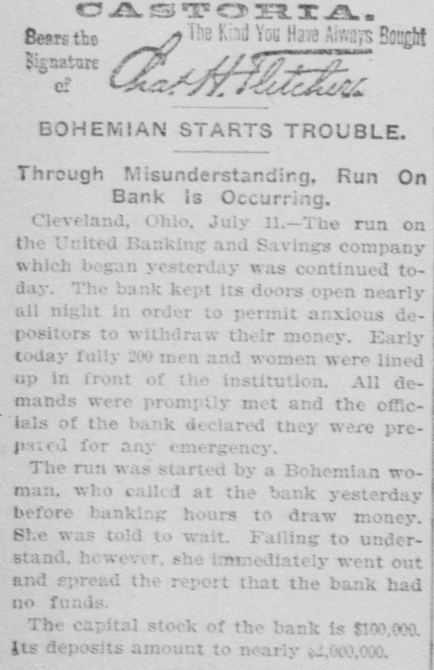 CASTORIA. Bears the The Kind You Have Always Bought Signature of BOHEMIAN STARTS TROUBLE. Through Misunderstanding, Run On Bank is Occurring. Cleveland, Ohio, July 11.-The run on the United Banking and Savings company which began yesterday was continued today. The bank kept its doors open nearly all night in order to permit anxious depositors to withdraw their money. Early today fully 200 men and women were lined up in front of the institution. All demands were promptly met and the officlals of the bank declared they were prepared for any emergency. The run was started by a Bohemian woman. who called at the bank yesterday before banking hours to draw money. She was told to wait. Failing to understand, however, she immediately went out and spread the report that the bank had no funds. The capital stock of the bank is $100,000. Its deposits amount to nearly $4,000,000.