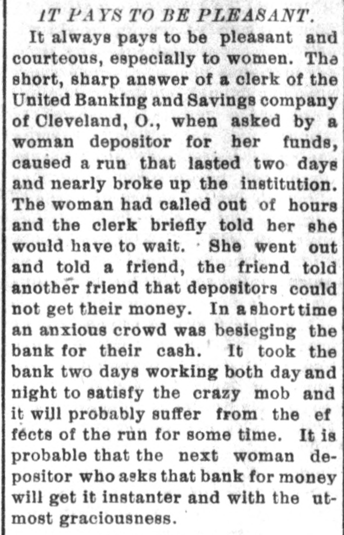 IT PAYS TO BE PLEASANT. It always pays to be pleasant and courteous, especially to women. The short, sharp answer of a clerk of the United Banking and Savings company of Cleveland, O., when asked by a woman depositor for her funds, caused a run that lasted two days and nearly broke up the institution. The woman had called out of hours and the clerk briefly told her she would have to wait. She went out and told a friend, the friend told another friend that depositors could not get their money. In shorttime an anxious crowd was besieging the bank for their cash. It took the bank two days working both day and night to satisfy the crazy mob and it will probably suffer from the ef fects of the run for some time. It is probable that the next woman depositor who asks that bank for money will get it instanter and with the utmost graciousness.