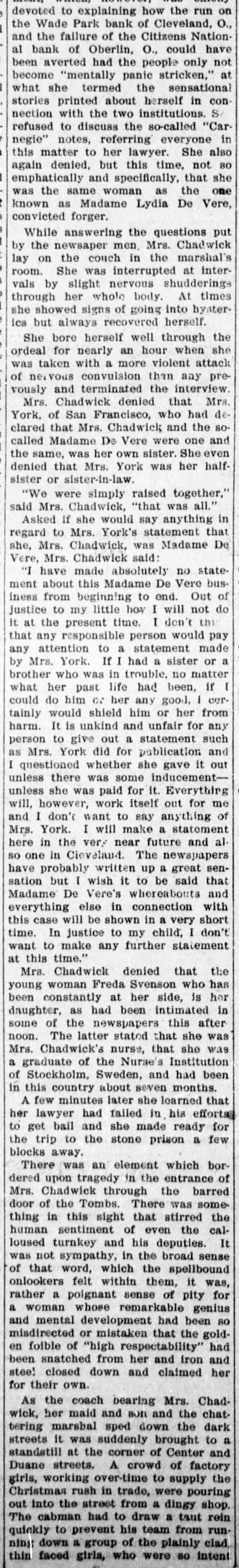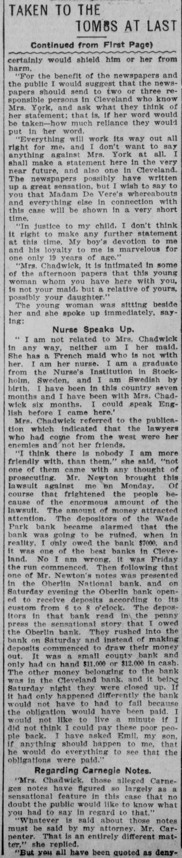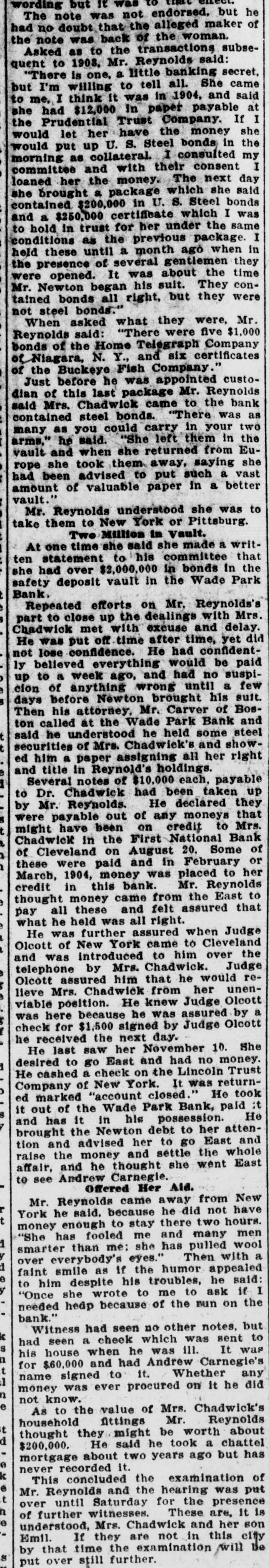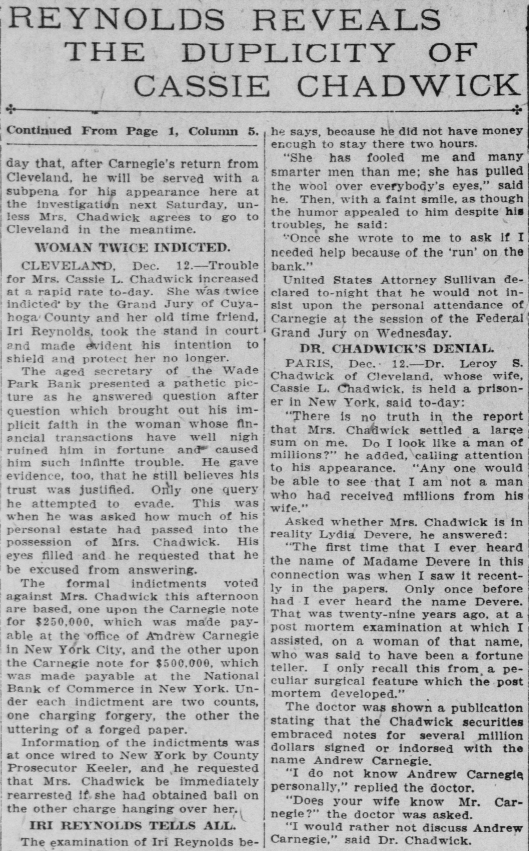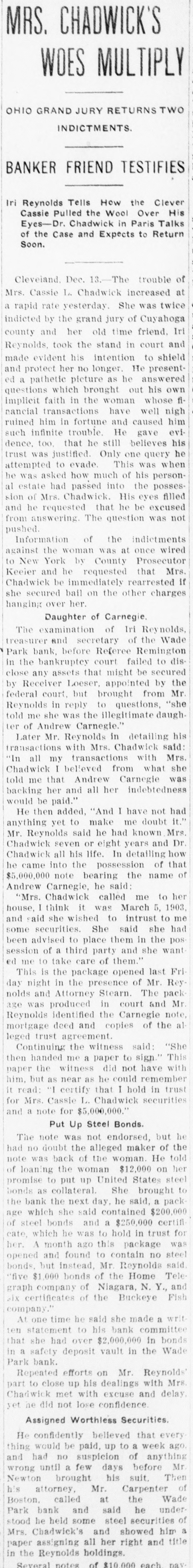 BELIEVED HER STORY THAT SHE WAS CARNEGIE'S DAUGHTER Loaned Her Thousands of Dollars-="She Has Fooled Me and Men Smarter Than I Am," He Says on the Witness Stand. At one time he said she made a By the Associated Press. written statement to his bank comCleveland, O., Dec. 12.-The trou mittee that she had over $2,000,000 in ble of Mrs. Cassie L Chadwick in bonds in a safety deposit vault in the creased at a rapid rate today, She Wiade Park bank. was twice indicted by the grand jury His Confidence Was Amazing. of Cuyohoga county, and her old time Repeated efforts on Reynolds' part friend, Iri Reynolds, took the stand o close up dealings with Mrs. Chad wick met with excuse and delay, yet in court and made evident his intenhe did not lose confidence, tion to shield and protect her no He confidently believed everything longer. would be paid, up to a week ago, and He presented a pathetic picture as had no suspicion of anything wrong he answered questions which brought intil a few days before Newton out his own implicit faith in the wo brought suit. Then his attorney, Mr. man whose financial transactions Carver, of Boston, called at the have well nigh ruined him in for Wade Park bank and said he undertune, and caused him such infinite stood he held some steel securities trouble. He gave evidence, too, that or Mrs. Chadwick's and showed him he still believes his trust was justipaper assigning all her right and fied. itle in Reynolds' holdings. Evades a Question. Paid Notes For Her. Only one query he attempted to Several notes of $10,000, each pay. evade. This was when he asked how ble to Dr. Chadwick, had been takmuch of his personal estate had pass n up by Reynolds. He declared ed into the possession of Mrs. Chad hey were payable out of any monwick. His eyes filled. and he request ys that might have been on credit ed that he be excused from answero Mrs. Chadwick in the First Nation ing. The question was not pushed d bank of Cleveland August 20. Information of the indictments Some of these were paid and in Febagainst the woman was at once uary or March, 1904, the money was wired to New York by County Prose placed to her credit in this bank. cutor Keeler, and he requested that Leynolds thought the money came Mrs. Chadwick be immediately rerom the east to pay all these, and arrested if she secured bail on the elt assured thai what he held was other charges. all right. Examination of Iri Reynolds, treas The Last Time He Saw Her. urer and secretary of the Wade Park Reynolds said the last saw Mrs. bank, before Referee Remington In Chadwick was Nov. 10. She desirthe bankruptcy court today failed to d to go East and having no money disclose any asset that might be se ie cashed a check on the Lincoln cured by Receiver Loesser, appoint Frust company. New York. It was ed by the federal court, but brought returned marked, "account closed. from Reynolds in reply to questions, le took it out of the Wade Park "she told me she was the illegitimate bank, paid it and has it in his posdaughter of Andrew Carnegie." assion. He brought the Newton debt He Believed Her Story. o her attention and advised her to Later Reynolds in detailing his to East and raise the money and settransactions with Mrs. Chadwick le the whole affair, and he thought said: "In all my transactions with he went East to see Andrew CarMrs. Chadwick I believed from what negie. "She has fooled me and many she told me that Andrew Carnegie men smarter than I am: she has was backing her and all her indebtpulled the wool over everybody' edness would be paid. a eyes," said Reynolds. Then with He then added, "and I have not faint smile. as though the humor ap had anything yet to make me doubt Sealed to him despite his troubles, it. Reynolds said he had known ne said: "Once she wrote to me to Mrs. Chadwick seven or eight years ask if I needed help because of a and Dr. Chadwick all his life. In deun on the bank. tailing how he came into possession ent Her $15,000 Across the Water. of the $5,000,000 note bearing the Reynolds also told of having C. name of Andrew Carnegie, he said: led her $15,000 when she wrote him "Mrs. Chadwick called me to her hat all her family were sick in Euhouse, I think it was March 5, 1903 ope and she was out of funds. He and said she wished to intrust to me lad seen a check for $60,000 with some securities. She said she had Andrew Carnegie's name signed to been advised to place them in the t. but did not know whether any possession of a third party, and she honey was ever procured on it. He wanted me to take care of them. estimated the woman's household fit This is the package opened last ings to be worth $20,000. He took a Friday night in the presence of Reychattel mortgage two years ago, but nolds and Attorney Stearn. t was never recorded. The package was produced in court and Reynolds identified the Carnegie SHE IS MADAME DEVERE. note, mortgage deed and copies of the alleged trust agreement. Woman Recognizes Mrs. Chadwick Continuing the witness said: "She as the Confidence Swindler. then handed me a paper to sign." "This paper the witness did not have By the Associated Press. with him, but as near as he could Portsmouth, D., Dec 12.-Mrs. remember it read: "I certify that I Charles James, widow of the late hold in trust for Mrs. Cassie L. Warden James. was intimately acChadwick securities and a note for quainte:l with Madame Devere dur$5,000,000. ing her incarceration in the Ohio He Loaned Her Money. penitentiary. and today declared posThe note was not endorsed, but he tively that Madame Devere and Mrs. had no doubt the alleged maker of Chadwick were one and the same. the note was back of the woman. He Mrs. James said: told of loaning the woman $12,000 on My heart goes out in sympathy her promise to put up United States fo the woman I knew as a good resteel bonds as collateral. She fined woman. Her character was brought to the bank the next day, he above reproach and she was overly said, a package which she said concharitable. Tho