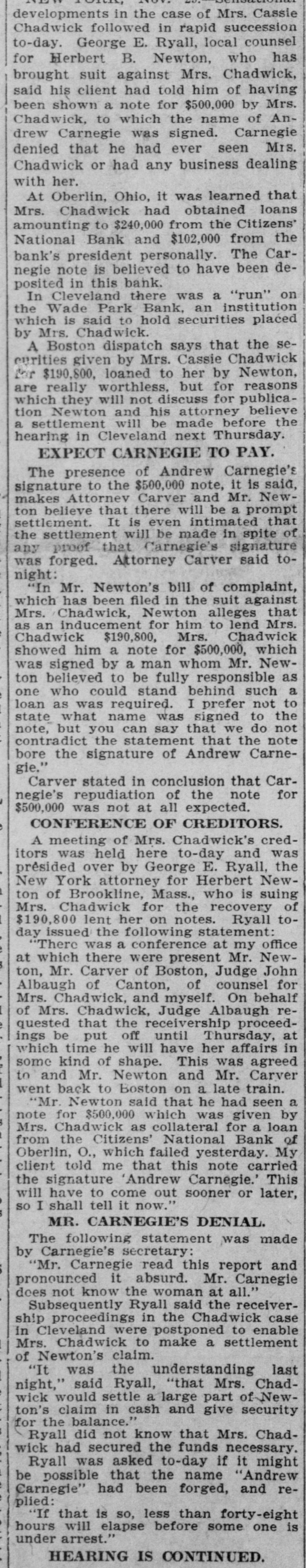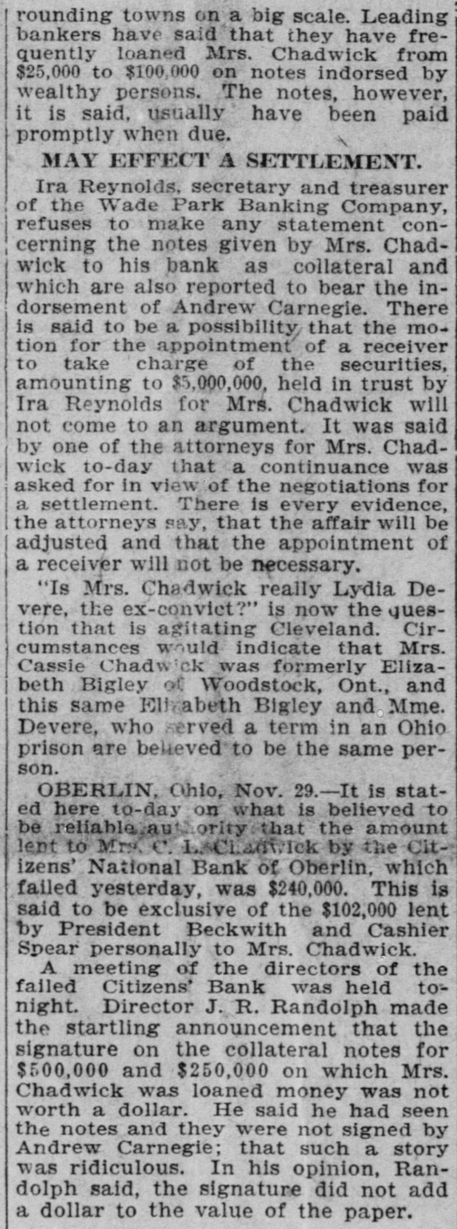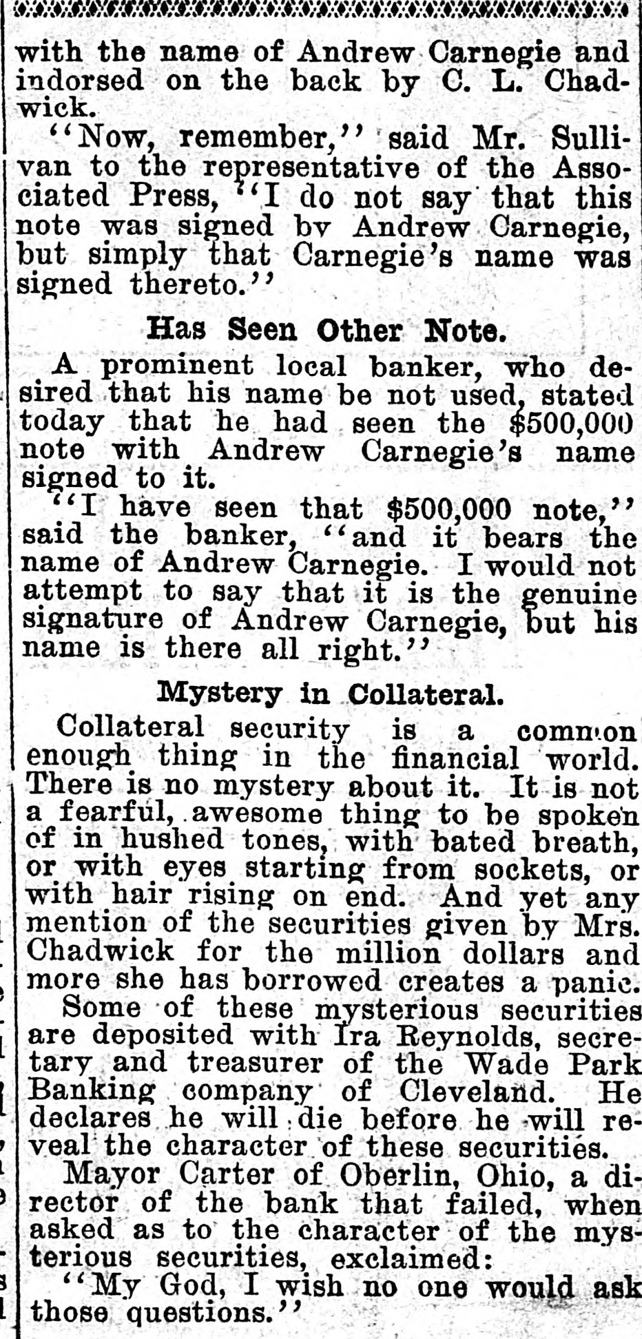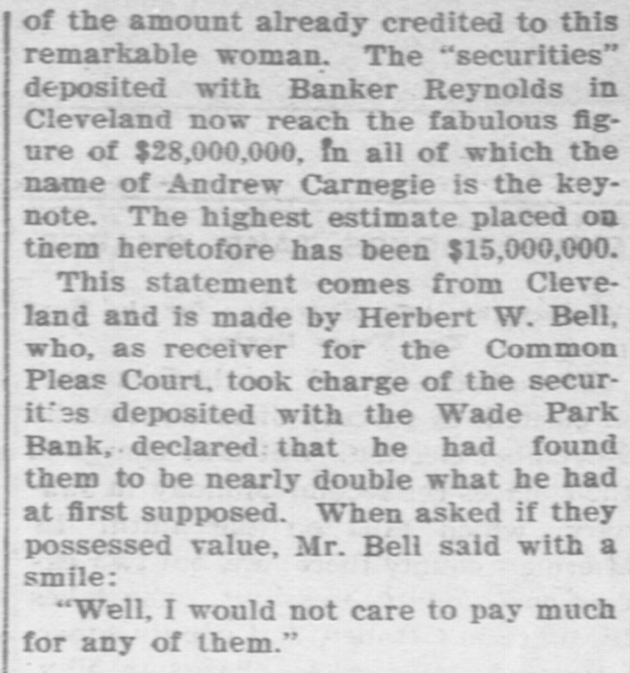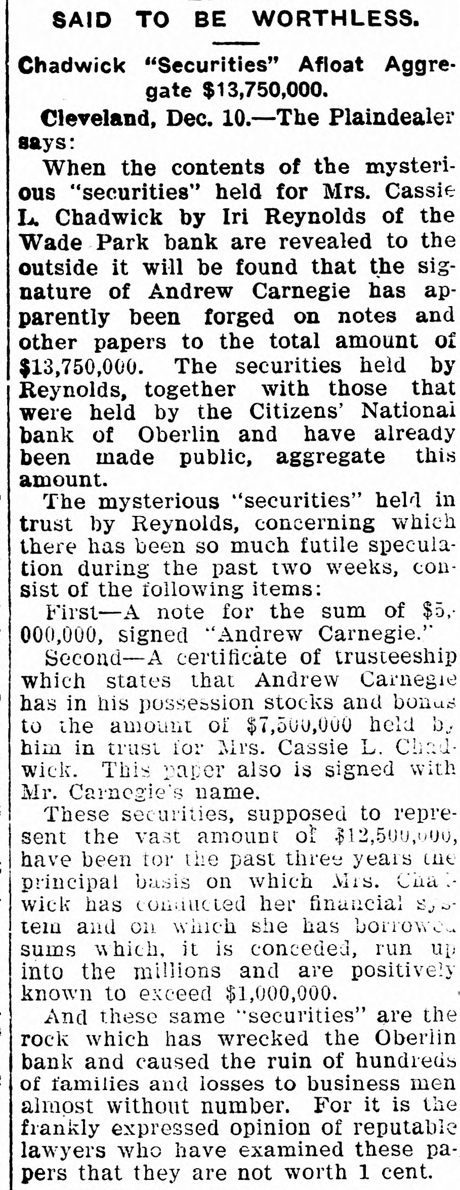 BELIEVED HER STORY THAT SHE WAS CARNEGIE'S DAUGHTER Loaned Her Thousands of Dollars-="She Has Fooled Me and Men Smarter Than I Am," He Says on the Witness Stand. At one time he said she made a By the Associated Press. written statement to his bank comCleveland, O., Dec. 12.-The trou mittee that she had over $2,000,000 in ble of Mrs. Cassie L Chadwick in bonds in a safety deposit vault in the creased at a rapid rate today, She Wiade Park bank. was twice indicted by the grand jury His Confidence Was Amazing. of Cuyohoga county, and her old time Repeated efforts on Reynolds' part friend, Iri Reynolds, took the stand o close up dealings with Mrs. Chad wick met with excuse and delay, yet in court and made evident his intenhe did not lose confidence, tion to shield and protect her no He confidently believed everything longer. would be paid, up to a week ago, and He presented a pathetic picture as had no suspicion of anything wrong he answered questions which brought intil a few days before Newton out his own implicit faith in the wo brought suit. Then his attorney, Mr. man whose financial transactions Carver, of Boston, called at the have well nigh ruined him in for Wade Park bank and said he undertune, and caused him such infinite stood he held some steel securities trouble. He gave evidence, too, that or Mrs. Chadwick's and showed him he still believes his trust was justipaper assigning all her right and fied. itle in Reynolds' holdings. Evades a Question. Paid Notes For Her. Only one query he attempted to Several notes of $10,000, each pay. evade. This was when he asked how ble to Dr. Chadwick, had been takmuch of his personal estate had pass n up by Reynolds. He declared ed into the possession of Mrs. Chad hey were payable out of any monwick. His eyes filled. and he request ys that might have been on credit ed that he be excused from answero Mrs. Chadwick in the First Nation ing. The question was not pushed d bank of Cleveland August 20. Information of the indictments Some of these were paid and in Febagainst the woman was at once uary or March, 1904, the money was wired to New York by County Prose placed to her credit in this bank. cutor Keeler, and he requested that Leynolds thought the money came Mrs. Chadwick be immediately rerom the east to pay all these, and arrested if she secured bail on the elt assured thai what he held was other charges. all right. Examination of Iri Reynolds, treas The Last Time He Saw Her. urer and secretary of the Wade Park Reynolds said the last saw Mrs. bank, before Referee Remington In Chadwick was Nov. 10. She desirthe bankruptcy court today failed to d to go East and having no money disclose any asset that might be se ie cashed a check on the Lincoln cured by Receiver Loesser, appoint Frust company. New York. It was ed by the federal court, but brought returned marked, "account closed. from Reynolds in reply to questions, le took it out of the Wade Park "she told me she was the illegitimate bank, paid it and has it in his posdaughter of Andrew Carnegie." assion. He brought the Newton debt He Believed Her Story. o her attention and advised her to Later Reynolds in detailing his to East and raise the money and settransactions with Mrs. Chadwick le the whole affair, and he thought said: "In all my transactions with he went East to see Andrew CarMrs. Chadwick I believed from what negie. "She has fooled me and many she told me that Andrew Carnegie men smarter than I am: she has was backing her and all her indebtpulled the wool over everybody' edness would be paid. a eyes," said Reynolds. Then with He then added, "and I have not faint smile. as though the humor ap had anything yet to make me doubt Sealed to him despite his troubles, it. Reynolds said he had known ne said: "Once she wrote to me to Mrs. Chadwick seven or eight years ask if I needed help because of a and Dr. Chadwick all his life. In deun on the bank. tailing how he came into possession ent Her $15,000 Across the Water. of the $5,000,000 note bearing the Reynolds also told of having C. name of Andrew Carnegie, he said: led her $15,000 when she wrote him "Mrs. Chadwick called me to her hat all her family were sick in Euhouse, I think it was March 5, 1903 ope and she was out of funds. He and said she wished to intrust to me lad seen a check for $60,000 with some securities. She said she had Andrew Carnegie's name signed to been advised to place them in the t. but did not know whether any possession of a third party, and she honey was ever procured on it. He wanted me to take care of them. estimated the woman's household fit This is the package opened last ings to be worth $20,000. He took a Friday night in the presence of Reychattel mortgage two years ago, but nolds and Attorney Stearn. t was never recorded. The package was produced in court and Reynolds identified the Carnegie SHE IS MADAME DEVERE. note, mortgage deed and copies of the alleged trust agreement. Woman Recognizes Mrs. Chadwick Continuing the witness said: "She as the Confidence Swindler. then handed me a paper to sign." "This paper the witness did not have By the Associated Press. with him, but as near as he could Portsmouth, D., Dec 12.-Mrs. remember it read: "I certify that I Charles James, widow of the late hold in trust for Mrs. Cassie L. Warden James. was intimately acChadwick securities and a note for quainte:l with Madame Devere dur$5,000,000. ing her incarceration in the Ohio He Loaned Her Money. penitentiary. and today declared posThe note was not endorsed, but he tively that Madame Devere and Mrs. had no doubt the alleged maker of Chadwick were one and the same. the note was back of the woman. He Mrs. James said: told of loaning the woman $12,000 on My heart goes out in sympathy her promise to put up United States fo the woman I knew as a good resteel bonds as collateral. She fined woman. Her character was brought to the bank the next day, he above reproach and she was overly said, a package which she said concharitable. Tho