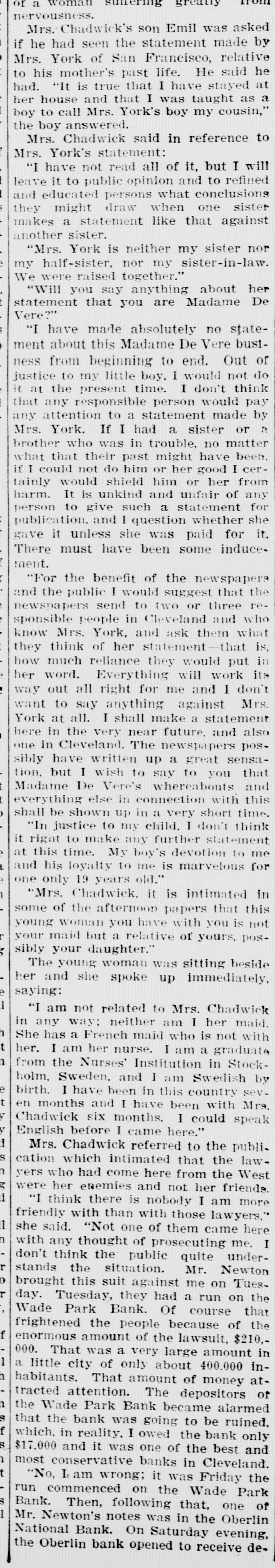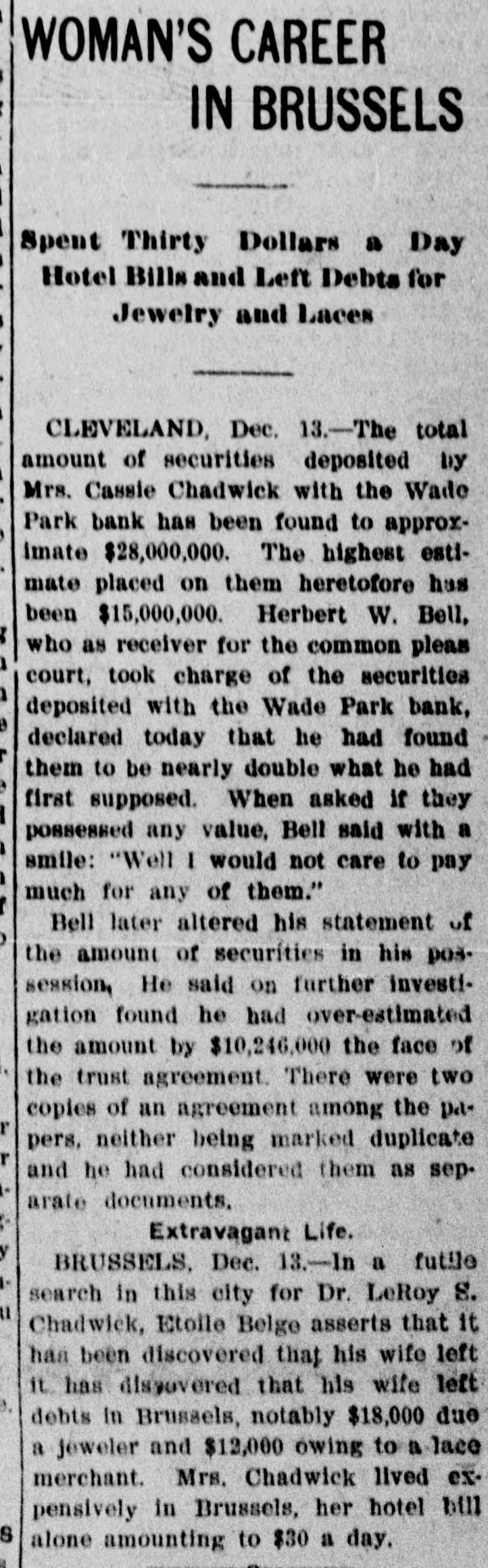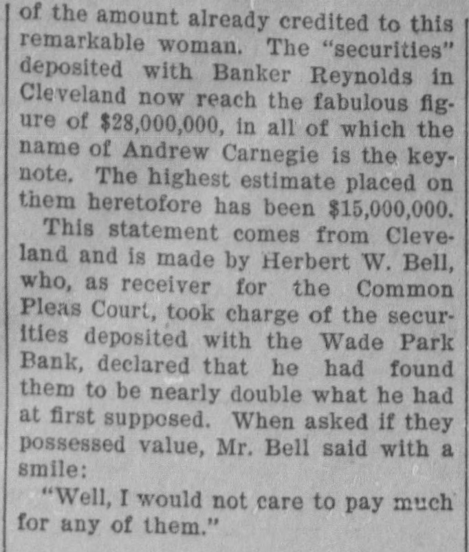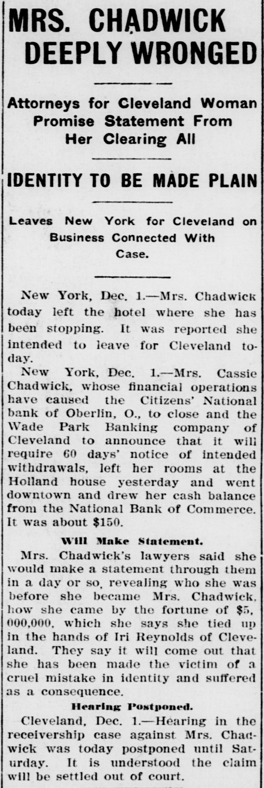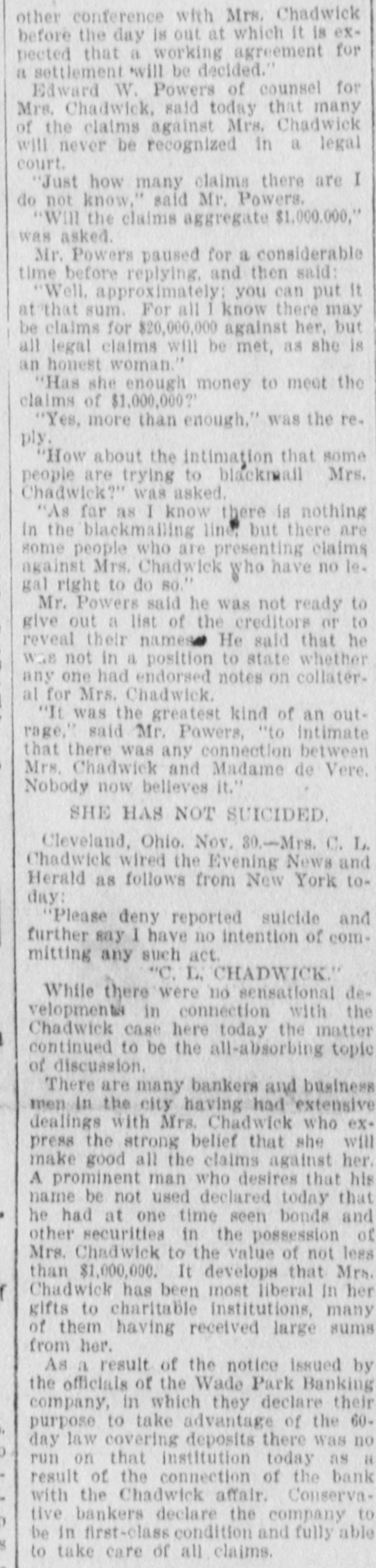 BELIEVED HER STORY THAT SHE WAS CARNEGIE'S DAUGHTER Loaned Her Thousands of Dollars-="She Has Fooled Me and Men Smarter Than I Am," He Says on the Witness Stand. At one time he said she made a By the Associated Press. written statement to his bank comCleveland, O., Dec. 12.-The trou mittee that she had over $2,000,000 in ble of Mrs. Cassie L Chadwick in bonds in a safety deposit vault in the creased at a rapid rate today, She Wiade Park bank. was twice indicted by the grand jury His Confidence Was Amazing. of Cuyohoga county, and her old time Repeated efforts on Reynolds' part friend, Iri Reynolds, took the stand o close up dealings with Mrs. Chad wick met with excuse and delay, yet in court and made evident his intenhe did not lose confidence, tion to shield and protect her no He confidently believed everything longer. would be paid, up to a week ago, and He presented a pathetic picture as had no suspicion of anything wrong he answered questions which brought intil a few days before Newton out his own implicit faith in the wo brought suit. Then his attorney, Mr. man whose financial transactions Carver, of Boston, called at the have well nigh ruined him in for Wade Park bank and said he undertune, and caused him such infinite stood he held some steel securities trouble. He gave evidence, too, that or Mrs. Chadwick's and showed him he still believes his trust was justipaper assigning all her right and fied. itle in Reynolds' holdings. Evades a Question. Paid Notes For Her. Only one query he attempted to Several notes of $10,000, each pay. evade. This was when he asked how ble to Dr. Chadwick, had been takmuch of his personal estate had pass n up by Reynolds. He declared ed into the possession of Mrs. Chad hey were payable out of any monwick. His eyes filled. and he request ys that might have been on credit ed that he be excused from answero Mrs. Chadwick in the First Nation ing. The question was not pushed d bank of Cleveland August 20. Information of the indictments Some of these were paid and in Febagainst the woman was at once uary or March, 1904, the money was wired to New York by County Prose placed to her credit in this bank. cutor Keeler, and he requested that Leynolds thought the money came Mrs. Chadwick be immediately rerom the east to pay all these, and arrested if she secured bail on the elt assured thai what he held was other charges. all right. Examination of Iri Reynolds, treas The Last Time He Saw Her. urer and secretary of the Wade Park Reynolds said the last saw Mrs. bank, before Referee Remington In Chadwick was Nov. 10. She desirthe bankruptcy court today failed to d to go East and having no money disclose any asset that might be se ie cashed a check on the Lincoln cured by Receiver Loesser, appoint Frust company. New York. It was ed by the federal court, but brought returned marked, "account closed. from Reynolds in reply to questions, le took it out of the Wade Park "she told me she was the illegitimate bank, paid it and has it in his posdaughter of Andrew Carnegie." assion. He brought the Newton debt He Believed Her Story. o her attention and advised her to Later Reynolds in detailing his to East and raise the money and settransactions with Mrs. Chadwick le the whole affair, and he thought said: "In all my transactions with he went East to see Andrew CarMrs. Chadwick I believed from what negie. "She has fooled me and many she told me that Andrew Carnegie men smarter than I am: she has was backing her and all her indebtpulled the wool over everybody' edness would be paid. a eyes," said Reynolds. Then with He then added, "and I have not faint smile. as though the humor ap had anything yet to make me doubt Sealed to him despite his troubles, it. Reynolds said he had known ne said: "Once she wrote to me to Mrs. Chadwick seven or eight years ask if I needed help because of a and Dr. Chadwick all his life. In deun on the bank. tailing how he came into possession ent Her $15,000 Across the Water. of the $5,000,000 note bearing the Reynolds also told of having C. name of Andrew Carnegie, he said: led her $15,000 when she wrote him "Mrs. Chadwick called me to her hat all her family were sick in Euhouse, I think it was March 5, 1903 ope and she was out of funds. He and said she wished to intrust to me lad seen a check for $60,000 with some securities. She said she had Andrew Carnegie's name signed to been advised to place them in the t. but did not know whether any possession of a third party, and she honey was ever procured on it. He wanted me to take care of them. estimated the woman's household fit This is the package opened last ings to be worth $20,000. He took a Friday night in the presence of Reychattel mortgage two years ago, but nolds and Attorney Stearn. t was never recorded. The package was produced in court and Reynolds identified the Carnegie SHE IS MADAME DEVERE. note, mortgage deed and copies of the alleged trust agreement. Woman Recognizes Mrs. Chadwick Continuing the witness said: "She as the Confidence Swindler. then handed me a paper to sign." "This paper the witness did not have By the Associated Press. with him, but as near as he could Portsmouth, D., Dec 12.-Mrs. remember it read: "I certify that I Charles James, widow of the late hold in trust for Mrs. Cassie L. Warden James. was intimately acChadwick securities and a note for quainte:l with Madame Devere dur$5,000,000. ing her incarceration in the Ohio He Loaned Her Money. penitentiary. and today declared posThe note was not endorsed, but he tively that Madame Devere and Mrs. had no doubt the alleged maker of Chadwick were one and the same. the note was back of the woman. He Mrs. James said: told of loaning the woman $12,000 on My heart goes out in sympathy her promise to put up United States fo the woman I knew as a good resteel bonds as collateral. She fined woman. Her character was brought to the bank the next day, he above reproach and she was overly said, a package which she said concharitable. Tho