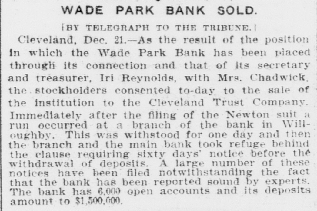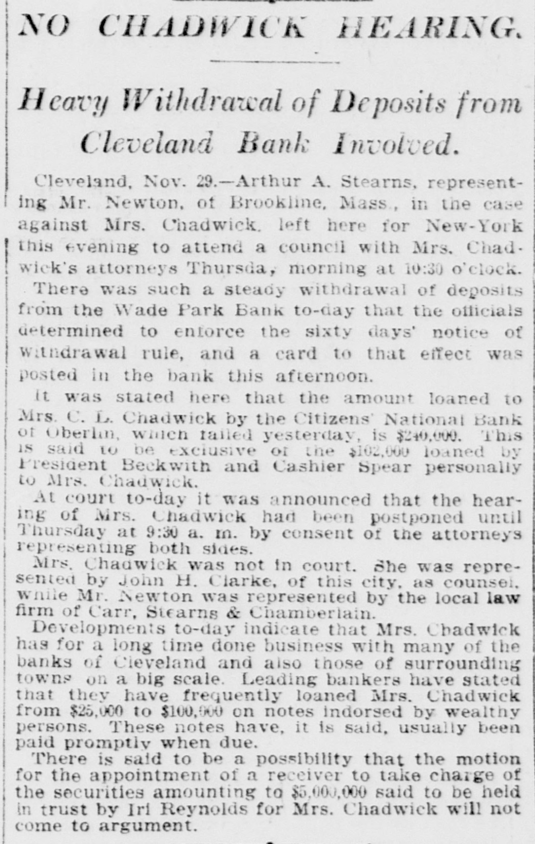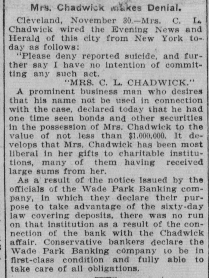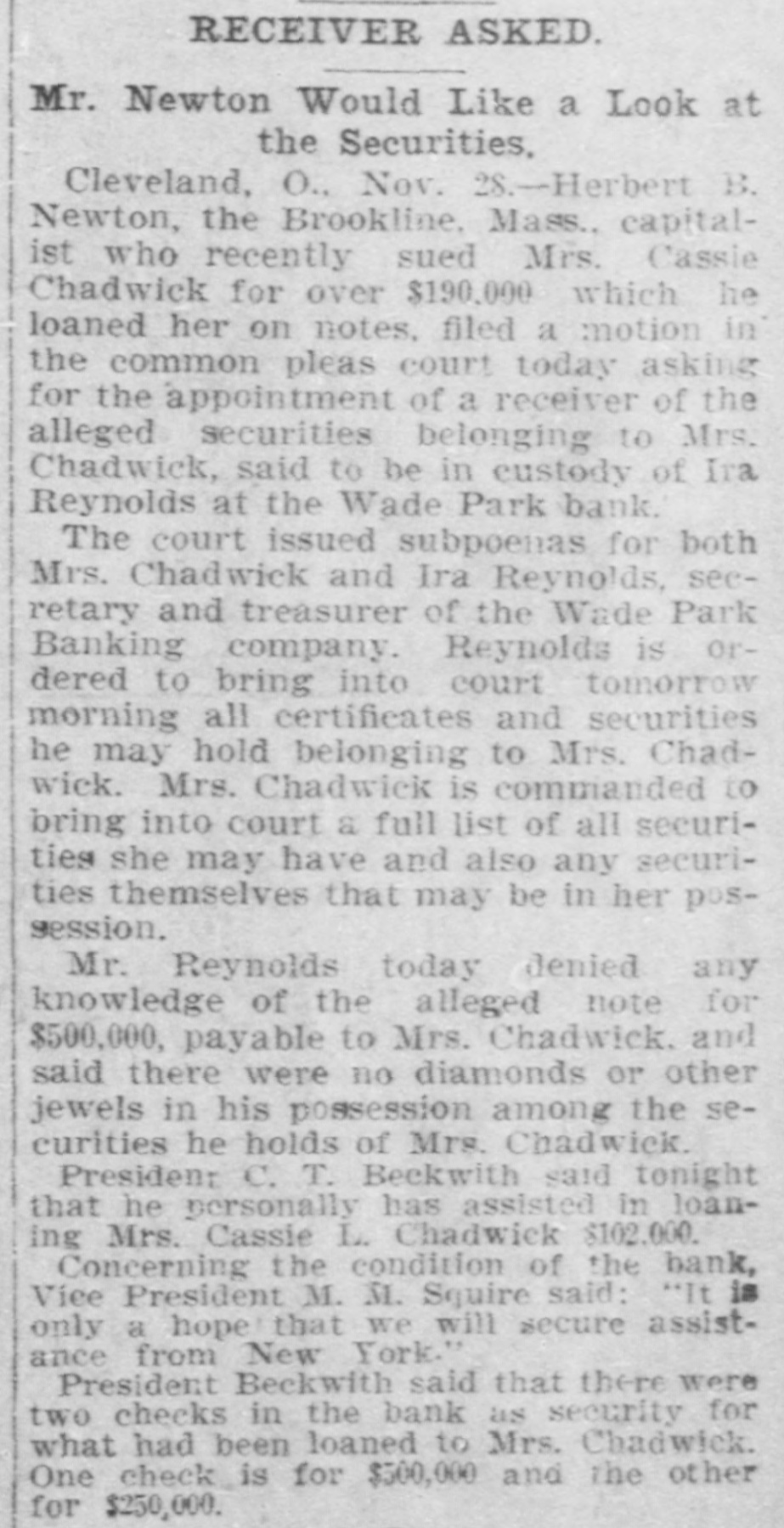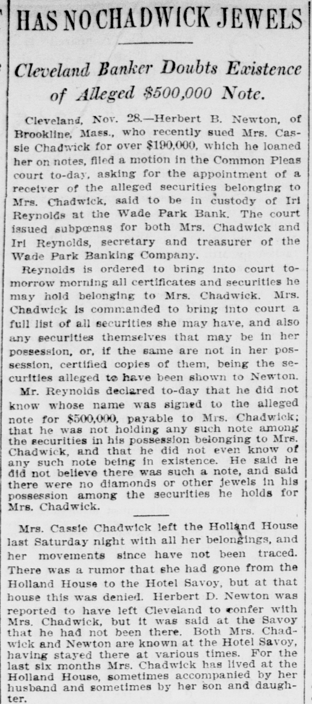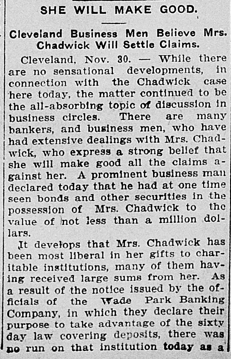 BELIEVED HER STORY THAT SHE WAS CARNEGIE'S DAUGHTER Loaned Her Thousands of Dollars-="She Has Fooled Me and Men Smarter Than I Am," He Says on the Witness Stand. At one time he said she made a By the Associated Press. written statement to his bank comCleveland, O., Dec. 12.-The trou mittee that she had over $2,000,000 in ble of Mrs. Cassie L Chadwick in bonds in a safety deposit vault in the creased at a rapid rate today, She Wiade Park bank. was twice indicted by the grand jury His Confidence Was Amazing. of Cuyohoga county, and her old time Repeated efforts on Reynolds' part friend, Iri Reynolds, took the stand o close up dealings with Mrs. Chad wick met with excuse and delay, yet in court and made evident his intenhe did not lose confidence, tion to shield and protect her no He confidently believed everything longer. would be paid, up to a week ago, and He presented a pathetic picture as had no suspicion of anything wrong he answered questions which brought intil a few days before Newton out his own implicit faith in the wo brought suit. Then his attorney, Mr. man whose financial transactions Carver, of Boston, called at the have well nigh ruined him in for Wade Park bank and said he undertune, and caused him such infinite stood he held some steel securities trouble. He gave evidence, too, that or Mrs. Chadwick's and showed him he still believes his trust was justipaper assigning all her right and fied. itle in Reynolds' holdings. Evades a Question. Paid Notes For Her. Only one query he attempted to Several notes of $10,000, each pay. evade. This was when he asked how ble to Dr. Chadwick, had been takmuch of his personal estate had pass n up by Reynolds. He declared ed into the possession of Mrs. Chad hey were payable out of any monwick. His eyes filled. and he request ys that might have been on credit ed that he be excused from answero Mrs. Chadwick in the First Nation ing. The question was not pushed d bank of Cleveland August 20. Information of the indictments Some of these were paid and in Febagainst the woman was at once uary or March, 1904, the money was wired to New York by County Prose placed to her credit in this bank. cutor Keeler, and he requested that Leynolds thought the money came Mrs. Chadwick be immediately rerom the east to pay all these, and arrested if she secured bail on the elt assured thai what he held was other charges. all right. Examination of Iri Reynolds, treas The Last Time He Saw Her. urer and secretary of the Wade Park Reynolds said the last saw Mrs. bank, before Referee Remington In Chadwick was Nov. 10. She desirthe bankruptcy court today failed to d to go East and having no money disclose any asset that might be se ie cashed a check on the Lincoln cured by Receiver Loesser, appoint Frust company. New York. It was ed by the federal court, but brought returned marked, "account closed. from Reynolds in reply to questions, le took it out of the Wade Park "she told me she was the illegitimate bank, paid it and has it in his posdaughter of Andrew Carnegie." assion. He brought the Newton debt He Believed Her Story. o her attention and advised her to Later Reynolds in detailing his to East and raise the money and settransactions with Mrs. Chadwick le the whole affair, and he thought said: "In all my transactions with he went East to see Andrew CarMrs. Chadwick I believed from what negie. "She has fooled me and many she told me that Andrew Carnegie men smarter than I am: she has was backing her and all her indebtpulled the wool over everybody' edness would be paid. a eyes," said Reynolds. Then with He then added, "and I have not faint smile. as though the humor ap had anything yet to make me doubt Sealed to him despite his troubles, it. Reynolds said he had known ne said: "Once she wrote to me to Mrs. Chadwick seven or eight years ask if I needed help because of a and Dr. Chadwick all his life. In deun on the bank. tailing how he came into possession ent Her $15,000 Across the Water. of the $5,000,000 note bearing the Reynolds also told of having C. name of Andrew Carnegie, he said: led her $15,000 when she wrote him "Mrs. Chadwick called me to her hat all her family were sick in Euhouse, I think it was March 5, 1903 ope and she was out of funds. He and said she wished to intrust to me lad seen a check for $60,000 with some securities. She said she had Andrew Carnegie's name signed to been advised to place them in the t. but did not know whether any possession of a third party, and she honey was ever procured on it. He wanted me to take care of them. estimated the woman's household fit This is the package opened last ings to be worth $20,000. He took a Friday night in the presence of Reychattel mortgage two years ago, but nolds and Attorney Stearn. t was never recorded. The package was produced in court and Reynolds identified the Carnegie SHE IS MADAME DEVERE. note, mortgage deed and copies of the alleged trust agreement. Woman Recognizes Mrs. Chadwick Continuing the witness said: "She as the Confidence Swindler. then handed me a paper to sign." "This paper the witness did not have By the Associated Press. with him, but as near as he could Portsmouth, D., Dec 12.-Mrs. remember it read: "I certify that I Charles James, widow of the late hold in trust for Mrs. Cassie L. Warden James. was intimately acChadwick securities and a note for quainte:l with Madame Devere dur$5,000,000. ing her incarceration in the Ohio He Loaned Her Money. penitentiary. and today declared posThe note was not endorsed, but he tively that Madame Devere and Mrs. had no doubt the alleged maker of Chadwick were one and the same. the note was back of the woman. He Mrs. James said: told of loaning the woman $12,000 on My heart goes out in sympathy her promise to put up United States fo the woman I knew as a good resteel bonds as collateral. She fined woman. Her character was brought to the bank the next day, he above reproach and she was overly said, a package which she said concharitable. Tho