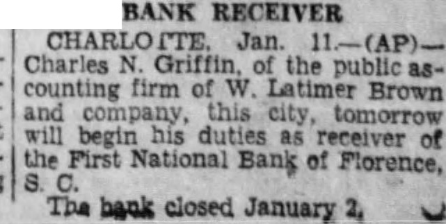 Charles Griffin... tomorrow begin duties the First National Bank of Florence, bank closed January (article dated 1932-01-12).