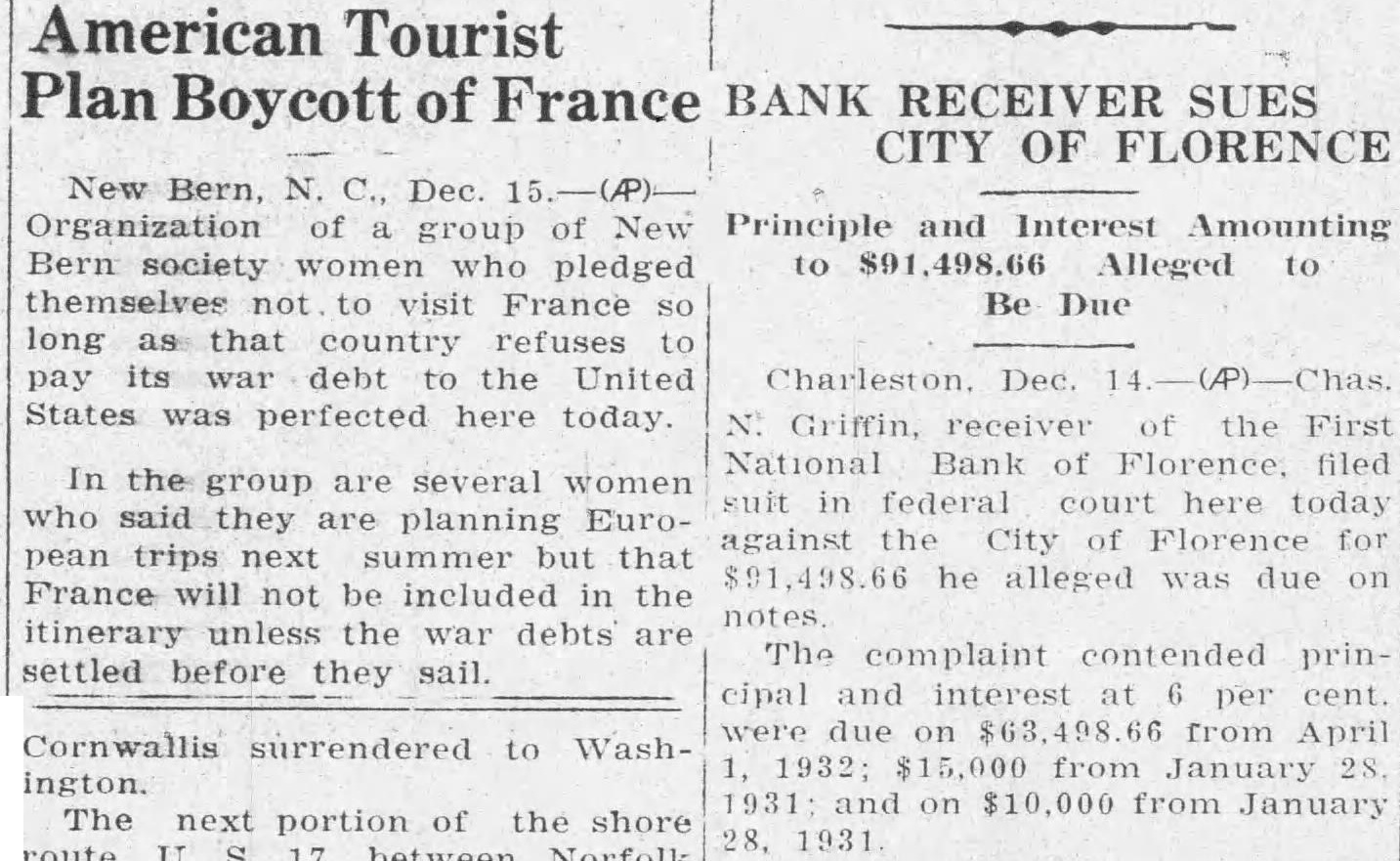 American Tourist Plan Boycott of France BANK RECEIVER SUES CITY OF FLORENCE Dec Organization group New Bern pledged themselves not to France that country refuses pay United States perfected here today. In several women they planning Eurotrips but that France not be the itinerary the debts are settled before they sail Principle and Interest Amounting to Alleged to Be Due Dec. receiver First National Bank of Florence filed federal court here today against the City he alleged due The complaint contended cipal and interest per from from January