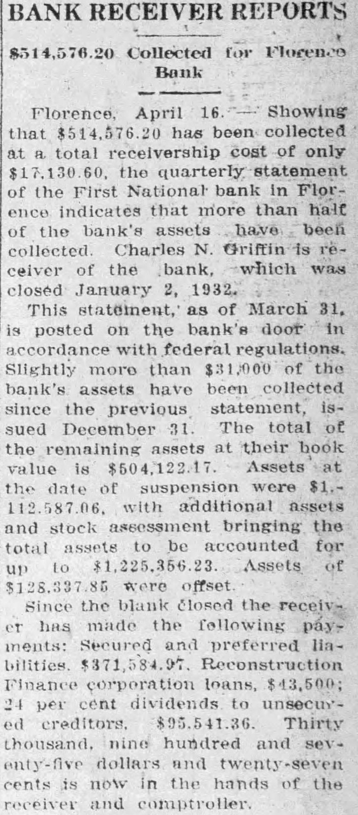 BANK RECEIVER REPORTS Collected for Florence Bank Florence April Showing that has been collected total receivership cost of only the quarterly statement of the First National bank in Florence indicates that more than half of the bank's have been N Griffin ceiver the which was closed January 1932. This statement, as of March 31, posted on the bank's door federal Slightly more than of the bank's assets have been collected since previous statement, sued December The total of the remaining assets at their book 18 Assets date suspension were with additional assets and stock assessment bringing the total be accounted for Assets of offset the blank closed the receive has made the following payments: Secured and preferred liabilities corporation loans, per dividends unsecurcreditors Thirty thousand, hundred and dollars and the hands the and