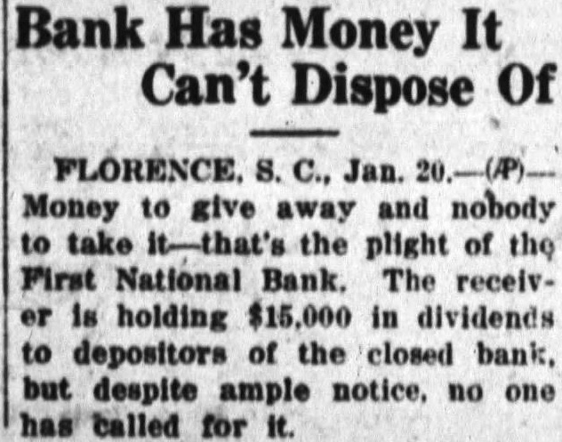 Bank Has Money It Can't Dispose Of FLORENCE. S. Jan. Money to give away and nobody to take it-that's the plight of the First National Bank. The receivor is holding $15,000 in dividends to depositors of the closed bank, but despite ample notice. no one has called for it.