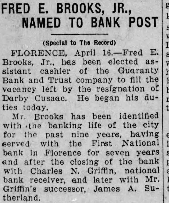 FRED E. BROOKS, JR., NAMED TO BANK POST (Special The Record) FLORENCE, April 16.-Fred E. Brooks, Jr., has been elected as sistent cashier of the Guaranty Bank and Trust company to fill the vacancy left by the resignation of Darby Cusaac. He began his duties today. Mr Brooks has been identified with the banking life of the city for the past nine years, having served with the First National bank In Florence for seven years and after the closing of the bank with Charles N. Griffin, national bank receiver, and later with Mr. Griffin's successor, James A. Sutherland.