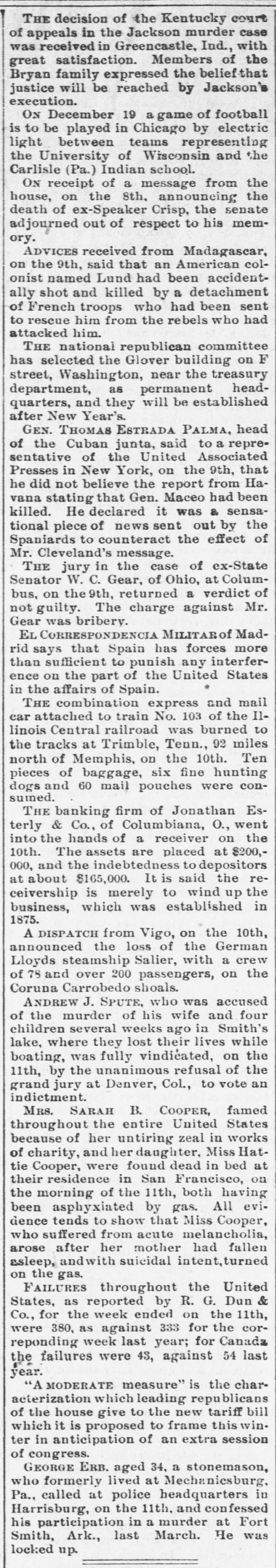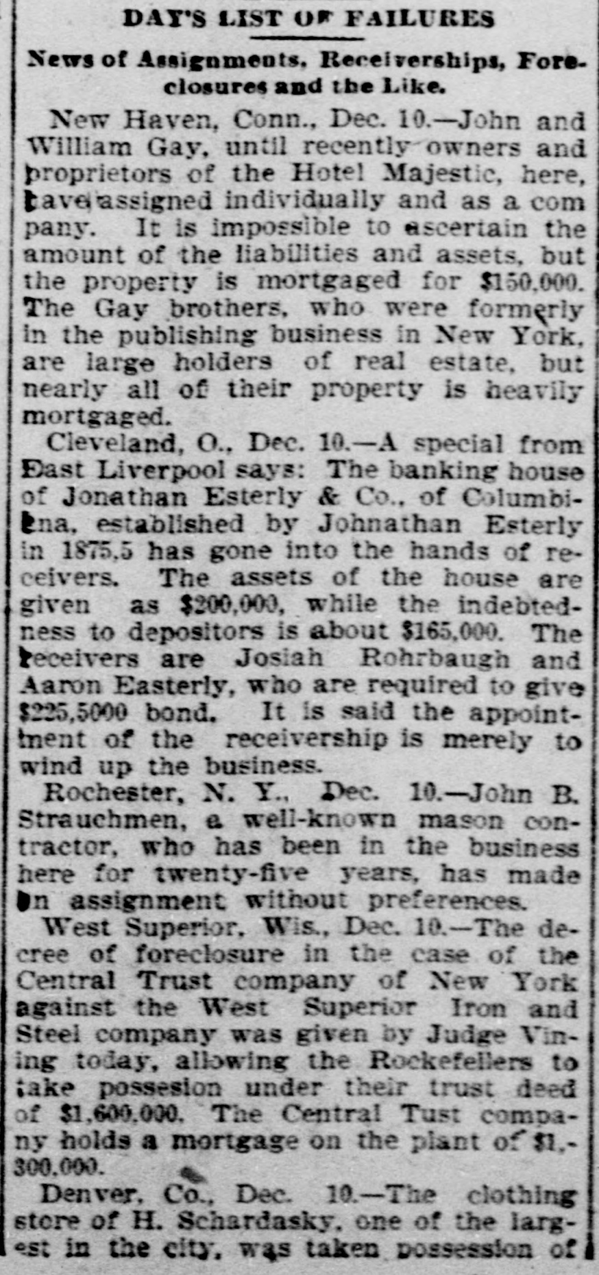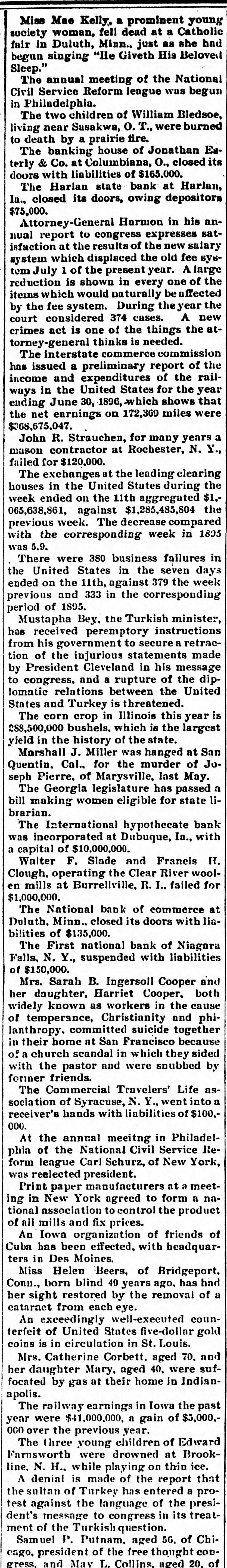 MINING STOCKS. Bulwer $0 38 Ontario $7 00 Cholor 90 80 Ophir Crown Point 17 20 Plymouth 00 Con. Cal. & Va 1 1 00 Quicksilver Deadwood 1 35 1 do pfd 25 35 Gould & Curry Sierra Nevada Hale & Norcross 85 Standard 3 50 Homestake 33 00 30 Union Con Iron Silver 25 Yellow Jacket 20 Mexican 35 WALL STREET TALK. The stock exchange will be closed on Dec. 26, the Saturday following Christmas day, but will be open on Saturday, Jan. 2, owing to the large financial settlements due on Jan. 1. One of the developments in the market was the sale of Long Island stock at a considerable decline, which may be referred to the death of Mr. Corbin, who for years had conducted the company, as a one man affair. Well advised people at Washington do not attach any importance to the rumors about the U. P. funding bill. It is pointed out that while such a measure might pass the house its case it would be a hopeless one in the senate. A leader in Wall street is the necessity of the hour and nobody seems willing to come forward and encourage largely on the bull or bear side of the list. St. Paul earnings show loss of nearly $114,000 for the first week of December. BANKS ABROAD. BERLIN, Dec. 10-The weekly statement of the Imperial Bank of Germany shows the following changes as compared with the previous account: Cash in hand, decrease, 2,140,000 marks; treasury notes, increase, 200,000; other securities, decrease, 333,500,000; notes in circulation, decrease, 23,840,000. London, Dec. 10.-The weekly statement of the Bank of England shows the following changes as compared with the previous account: Total reserve, increase, £393,000; circulation, decrease, £286,000; bullion, increase, £106,504; other securities, increase, £98,000; other deposits, decrease, £22,000; public deposits, increase, £465,000; notes reserve, increase, £505,000; government securities unchanged. The proportion of the Bank of England's reserve to liability, which last week was 53.81 per cent, is now 54.9 per cent. FOREIGN FINANCIAL. NEW YORK, Dec. 10.-Evening Post's London financial cablegram: The stock market opened dull today, but closed better all around with the bears covering. Business was quiet, with a good undertone. The rise in money rates has little effect, because it is usual at the end of the year. The rise in Indian exchange is closely watched, and council bills sold today as high as 1.3 13-32. Brazil bonds continue to rise. It is reported that today's withdrawals from the Bank of England for Egypt forms a part of this £500,000 to be paid to the British government in return for the advance made by the Egyptian government for Soudan expedition, but I believe that such It not the case. It is probably an ordinary transaction. The Paris and Berlin markets were firm. There was a better tone in Paris, where each month successfully passed should mean & safer financial position, which is by no means clear yet. BANKING HOUSE QUITS. CLEVELAND. Dec. 10.-he banking house of Jonathan Esterly & Co., of Columbiana, has gone into the hands of receivers. The assets of the house are given as $200,000, while the indebtedness to depositors is about $165,000. The receivers are required to give $225,000 bond. It is said the appointment of the receivers is merely to wind up the business. NEW YORK MONEY. NEW YORK. Dec. 10.-Money on call, 1½ 2 per cent; last loan, 1½; closed, 1½@2. Prime mercantile paper, 4@5. Sterling exchange steady, with actual business in bankers' bills at $4.861/2@4.86% for demand and $4.83% for sixty days. Posted rates, ..84@4.84½ and $4.87@4.87½. Comercial bills, $4.821/2. Silver certificates, 65%@65%c. Bar silver, 651/4c. CLOTHING STORE CLOSED. DENVER, Dec. 10.-The clothing store of H. Schradsky, one of the largest in the city, was attached today by Kahn & Co., of Chicago, for a claim of $6,400. No statement of assets and liabilities has been given, but the stocks are estimated at $50,000 to $75,000 and are claimed to be for in excess of liabilities. BANK CLEARINGS. St. Paul-$752,534.68. Minneapolis-$1,849,284.07; for the week, $10,691,960.70. New York-Clearings, $97,340,475; balances, $6,771,068. Boston-Clearings, $14,242,179; balances, $1,533,328. NOT MUCH CASH. TOPEKA, Kan., Dec. 10.-An examination of the assets of the recently failed Baxter Springs bank, of which Col. Alexander Warner was president, reveals but $29.36 in cash on hand. The capital stock of the bank was $65,000. TREASURY STATEMENT. WASHINGTON, Dec. 10.-Today's statement of the condition of the treasury shows: Available cash balances, $225,976,442; gold reserve, $133,086,990. BOMBAY RATE RAISED. BOMBAY, Dec. 10.-The Bank of Bombay has increased its rate of discount from 8 to 9 per cent. CHICAGO MONEY. CHICAGO, Dec. 10.-Money steady, unchanged. New York exchange, 40c premium. Foreign exchange firm; demand, $4.86%; sixty days, $4.83%. LONDON RATE UNCHANGED. LONDON, Dec. 10.-The Bank of England's rate of discount remains unchanged at 4 per cent.