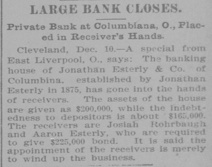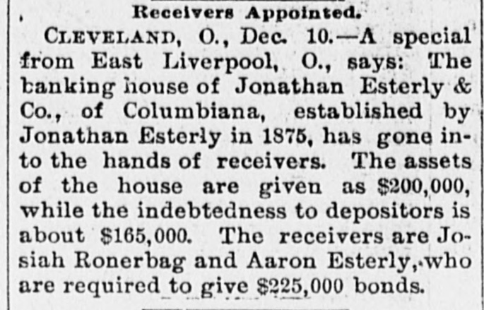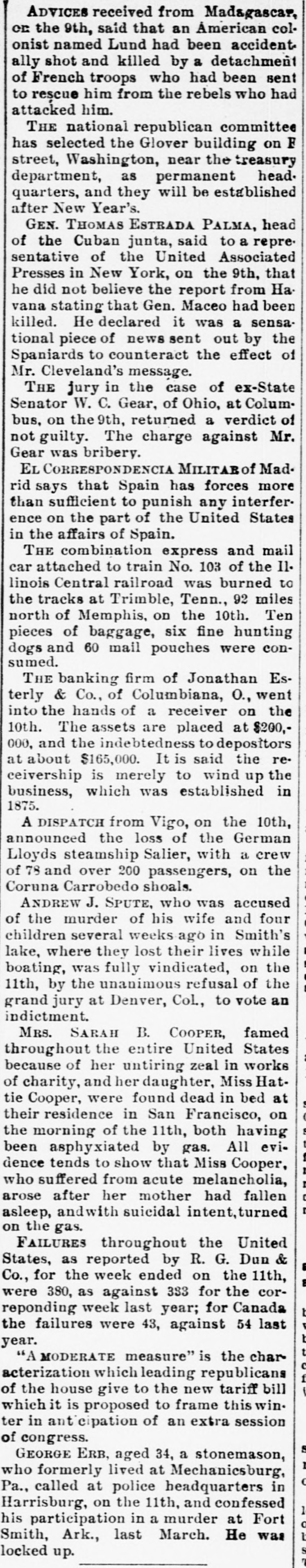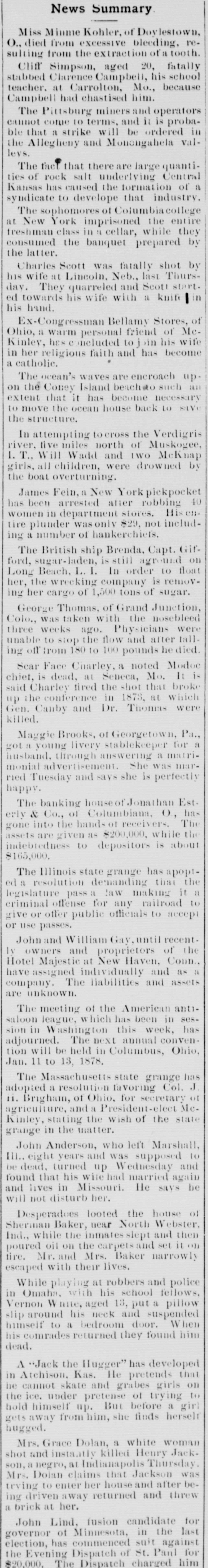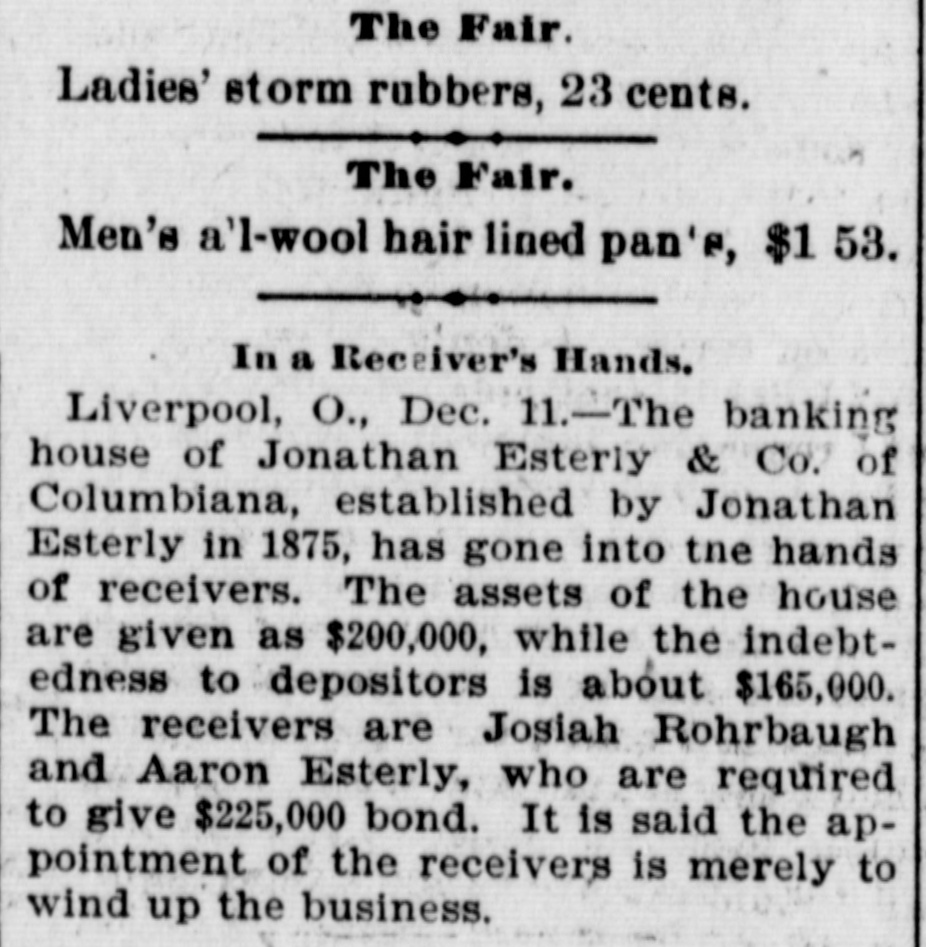 MINING STOCKS. Bulwer $0 38 Ontario $7 00 Cholor 90 80 Ophir Crown Point 17 20 Plymouth 00 Con. Cal. & Va 1 1 00 Quicksilver Deadwood 1 35 1 do pfd 25 35 Gould & Curry Sierra Nevada Hale & Norcross 85 Standard 3 50 Homestake 33 00 30 Union Con Iron Silver 25 Yellow Jacket 20 Mexican 35 WALL STREET TALK. The stock exchange will be closed on Dec. 26, the Saturday following Christmas day, but will be open on Saturday, Jan. 2, owing to the large financial settlements due on Jan. 1. One of the developments in the market was the sale of Long Island stock at a considerable decline, which may be referred to the death of Mr. Corbin, who for years had conducted the company, as a one man affair. Well advised people at Washington do not attach any importance to the rumors about the U. P. funding bill. It is pointed out that while such a measure might pass the house its case it would be a hopeless one in the senate. A leader in Wall street is the necessity of the hour and nobody seems willing to come forward and encourage largely on the bull or bear side of the list. St. Paul earnings show loss of nearly $114,000 for the first week of December. BANKS ABROAD. BERLIN, Dec. 10-The weekly statement of the Imperial Bank of Germany shows the following changes as compared with the previous account: Cash in hand, decrease, 2,140,000 marks; treasury notes, increase, 200,000; other securities, decrease, 333,500,000; notes in circulation, decrease, 23,840,000. London, Dec. 10.-The weekly statement of the Bank of England shows the following changes as compared with the previous account: Total reserve, increase, £393,000; circulation, decrease, £286,000; bullion, increase, £106,504; other securities, increase, £98,000; other deposits, decrease, £22,000; public deposits, increase, £465,000; notes reserve, increase, £505,000; government securities unchanged. The proportion of the Bank of England's reserve to liability, which last week was 53.81 per cent, is now 54.9 per cent. FOREIGN FINANCIAL. NEW YORK, Dec. 10.-Evening Post's London financial cablegram: The stock market opened dull today, but closed better all around with the bears covering. Business was quiet, with a good undertone. The rise in money rates has little effect, because it is usual at the end of the year. The rise in Indian exchange is closely watched, and council bills sold today as high as 1.3 13-32. Brazil bonds continue to rise. It is reported that today's withdrawals from the Bank of England for Egypt forms a part of this £500,000 to be paid to the British government in return for the advance made by the Egyptian government for Soudan expedition, but I believe that such It not the case. It is probably an ordinary transaction. The Paris and Berlin markets were firm. There was a better tone in Paris, where each month successfully passed should mean & safer financial position, which is by no means clear yet. BANKING HOUSE QUITS. CLEVELAND. Dec. 10.-he banking house of Jonathan Esterly & Co., of Columbiana, has gone into the hands of receivers. The assets of the house are given as $200,000, while the indebtedness to depositors is about $165,000. The receivers are required to give $225,000 bond. It is said the appointment of the receivers is merely to wind up the business. NEW YORK MONEY. NEW YORK. Dec. 10.-Money on call, 1½ 2 per cent; last loan, 1½; closed, 1½@2. Prime mercantile paper, 4@5. Sterling exchange steady, with actual business in bankers' bills at $4.861/2@4.86% for demand and $4.83% for sixty days. Posted rates, ..84@4.84½ and $4.87@4.87½. Comercial bills, $4.821/2. Silver certificates, 65%@65%c. Bar silver, 651/4c. CLOTHING STORE CLOSED. DENVER, Dec. 10.-The clothing store of H. Schradsky, one of the largest in the city, was attached today by Kahn & Co., of Chicago, for a claim of $6,400. No statement of assets and liabilities has been given, but the stocks are estimated at $50,000 to $75,000 and are claimed to be for in excess of liabilities. BANK CLEARINGS. St. Paul-$752,534.68. Minneapolis-$1,849,284.07; for the week, $10,691,960.70. New York-Clearings, $97,340,475; balances, $6,771,068. Boston-Clearings, $14,242,179; balances, $1,533,328. NOT MUCH CASH. TOPEKA, Kan., Dec. 10.-An examination of the assets of the recently failed Baxter Springs bank, of which Col. Alexander Warner was president, reveals but $29.36 in cash on hand. The capital stock of the bank was $65,000. TREASURY STATEMENT. WASHINGTON, Dec. 10.-Today's statement of the condition of the treasury shows: Available cash balances, $225,976,442; gold reserve, $133,086,990. BOMBAY RATE RAISED. BOMBAY, Dec. 10.-The Bank of Bombay has increased its rate of discount from 8 to 9 per cent. CHICAGO MONEY. CHICAGO, Dec. 10.-Money steady, unchanged. New York exchange, 40c premium. Foreign exchange firm; demand, $4.86%; sixty days, $4.83%. LONDON RATE UNCHANGED. LONDON, Dec. 10.-The Bank of England's rate of discount remains unchanged at 4 per cent.