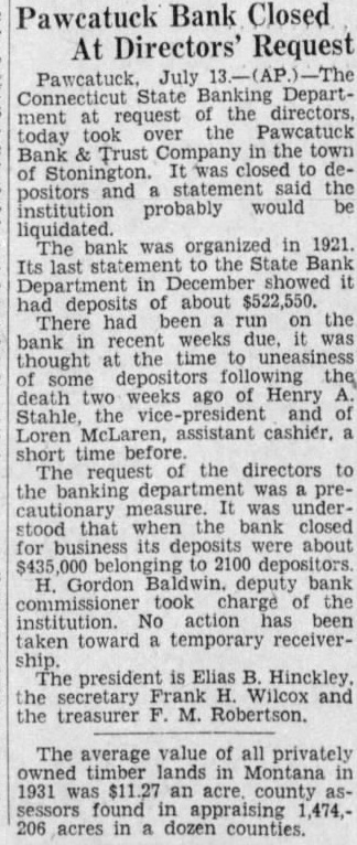Stonington Sets Up Reserve Of $58,965 to Equal Funds in Closed Bank at Pawcatuck