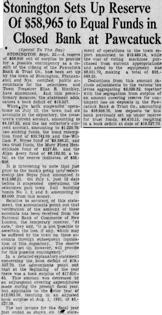 (Special To The Day) STONINGTON Sept. reserve of $58,956 out of surplus to provide for possible as result of the closing of the Pawcatuck Bank & Trust Co., has been set up by the of Stonington, Pfannensteil and Nye, certified public acand Town Treasurer Elias B. Hinckley, have announced. And this precautionary measure, the statement adds, causes book deficit of $19,527 When, the bank suspended operations on July 13. the had six in the depository the treasurer's to and the tax collector's rent to 220 two sinking funds, the bond redemption fund of $35,742 09 and the 1:am F. Noyes fund of $9 and two trust funds, the Mary Floyd Hendrickson fund $227 and the Allen Avery fund of toas the reserve indicates, of $58, 956 It is Interesting to note that just prior to the bank's going into receivership the Noyes fund amounted On July just 12 days before it the selectmen paid town hall building bonds No. and 3. amounting to Relative to accuracy of this statement. the point out that verification of the amount of these accounts has been received from the National Bank of Commerce of New London, the receiver. "At date," they add. "it not 'possible to ascertain the loss, if any, which may be suffered by the town on these accounts through liquidation of this depository. The reserve already set up. however, will provide for this possible contingency In detailed explanatory statement concerning the book deficit of 819.527.70 the accountants point out that at the beginning of the year there was book of $17,610. 45. This amount was decreased by an adjustment covering expenditures made during the present fiscal year but applicable to the orior year of 083 resulting in an adjusted book surplus at Aug. 1, 1931, of 85,The net income for the fiscal year just ended as shown on the state- ment of operations in the town report amounted to $19,489.1 the cost of voting machines purchased appropriations and added to the equipment was $8,031 70, making total of $33,048.23. Deductions from this amount include adjustments to the various tax levies aggregating 029 together with the segregation from of an amount covering reserve for contingent loss on deposits in the Pawcatuck Bank & Trust Co., amounting to $58,956.76 less deposits in this bank previously set up under reserve for trust funds resulting in book deficit at date of $19