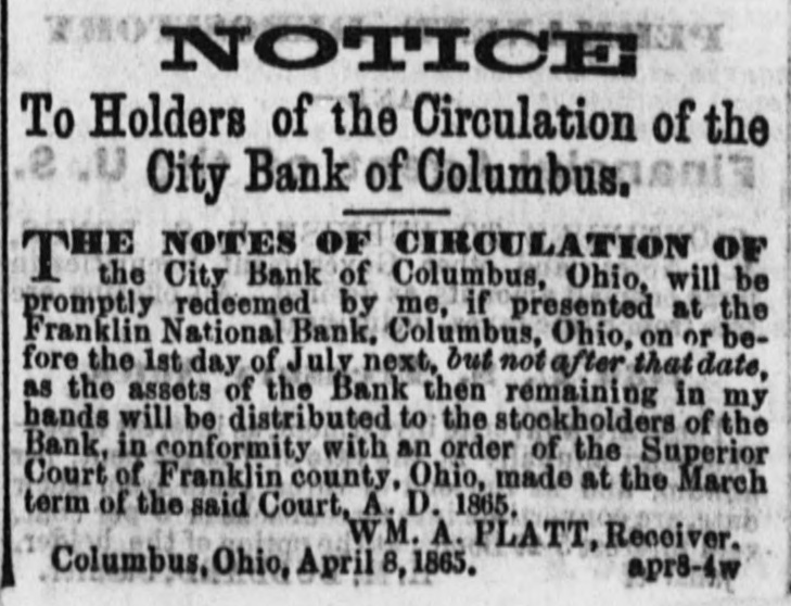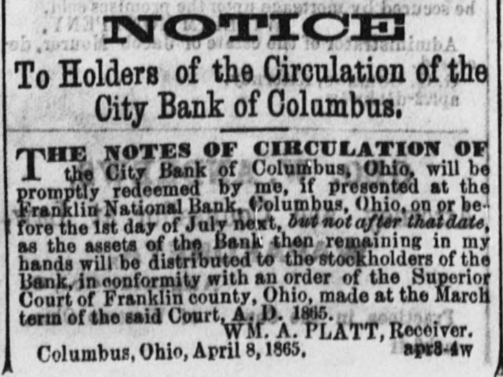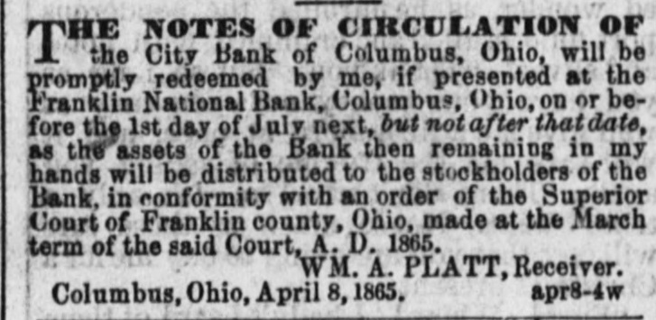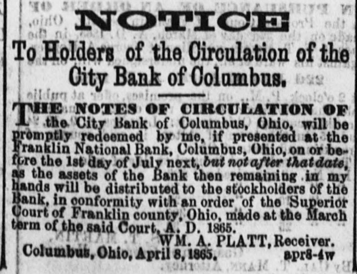 New Advertisements. NOTICE To Holders of the Circulation of the City Bank of Columbus. THE NOTES OF CIRCULATION OF City Bank of Columbus, Ohio, will be promptly redeemed by me, if presented at the Franklin National Bank, Columbus, Ohio, on or before the 1st day of July next, but not after that date, as the assets of the Bank then remaining in my hands will be distributed to the stockholders of the Bank, in conformity with an order of the Superior Court of Franklin county, Ohio, made at the March term of the said Court, A. D. 1865. WM. A. PLATT, Receiver. Columbus, Ohio, April 8, 1865. apr8-4w