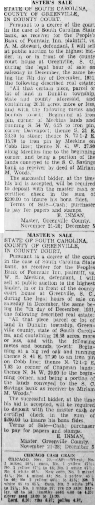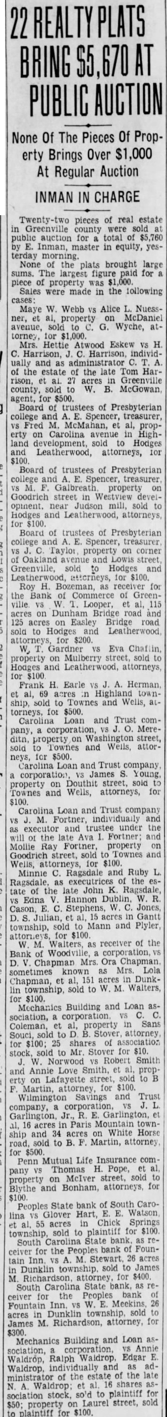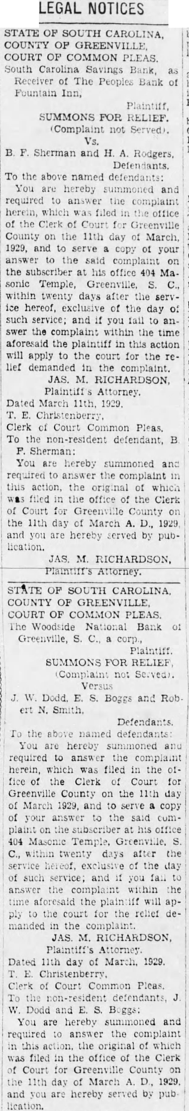 LEGAL NOTICE. STATE SOUTH CAROLINA, COUNTY OF GREENVILLE COURT OF COMMON PLEAS W. D. PLAINTIFF W A. Wallace. B. Martin and 11. K. Townes as Trustees for Realty and Investment Co., W. D. Workman. Maud Harrison, Admix, Cyclone Fence Co., Curran B. Earle. Citizens Lumber Company. Alester G Furman C. Good, M Richardson. Individually and Attorney, South Carolina Savings Bank Receiver for People's Bank of Fountain Inn, S. C., F. C. Zaglin, Camp. bell Tile and Mantel Huntington & Guerry, F. J. Coolidge & Sons, Margaret M. Strader. Henry McGee. Annie M. Beaty, R. R. Griffin. Wm. Goldsmith as and Trustee for Greenville Community Hotel Corp. John Russell F. G. Mauldin, American Bank Trust Co., American Building Loan Asso, Jas. West. Defendants SUMMONS FOR RELIEF (Complaint served) TO THE DEFENDANTS ABOVE NAMED: You are hereby summoned and required to answer the complaint in this action. of which copy herewith served you. and to ser copy of your answer to the said complaint the subscriber his office. Chamber of Commerce Building. Greenville, South Carolina within twenty days after the serv. ice hereof. exclusive of the day of such service; and you fail to answer the complaint within the time aforesaid, the plaintiff in this action will apply to the Court for the relief demanded in the complaint within the time afresaid, the plaintiff in this action will apply to the Court for the relief demanded in complaint. Dated Feb. 2nd, 1927 WYATT AIKEN. Attorney for Plaintiff HARRY A DARGAN. Clerk C. To the non-resident defendant: W. Wallace. Take notice that the complaint in this action, together with the summons, of which the foregoing is a copy, was filed in the office of the Clerk of Court Common Pleas and General Sessions for the County of Greenville, at Greenville, S. C., this 3rd day of February, 1927. WYATT AIKEN, Attorney for Plaintiff STATE SOUTH CAROLINA, COUNTY GREENVILLE COURT OF COMMON PLEAS Maye W. Webb, Plaintiff against C. O. Hobbs, W. Wallace, H. B. Bates, Southern Motor Company, F. B. Lynch, Palmetto National Bank. Wyatt Aiken, individually and as Trustee of the bankrupt estate of H. B. Bates, Defendants. To the Defendants above named: You are hereby summoned and required to answer the complaint in this action, which filed in the of. fice of the Clerk Court of Common Pleas for Greenville County. and to serve copy of your answer to the said complaint on the subscriber at his office Masonic Temple, Greenville, S. C., within twenty days after the service hereof, exclusive of the day of such service: and if you fail to answer the complaint within the time aforesaid, the plaintiff-in this action will apply to the Court for the relief demanded in the complaint. M. BLYTHE Attorney for Plaintiff. Dated February 2. 1927. To Absent Defendants, W. Wallace and F. Lynch: YOU WILL PEASE TAKE NOTICE That the Summons and Complaint the above entitled were filed in the office of the Clerk of Court of Pleas for Greenville County on February 3, 1922. E. M. BLYTHE, Attorney for Plaintiff February 1927. MASTER'S SALE STATE OF SOUTH CAROLINA, COUNTY OF GREENVILLE, COURT OF COMMON PLEAS Pursuant to an Order of the Court in the case of W. Norwood, Plaintiff, T. R. Allen, and E. P. Riley, as Trustee in Bankruptcy for T. R. Allen, Bankrupt, Defendant, will sell at public auction to the highest bidder, in or in front of the County Court House Greenville, S. C., during the legal hours of sale on salesday in February. the same be ing the 7th day of February, 1927. the following described real estate: "All that piece, parcel or lot of land in Austin Township, Greenville County, State of South Carolina, in the Town of Mauldin, described as follows: Beginning at an iron pin at the of Greenville and Laurens Road and Jenkins Street, and runaing thence along Jenkins Street 144 feet. more less to iron pin, corner of lot now or formerly belonging to Maude Swicewood, 156 feet, hore less, to an iron pin on line of property of Frank Schaver thence with the line of the said Frank Schaver 144 feet, more or less, the Greenville and Laurens Road; thence down the Greenville and Laurens Road 156 feet, more or less, to the beginning corner, being the property conveyed to T. R. Allen by R. E. Griffin." Terms of sale, cash; purchaser to pay for papers and stamps. INMAN, Master, Greenville County. January 21, 28; February 4.