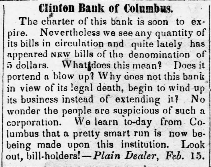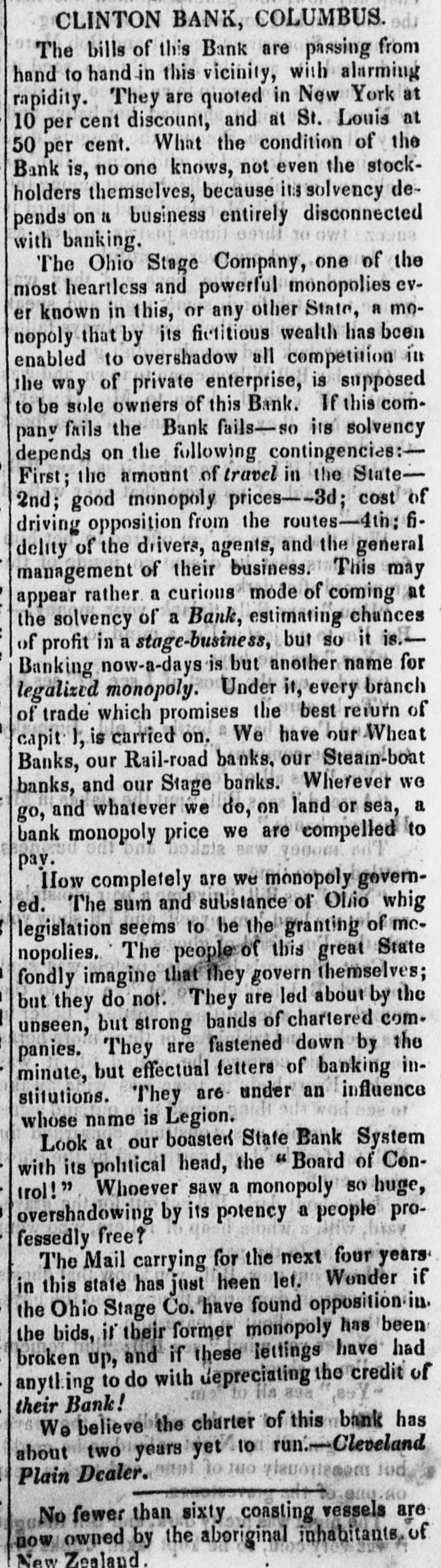 CLINTON BANK, COLUMBUS The bills of this Bank are passing from hand to hand in this vicinity, with alarming rapidity. They are quoted in New York at cent at at 50 cent. 10 per per discount, What the and condition St. Louis of the Bank is, no one knows, not even the stockholders themselves, because its solvency depends on a business entirely disconnected with banking. The Ohio Stage Company, one of the most heartless and powerful monopolies ever known in this, or any other State, a mnnopoly that by its fictitious wealth has been enabled to overshadow all competition in the way of private enterprise, is supposed to be sole owners of this Bank. If this company fails the Bank fails-so its solvency depends on the following contingencies:First; the amount of travel in the State2nd; good monopoly prices--3d; cost of driving opposition from the routes-4th: fidelity of the drivers, agents, and the general management of their business. This may appear rather a curious mode of coming at the solvency of a Bank, estimating chances of profit in a stage-business, but so it is.name every trade legalized of Banking which now-a-days monopoly. promises is Under but the another it, best return branch for of capit I, is carried on. We have our Wheat Banks, our Rail-road banks, our Steam-boat banks, and our Stage banks. Wherever we go, and whatever we do, on land or sea, a bank monopoly price we are compelled to pay. How completely are We monopoly governed. The sum and substance of Oliio whig legislation seems to be the granting of mcnopolies. The people of this great State fondly imagine that they govern themselves; but they do not. They are led about by the unseen, but strong bands of chartered companies. They are fastened down by the minate, but effectual fetters of banking institutions. They are under an influence whose name is Legion. Look at our boasted State Bank System with its political head, the "Board of Control!" Whoever saw a monopoly so huge, overshadowing by its potency a people professedly free? The Mail carrying for the next four years in this state has just heen let. Wonder if the Ohio Stage Co. have found opposition in. the bids, if their former monopoly has been broken up, and if these lettings have had anything to do with depreciating the credit of their Bank! We believe the charter of this bank has about two years yet to run.-Cleveland Plain Dealer. 300 No fewer than sixty coasting vessels are now owned by the aboriginal inhabitants, of New Zealand.