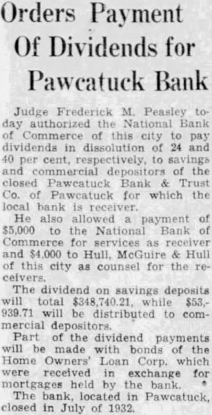 Orders Payment Of Dividends for Paweatuck Bank Judge Frederick M. Peasley to day authorized the National Bank of Commerce of this city pay dividends in dissolution of 24 and 40 per cent, respectively, to savings and commercial depositors of the closed Pawcatuck Bank & Trust Co. of Pawcatuck for which the local bank is receiver. He also allowed payment of $5,000 to the National Bank of Commerce for services as receiver and $4,000 to Hull, McGuire & Hull of this city as counsel for the reThe dividend on savings deposits will total $348,740.21 while $53,939.71 be distributed to commercial depositors. Part of the dividend payments will be made with bonds of the Home Owners' Loan Corp. which were received in exchange for mortgages held by the bank. The bank, located in Pawcatuck, closed in July of 1932.