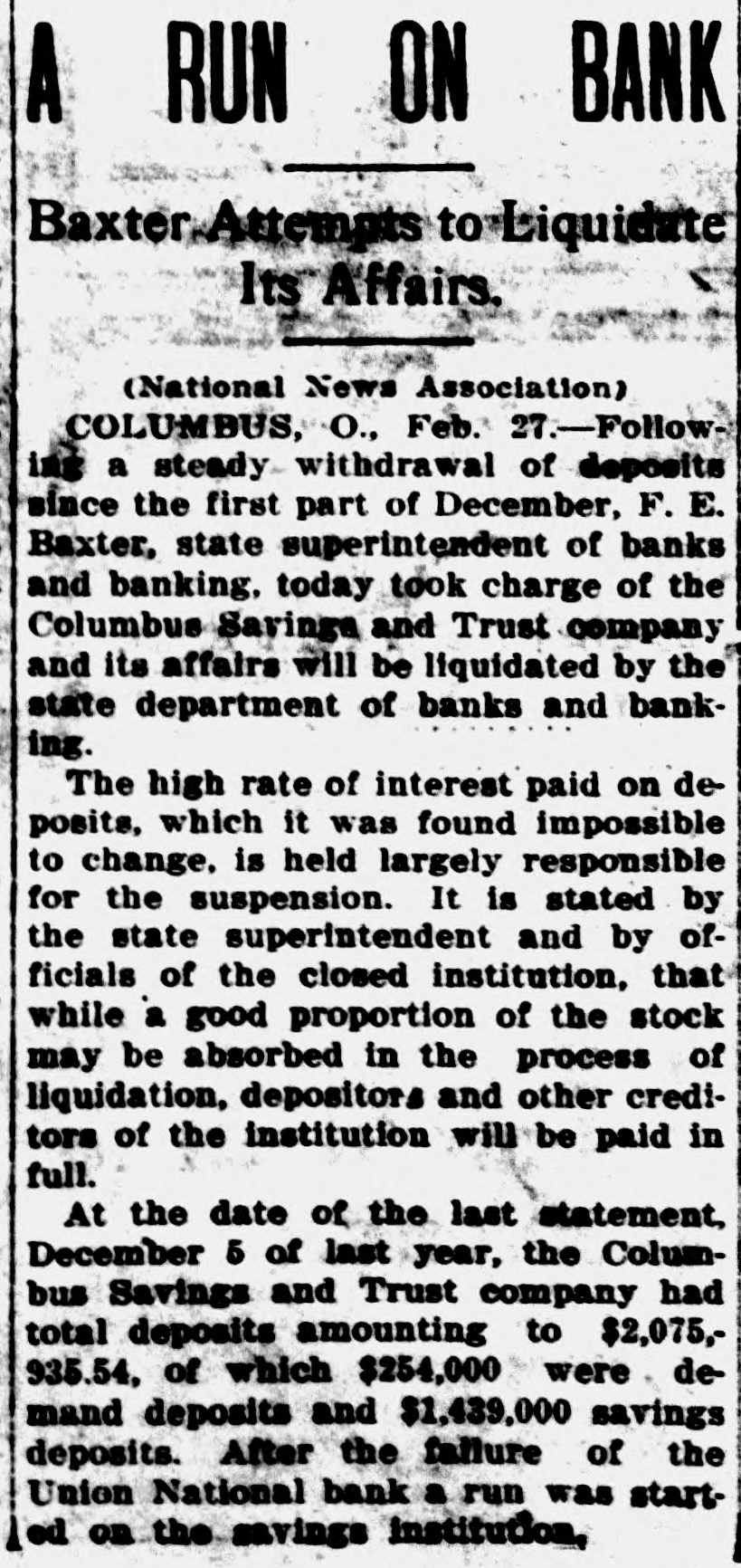 BANK ON RUN Baxter Attempts to-Liquidate Its Affairs. (National News Association) COLUMBUS, O., Feb. 27.-Following a steady withdrawal of deposits since the first part of December, F. E. Baxter, state superintendent of banks and banking, today took charge of the Columbus Savings and Trust company and its affairs will be liquidated by the state department of banks and banking. The high rate of interest paid on deposits, which it was found impossible to change. is held largely responsible for the suspension. It is stated by the state superintendent and by officials of the closed institution, that while a good proportion of the stock may be absorbed in the process of liquidation, depositors and other creditors of the institution will be paid in full. At the date of the last statement, December 5 of last year, the Columbus Savings and Trust company had total deposits amounting to $2,075,935.54, of which $254,000 were demand deposits and $1,439,000 savings deposits. After the failure of the Union National bank a run was started on the savings Institution,