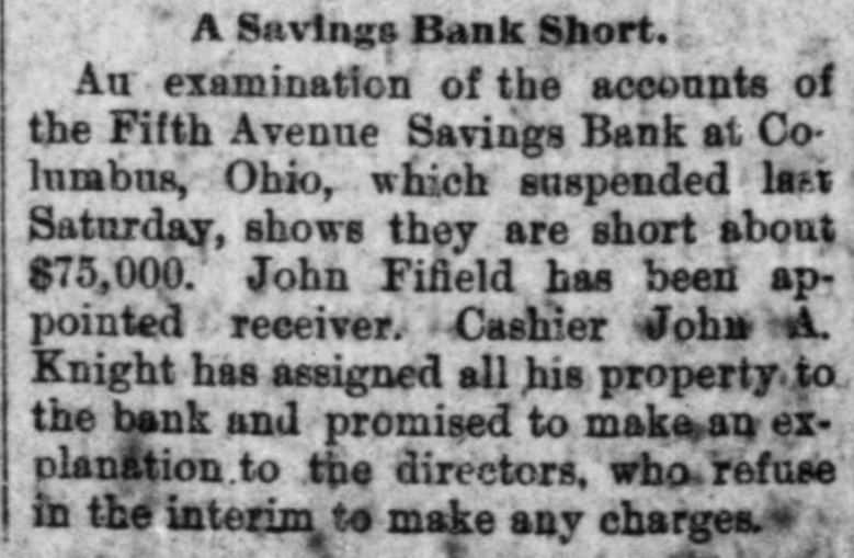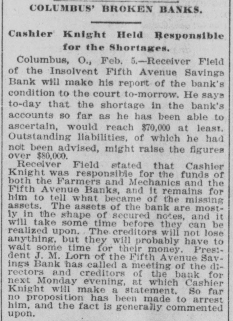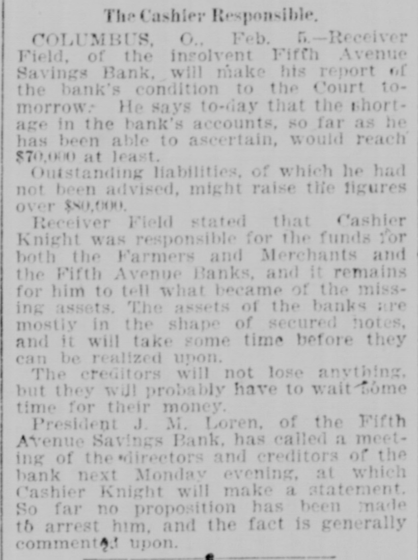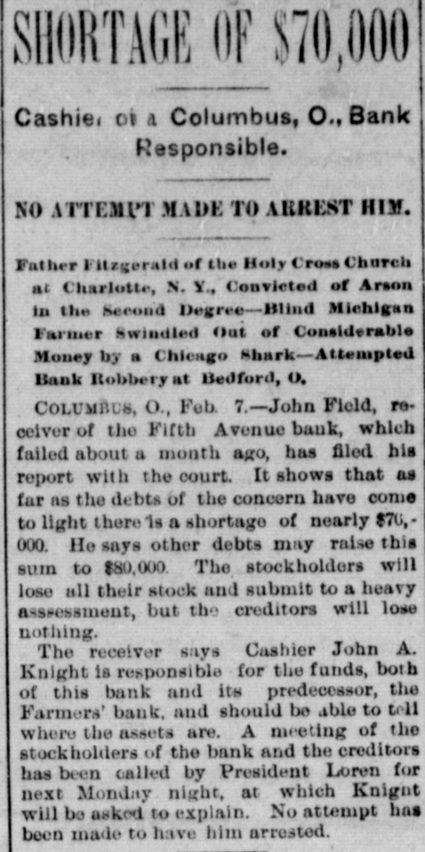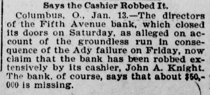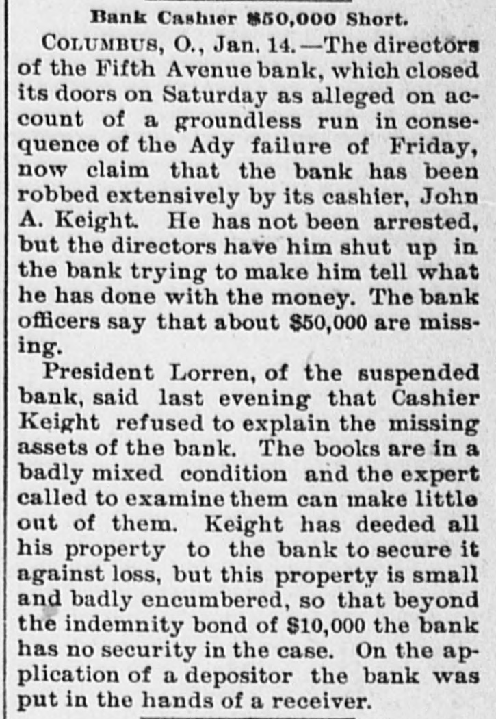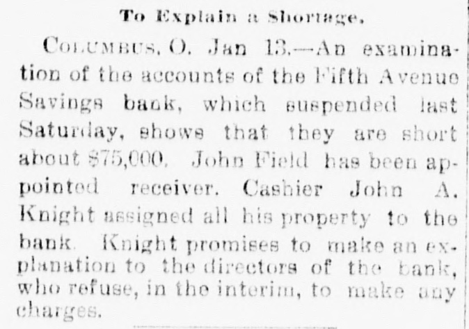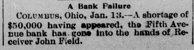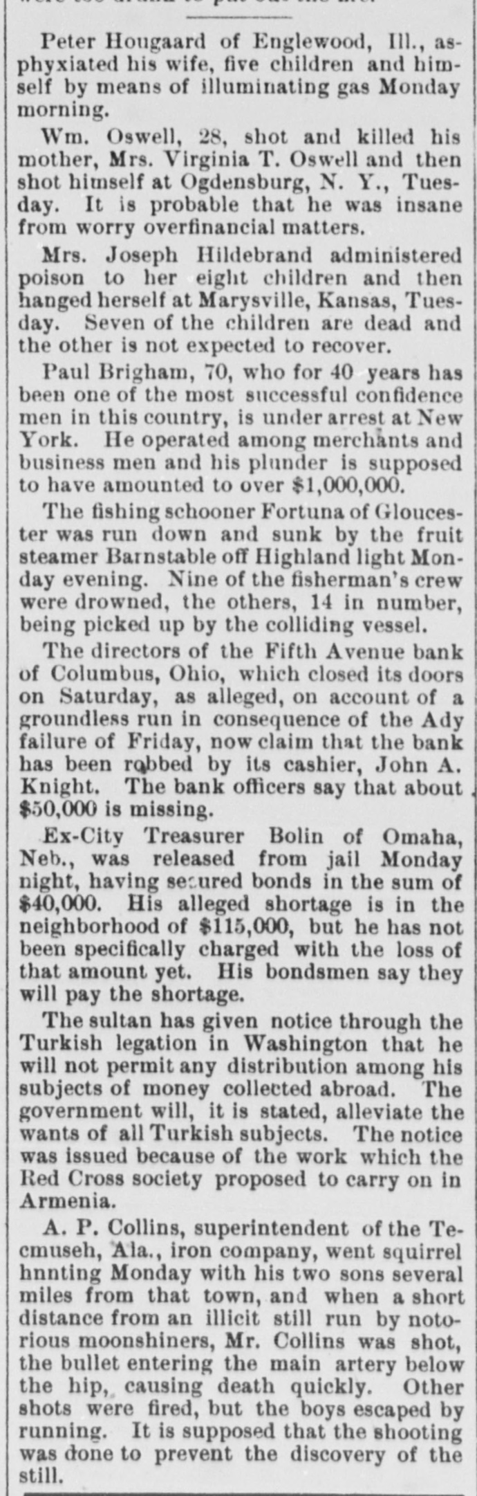 ABBREVIATED TELEGRAMS. R. Lynn Minton, editor of the Anna (Ills.) Talk, is dead as the result of a blow with a chair given by his foreman, James T. Moreland, during a quarrel Dec. 20 last. Moreland is under arrest. The house of James L. Kernochan at Hempstead, L I., was entered by burglars and property to the value of about $5,000 was stolen. The stolen property included two large and two small silver polo prize cups and other silverware. John Smith died at his home near Jonesboro, III., at the advanced age of 105 years. Bud Moore, colored, shot and instantly killed his wife at their home in Charleston, Mo. Moore used an old musket and tore one side of his wife's face off. H. R. Green, son of Hetty Green, the New York multi-millionairess, is one of the Reed delegates chosen by the Sixth Texas district Republicans to the national convention. The "Parisian," a department store at St. Louis, has been destroyed by fire. Loss, $150,000. "Frankie" Nelson won a six-days' women's bike race at New York, making 418 miles, 8 laps. Helen Baldwin was just five lengths behind. Nelson Mills' large saw mill at Marysville, five miles south of Port Huron, Mich., burned. Loss estimated at $75,000 to $100,000, inciuding a large quantity of lumber. Miss Nina Van Zandt that was, later Mrs. (proxy) Spics, and still later Mrs. S. S. Malato, announces that she is going on the lecture platform to make a living. The window glass works controlled by the Pittsburg and Indiana combinations have shut down for a month, with a prospect of a staike when they resume work. The venerable Iowa jurist, Judge George G. Wright, died Saturday morning from an apoplectic stroke, aged 76 years. The jury in the case of Jacob S. Johnson, a colored ex-preacher on trial at Somersville, N. J., for the murder of Annie F. Rogers. rendered a verdict of murder in the first degree. The Exchange bank at Greeley Centre, Neb., has closed. Nobody loses much, as the liabilities are only $10,000. The blind, sash and moulding mill of Ringger & Friedberger, Hoboken, N. J., burned. Loss, $70,000. Chris Smith's fine race mare Maid Marion, holder of the world's five-eighths and mile and twenty yards records, died at Montgomery Park near Memphis. The Fifth Avenue Savings bank at Columbus, O., has suspended. It is claimed that creditors will lose nothing. Cincinnati has $25,000 pledged to secure the national Democratic convention and is raising $50,000. Zella Nicolaus is stranded at Cincinnati, where she was appearing with a variety company on the strength of being the actress who got a $40,000 check from George Gould. G. W. Hurd of the firm of Stambaugh & Hurd, of Abilene, Kas., has just returned from a visit to his parents in Galena, III., with a souvenir of Lincoln's early career. It is about a foot off a rail split by the martyr president.