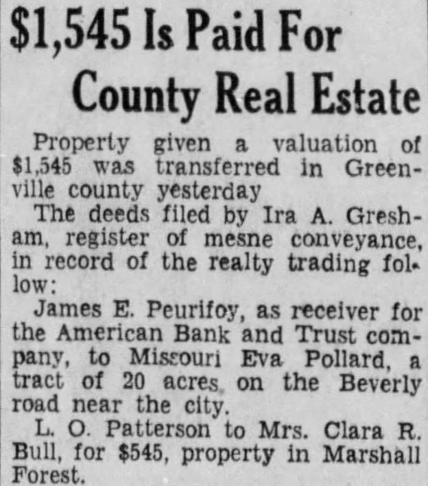 $1,545 Is Paid For County Real Estate Property given valuation of transferred in Greenville county yesterday The deeds filed by Ira A. Gresham, register of mesne conveyance, in record of the realty trading follow James E. Peurifoy, as receiver for the American Bank and Trust company, to Missouri Eva Pollard. tract of 20 acres, on the Beverly road near the city. to Mrs. Clara R. Bull, for $545, property in Marshall Forest.