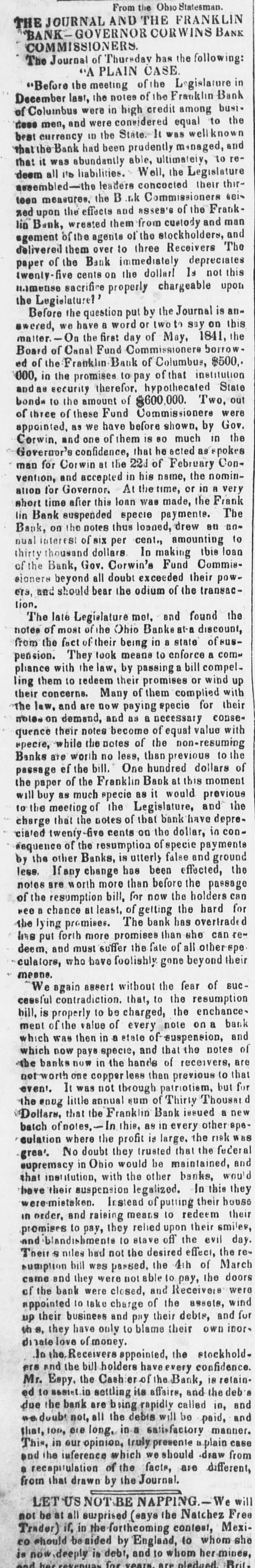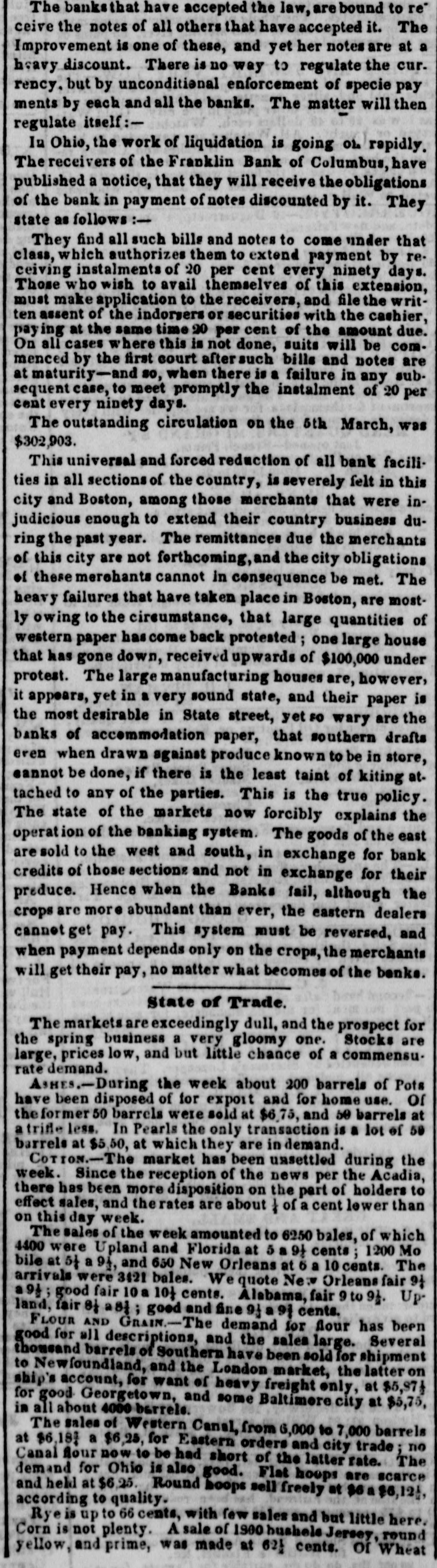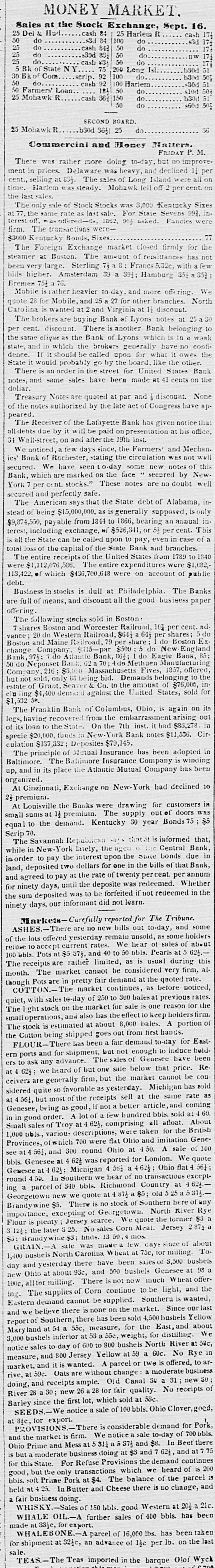 MONEY MARKET. Sales at the Stock Exchange, Sept. 16. cash 8: 25 Harlem R 1100 Sd 84 do cash 843 33d 50 do cash State 75 NY 200 Long 1s! bsod Com 100 92 scrip. b30d 50% 92 cash 100 Hariem 30d 18 Farmers' Loan do 504 s10d 150 cash 36 Mohawk R b30d 50 do $60d 50% SECOND BOARD. 25 Mohawi E 66 do b30d 364 25 Commercial and AVE oncy Watters P. M. FRIDAY There was rather more doing to-day, but no improv ment in prices. Delaware was beavy and dec lined 11 per The sales of Long Island on time. Harlem steady. Mohawk fel off per cent. the last The only sale of Stock Stocks was 3.000 Keatucky Sixes same last sale. For State Sevens 993. terest 1862, asked. Fancies firm The transac tions were$3000 Kentucky Bonds. Sixes for the firmly The Foreign Exchange market closed has steamer at Boston. The amount of very large. Sterling 7 Francs 5.32c, with bills higher. Amsterdam 39 391; Hambarg 35 S5 Bremer 751 a 76. Mobile is rather heavier to day and more off ring. North 28 Mobile for other branches. Virginia at 11 discount. The brokers buying Bank Lyons notes at 25 a 30 per cent. discount. There is another Bank belonging to waak cliqueas the Bank of Lyons which is which the brokers generally have confidence. If it should called upon for what owes the State would probably by the board, like the other. There in the street for United States Bar notes, some sales have been made at 41 cents on the dollar. Treasury Notes are quoted at par and 14 discount. None of the notes authorized by the late act of Congress have ap. peared The Receiver of the Lafayette Bank has given notice that all debts due by be paid on presentation at his office. 31 Wall-street, on and after the 19th inst. We noticed few days since, the Farmers' and Mechan. ics' Bank of Rochester stating the circulation not secured. We have seen o-day some new notes of this the face New. arked OR secured by are Bank, which York per cent. stocks. These notes are no doubt well secured and perfectly safe. The American says that the State debt of Alabama, instead of being $15,000,000, as is generally supposed, only $9,874,550, payable from 1844 to 1866, bearing an annual in terest, including exchange, of 8526,341, or 51 per cent. This the State can be called upon to pay, even in case of total loss of the capital of the State Bank and branches. The entire receipts of the United States from 1789 to 1840 were $1,112,076,586. The entire expenditures were $1,082, 113,422. of which $436,700,648 were on account of public debt. Business in stacks is dull at Philadelphia The Banks are of ineans, and discoant all the good business paper offering The following stocks sold in Boston 103 per cent. ad shares Boston and Worcester Railroad vance; 20 do Western Railroad, $641 a 641 shares; Boston and Maine Ra ilroad, 79 pershare do Boston do Eng $500 : New 8115-par Company change Bank,971; 7 do Atlantic Bank. 864: do Eagle Bank Neponset Bank, 4do Methuen Manufactur Company,2 Jassachusetts Fives. 1857, offered but not sold, only 83 being bid. Demands belonging estate of Grant, Seaver & Co. to the amount $76,000, for ciniling $4,400 dema against the United States, sold $1,532.5M The Franklin Bank of Columbus, Ohio, is again on its legs, having reco from the embarrassment arising out of its loan to the State. On the 7th inst. had $85,278 Cirspecie $20,000 funds New-York Bank notes $11,536. culation $187,332 D reposites $79,145. The principle of Metual Insurance has been adopted in Baltimore. The Bahimore Insurance Company is winding up, and in its place the Atlantic Mutual Company has been organized. At Cincinnati, Exchange on New-1 York had declined 10 21 premium. At Louisville the Banks were drawing for customers in small sums 1 premium. The supply out of doors was 85 equal to the demand. Kentucky SO year Bonds 75 Scrip 70. The Savannah Re that is informed that, Central Bank, while in New-York lately, the agen in in-order to pay the interest upon the State bonds due land, deposited two dollars for one in the bills of that Bank. and agreed to pay at the rate of twenty percent. per annum for ninety days, until the deposite was redeemed. Whether the sum deposited was to be forfeited if not redeemed in the ninety days, our informant did not learn. Markets Carefully reported for The Tribune. ASHES.-There are no new bills out to-day, and some of the lots offered yesterday remain unsold, some of holders ab.ut sales of We hear rates. current relove 100 bbls. Pots at $5 874, and 40 to 50 obis. Pearls 62A.The receipts are rather limited, as is usual during this month. The market cannot be considered very firm, although Pots are in pretty fair demand the quoted rate. noticed before as market continues, COTTON.-T quiet, with sales to-day of 250 to 300 bales at previous rates. The stock on the market for sale one reason for the small operations, and also has the effect keep holders firm. of The stock is estimated at about 8,000 bales. A portion the Cotton being shipped goes out from first hands. FLOUR-There has been fair demand to-day for Eastports and for shipment, but not enough to induce holdern ers any advance. The sales of Genesee have been at 4 62j ; we heard of but one sale below that price. Re ceivers are generally firm, but the market cannot be con sidered quite so favorable as yesterday. Michigan has old as at 4 561, but most of the receipts sell at the same rate Genesee, being as good, if not better article, and coming 60. in in good order. A lot of few hundred bbls. sold at Small sales of Troy at 4 62], comprising all afloat. About 1,000 bbls., variou- descriptions, taken for the British Provinces, which 700 were flat Ohio and limitation Genesee at 561, and 300 round Ohio at 4 50. A sale of 100 bbls. Genesee at 4 62 ₫ was reported for London. We quote Geuesee 4 62}; Michigan 563 a 462 Ohio flat 564 of transac no hear exceptwe Southern In 450. round ing parcel of 340 bbls. Richmond Country at 4624 Georgetown new we quote at 87/ a $5; old 25 5371 Brandy wine $5. There is no stoc