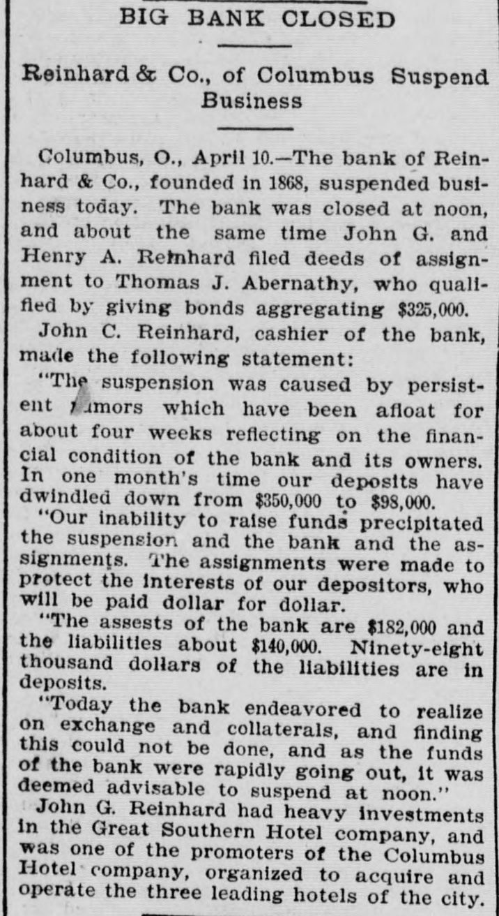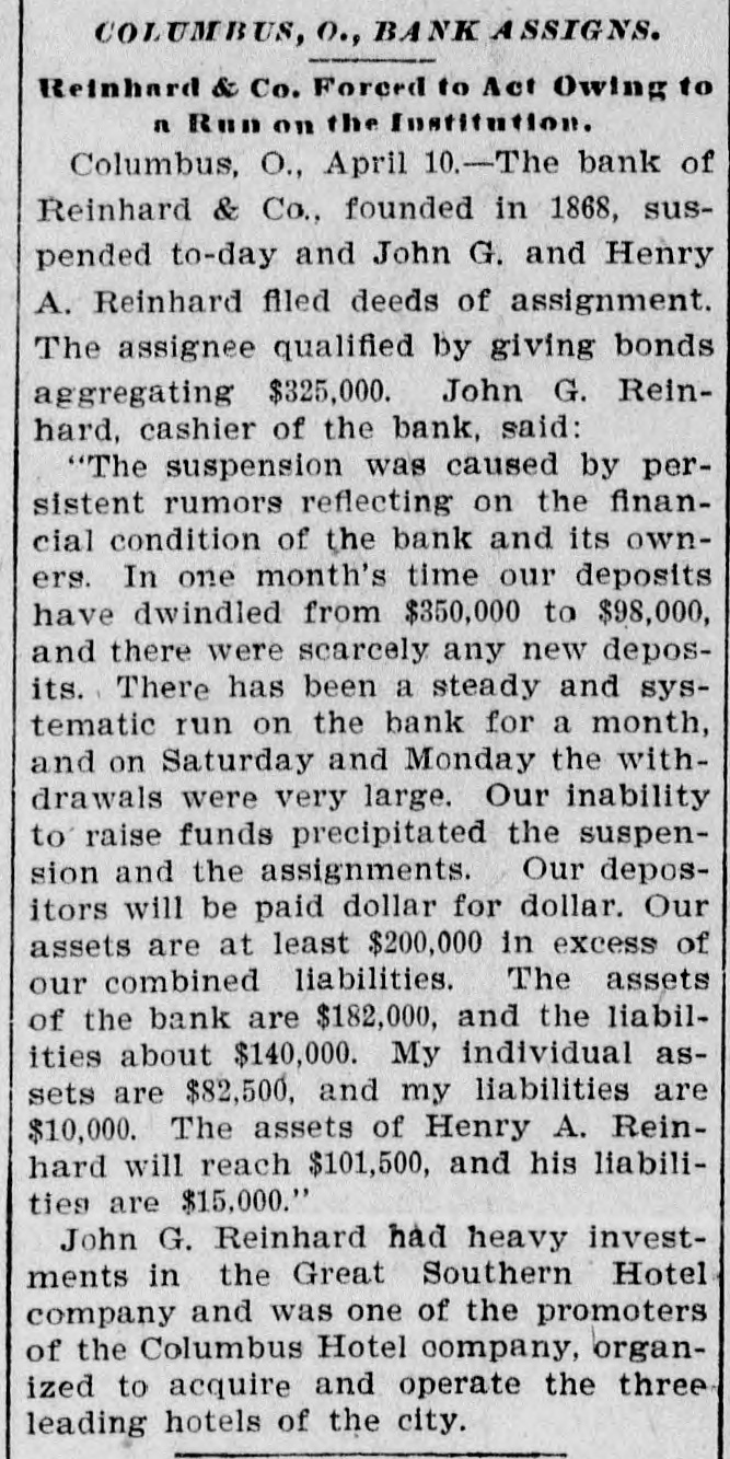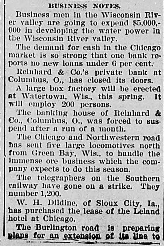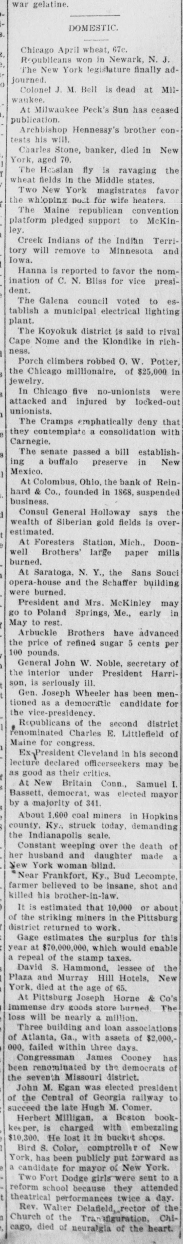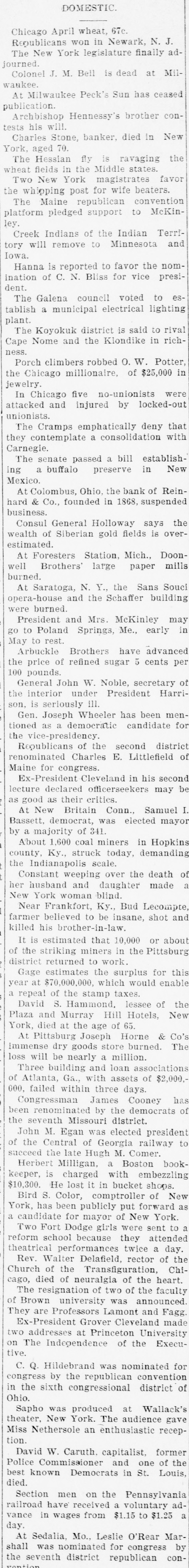 DOMESTIC. Chicago April wheat, 67c. Republicans won in Newark, N. J. The New York legislature finally adjourned. Colonel J. M. Bell is dead at Milwaukee. At Milwaukee Peck's Sun has ceased publication. Archbishop Hennessy's brother contests his will. Charles Stone, banker, died in New York, aged 70. The Hossian fly is ravaging the wheat fields in the Middle states. Two New York magistrates favor the whioping post for wife heaters. The Maine republican convention platform pledged support to McKinley. Creek Indians of the Indian Territory will remove to Minnesota and Iowa. Hanna is reported to favor the nomination of C. N. Bliss for vice president. The Galena council voted to establish a municipal electrical lighting plant. The Koyokuk district is said to rival Cape Nome and the Klondike in richness. Porch climbers robbed O. W. Potter, the Chicago millionaire, of $25,000 in jewelry. In Chicago five no-unionists were attacked and injured by locked-out unionists. The Cramps emphatically deny that they contemplate a consolidation with Carnegie. The senate passed a bill establishing a buffalo preserve in New Mexico. At Colombus, Ohio, the bank of Reinhard & Co., founded in 1868, suspended business. Consul General Holloway says the wealth of Siberian gold fields is overestimated. At Foresters Station, Mich., Doonwell Brothers' large paper mills burned. At Saratoga, N. Y., the Sans Souci opera-house and the Schaffer building were burned. President and Mrs. McKinley may go to Poland Springs, Me., early in May to rest. Arbuckle Brothers have advanced the price of refined sugar 5 cents per 100 pounds. General John W. Noble, secretary of the interior under President Harrison, is seriously ill. Gen. Joseph Wheeler has been mentioned as a democratic candidate for the vice-presidency. Republicans of the second district renominated Charles E. Littlefield of Maine for congress. Ex-President Cleveland in his second lecture declared officerseekers may be as good as their critics. At New Britain Conn., Samuel I. Bassett, democrat, was elected mayor by a majority of 341. About 1,600 coal miners in Hopkins county, Ky,, struck today, demanding the Indianapolis seale. Constant weeping over the death of her husband and daughter made a New York woman blind. "Near Frankfort, Ky., Bud Lecompte, farmer believed to be insane, shot and killed his brother-in-law. It is estimated that 10,000 or about of the striking miners in the Pittsburg district returned to work. Gage estimates the surplus for this year at $70,000,000, which would enable a repeal of the stamp taxes. David S. Hammond, lessee of the Plaza and Murray Hill Hotels, New