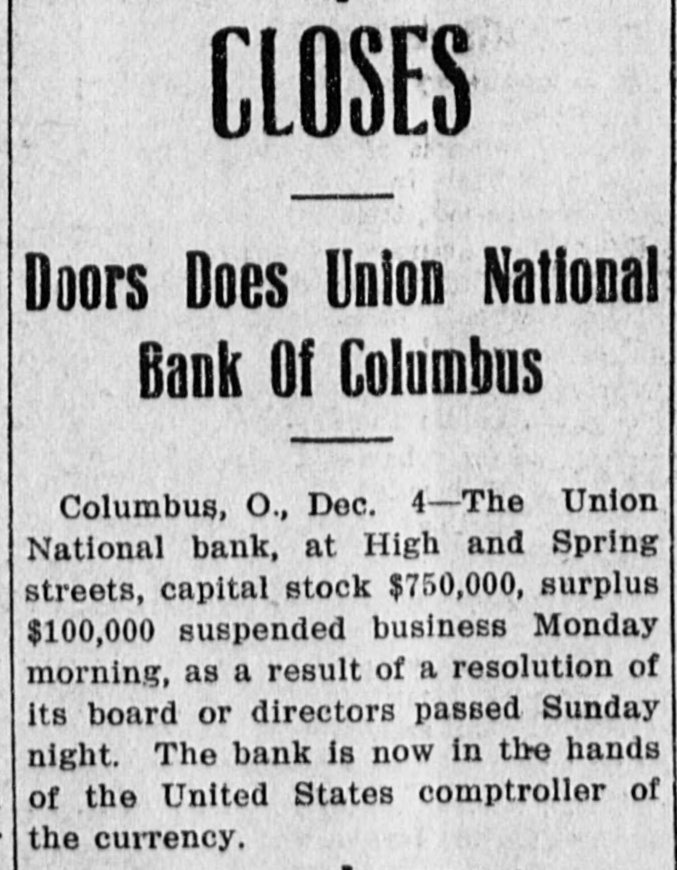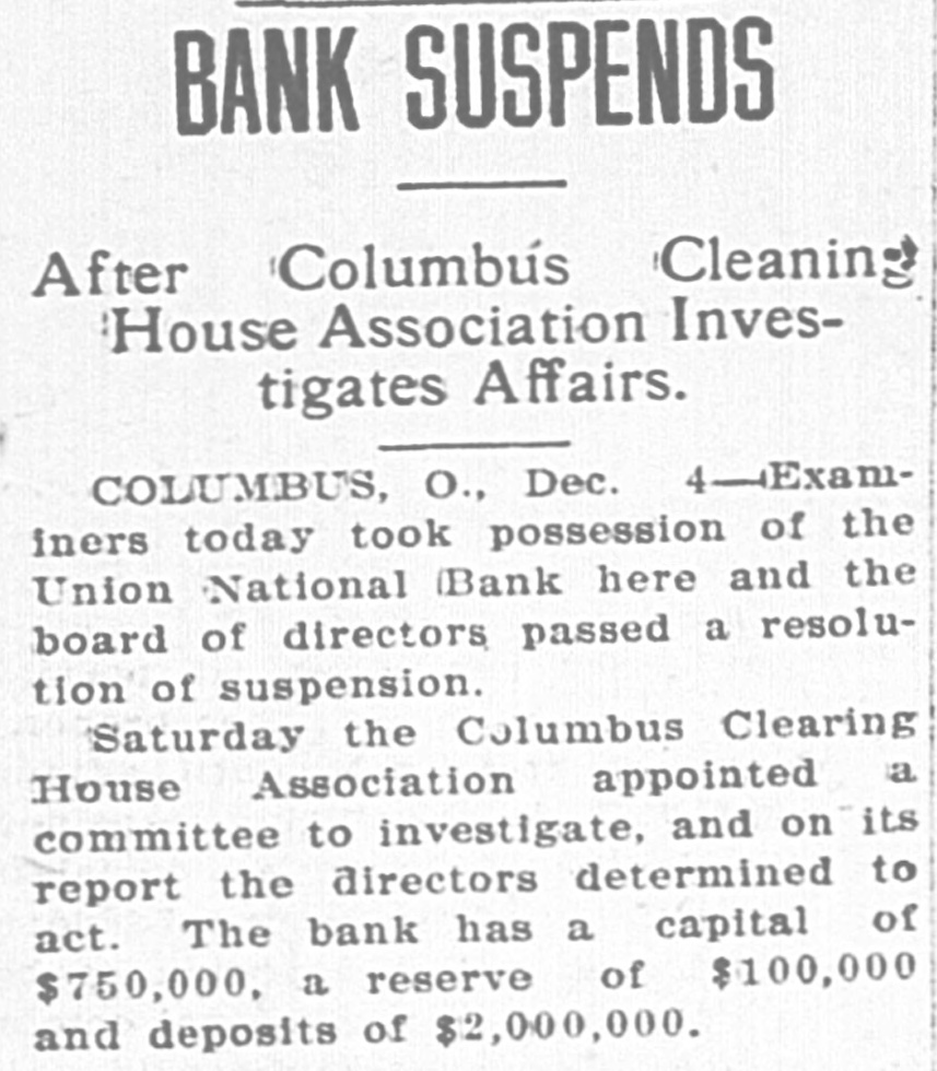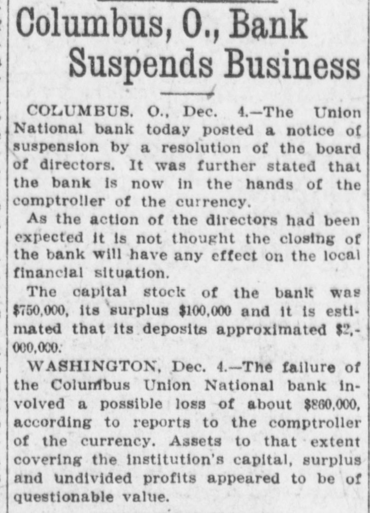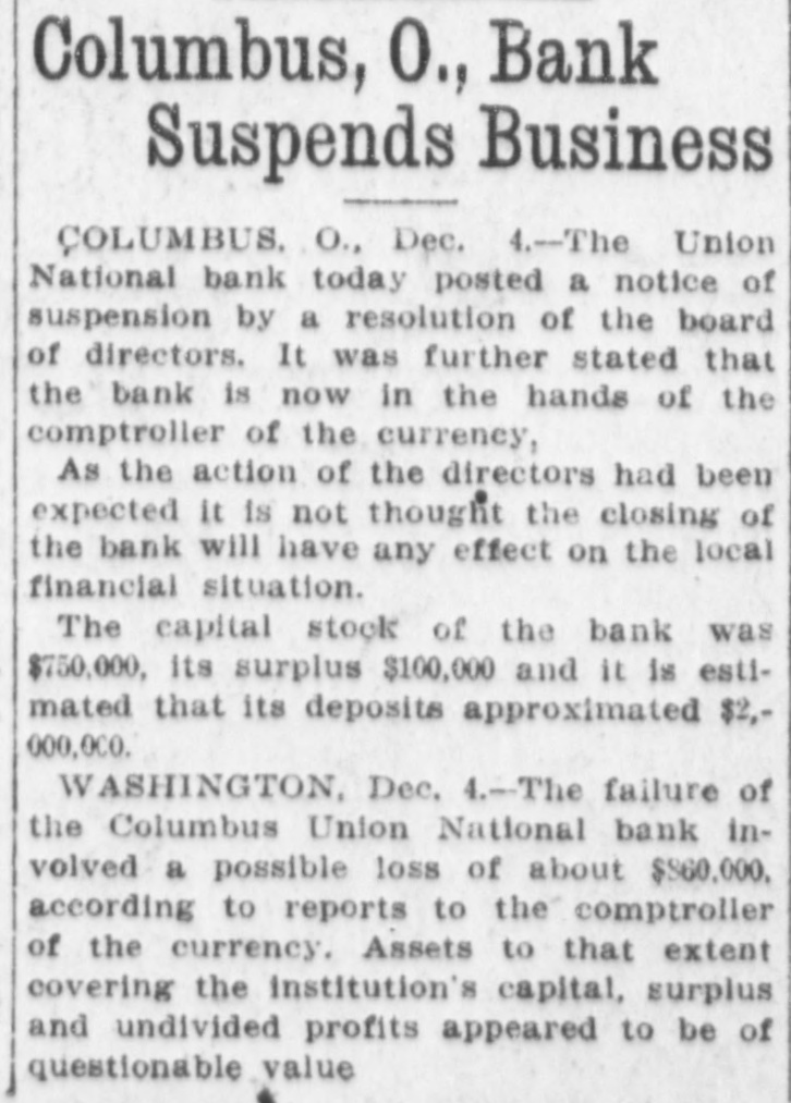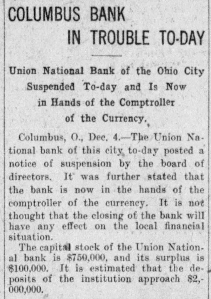 COLUMBUS BANK IS CLOSED TODAY Union National Bank Suspends and is Now in Hands of Comptroller of The Treasury. Columbus, O., Dec. 10.-The Union National bank today posted a notice of suspension by a resolution of the board of directors. It was further stated that the bank is now in the hands of the comptroller of the currency. As the action of the directors had been expected it is not thought the closing of the bank will have any effect on the local financial situation. National Bank Examiner Goodhart of Washington has been in Columbus for some time going over the affairs of the bank. Saturday the Columbus Clearing House association appointed a committee of five to inquire into the bank's condition to see if it could extend support. The capital stock of the bank was $750,000, its surplus $100,000, and it is estimated that its deposits approximated $2,000,000.