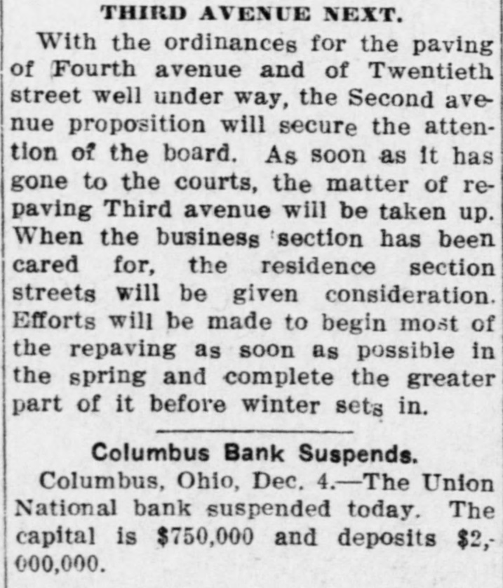 THIRD AVENUE NEXT. With the ordinances for the paving of Fourth avenue and of Twentieth street well under way, the Second avenue proposition will secure the attention of the board. As soon as It has gone to the courts, the matter of repaving Third avenue will be taken up. When the business section has been cared for, the residence section streets will be given consideration. Efforts will be made to begin most of the repaving as soon as possible in the spring and complete the greater part of it before winter sets in. Columbus Bank Suspends. Columbus, Ohio, Dec. 4.-The Union National bank suspended today. The capital is $750,000 and deposits $2,000,000.