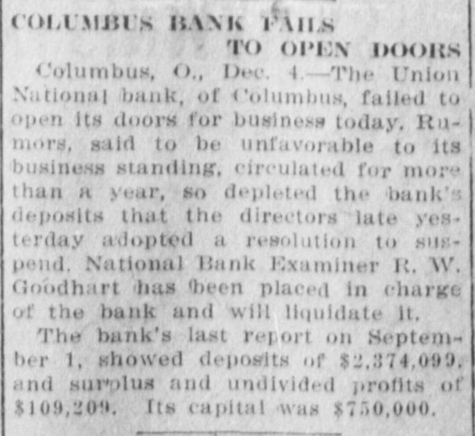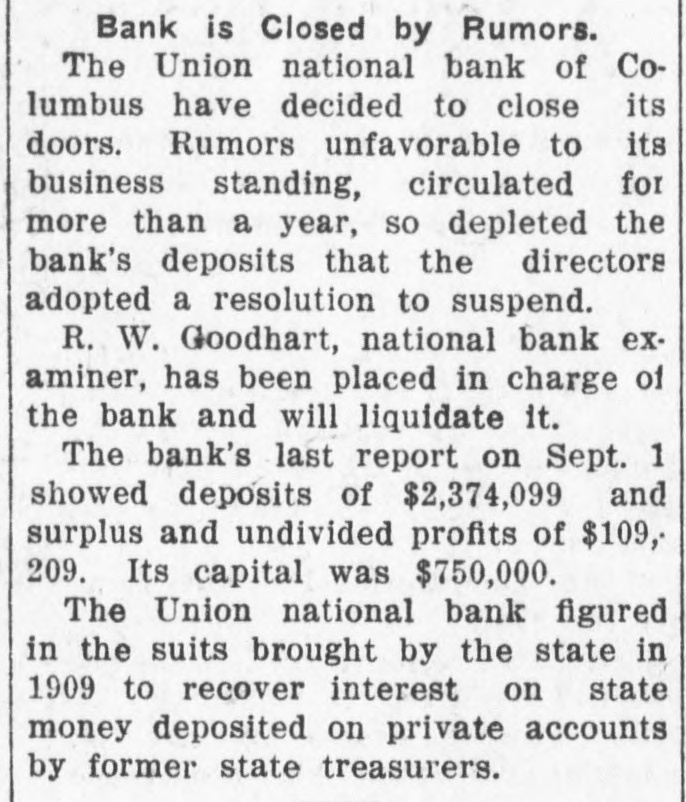 Bank is Closed by Rumors. The Union national bank of Columbus have decided to close its doors. Rumors unfavorable to its business standing, circulated for more than a year, so depleted the bank's deposits that the directors adopted a resolution to suspend. R. W. Goodhart, national bank examiner, has been placed in charge of the bank and will liquidate it. The bank's last report on Sept. 1 showed deposits of $2,374,099 and surplus and undivided profits of $109,209. Its capital was $750,000. The Union national bank figured in the suits brought by the state in 1909 to recover interest on state money deposited on private accounts by former state treasurers.