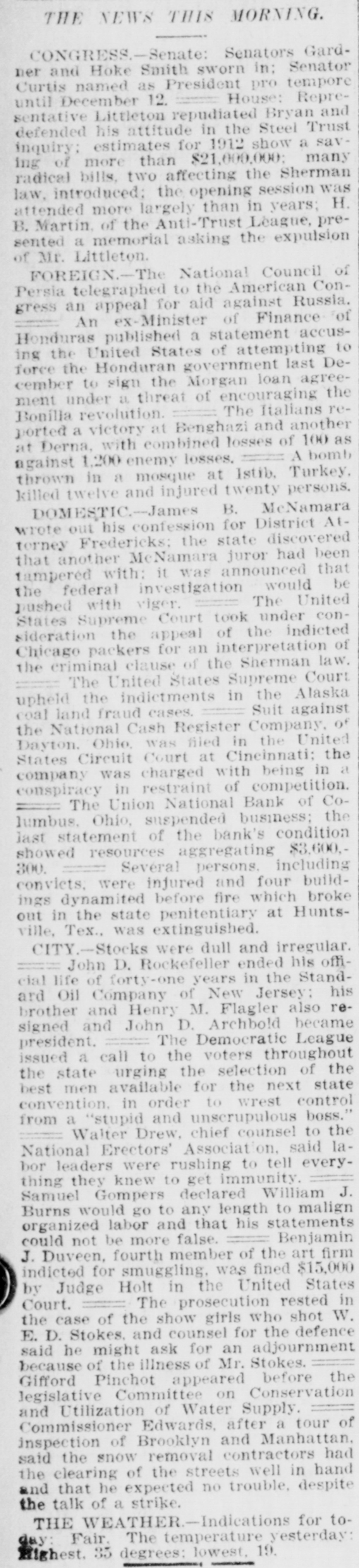 CONGRESS.-Senate: Senators Gardner and Hoke Smith sworn in: Senator Curtis named as President pro tempore until December 12. House: Representative Littleton repudiated Bryan and defended his attitude in the Steel Trust inquiry; estimates for 1912 show a saving of more than $21,000,000; many radical bills, two affecting the Sherman law, introduced: the opening session was attended more largely than in years; H. B. Martin. of the Anti-Trust League, presented a memorial asking the expulsion of Mr. Littleton. FOREIGN.-The National Council of Persia telegraphed to the American Congress an appeal for aid against Russia. An ex-Minister of Finance of Honduras published a statement accusing the United States of attempting to force the Honduran government last December to sign the Morgan loan agreement under a threat of encouraging the Bonilla revolution. ========================= The Italians reported a victory at Benghazi and another at Derna, with combined losses of 100 as against 1,200 enemy losses. A bomb thrown in a mosque at Istib, Turkey. killed twelve and injured twenty persons. DOMESTIC.-James B. McNamara wrote out his confession for District Attorney Fredericks; the state discovered that another McNamara juror had been tampered with: it was announced that the federal investigation would be pushed with viger. ========================= The United States Supreme Court took under consideration the appeal of the indicted Chicago packers for an interpretation of the criminal clause of the Sherman law. The United States Supreme Court upheld the indictments in the Alaska Suit against coal land fraud cases. the National Cash Register Company, of Dayton. Ohio, was filed in the United States Circuit Court at Cincinnati: the company was charged with being in a conspiracy in restraint of competition. The Union National Bank of Columbus. Ohio, suspended business: the last statement of the bank's condition showed resources aggregating $3.600,300. Several persons. including convicts; were injured and four buildings dynamited before fire which broke out in the state penitentiary at Huntsville, Tex., was extinguished. CITY.-Stocks were dull and irregular. John D. Rockefeller ended his official life of forty-one years in the Standard Oil Company of New Jersey: his brother and Henry M. Flagler also resigned and John D. Archbold became president. The Democratic League issued a call to the voters throughout the state urging the selection of the best men available for the next state convention. in order to wrest control from a "stupid and unscrupulous boss." Walter Drew, chief counsel to the National Erectors' Association, said labor leaders were rushing to tell everything they knew to get immunity. Samuel Gompers declared William J. Burns would go to any length to malign organized labor and that his statements could not be more false. Benjamin J. Duveen, fourth member of the art firm indicted for smuggling, was fined $15,000 by Judge Holt in the United States Court. The prosecution rested in the case of the show girls who shot W. E. D. Stokes. and counsel for the defence said he might ask for an adjournment because of the illness of Mr. Stokes. Gifford Pinchot appeared before the legislative Committee on Conservation and Utilization of Water Supply. Commissioner Edwards, after a tour of inspection of Brooklyn and Manhattan, said the snow removal contractors had the clearing of the streets well in hand and that he expected no trouble, despite