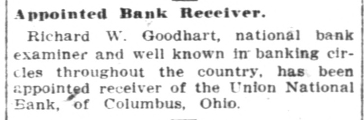 Appointed Bank Receiver. Richard W. Goodhart, national bank examiner and well known in banking circles throughout the country, has been appointed receiver of the Union National Bank, of Columbus, Ohio.