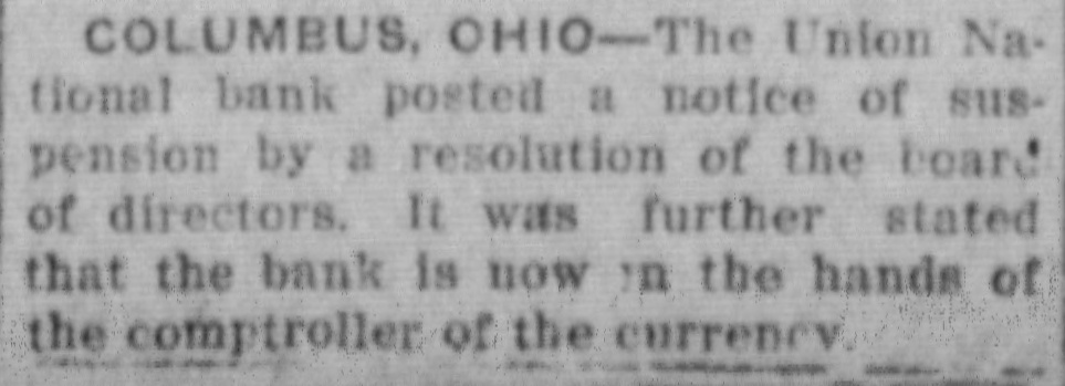 COLUMBUS, OHIO-The Union National bank posted a notice of suspension by a resolution of the board of directors. It was further stated that the bank is now in the hands of the comptroller of the currency. --