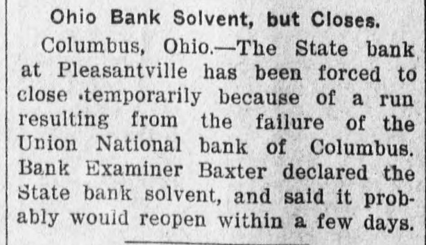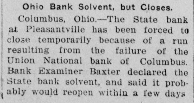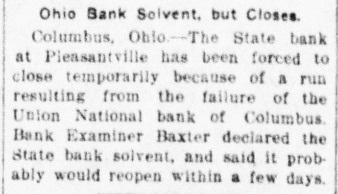 Ohio Bank Solvent, but Closes. Columbus, Ohio-The State bank at Pleasantville has been forced to close temporarily because of a run resulting from the failure of the Union National bank of Columbus. Bank Examiner Baxter declared the State bank solvent, and said it probably would reopen within a few days.