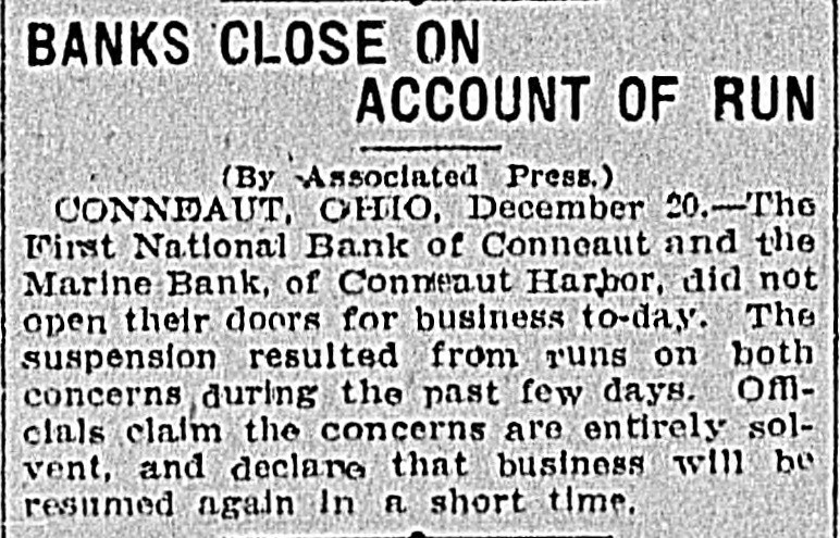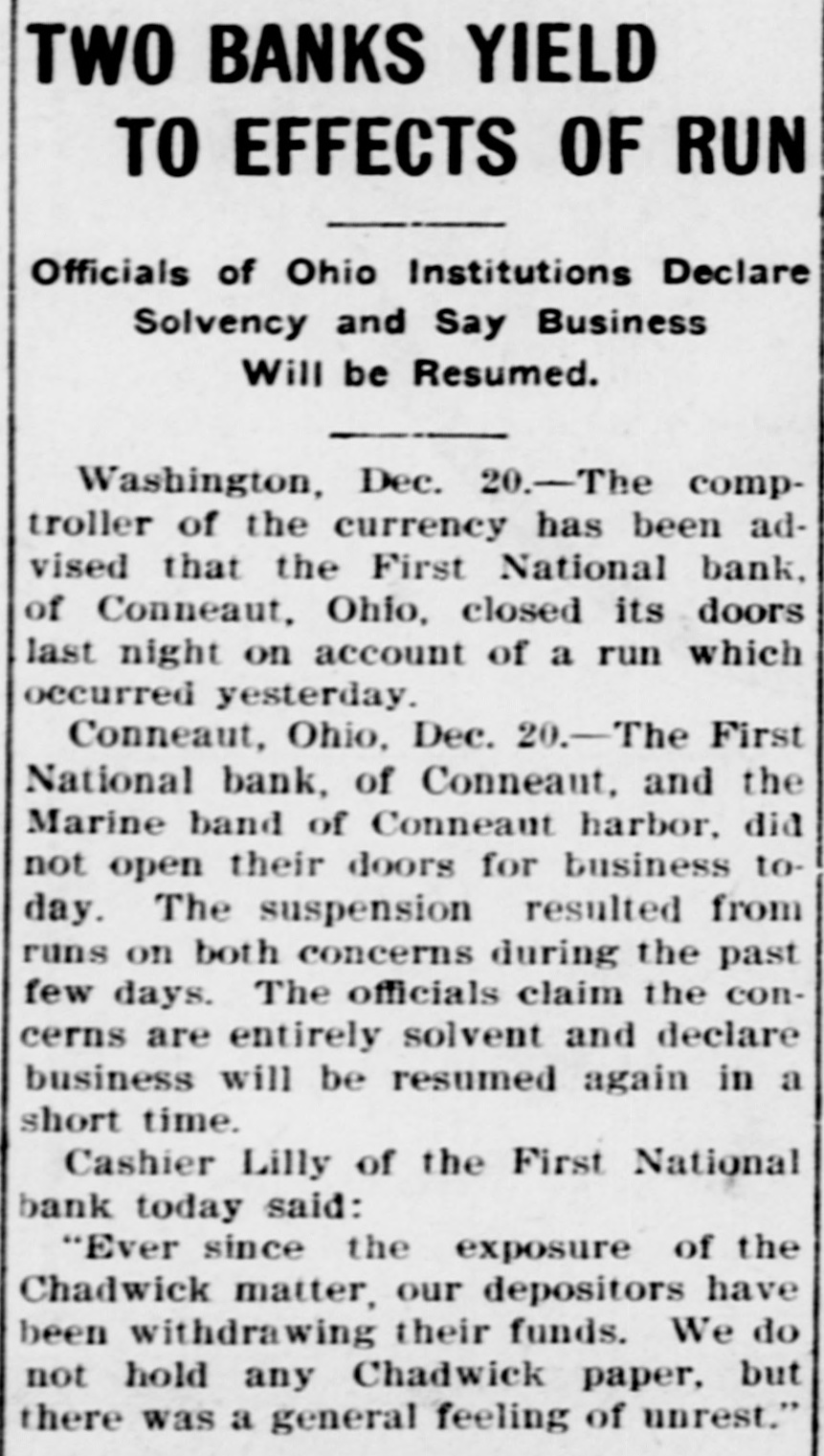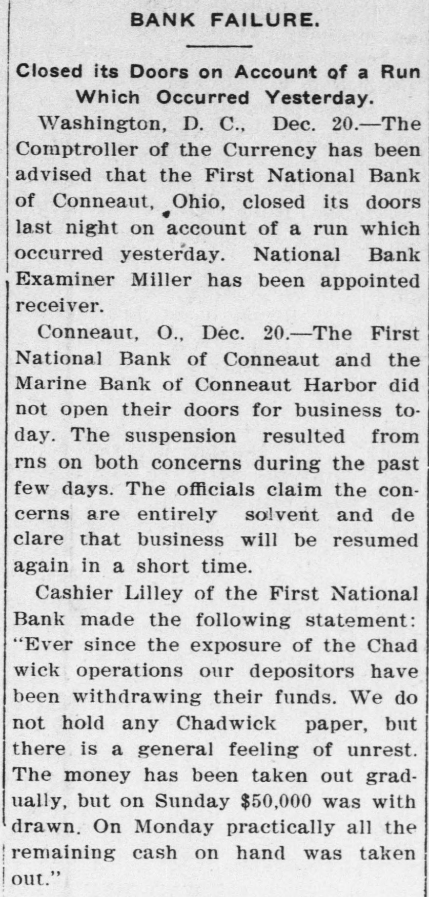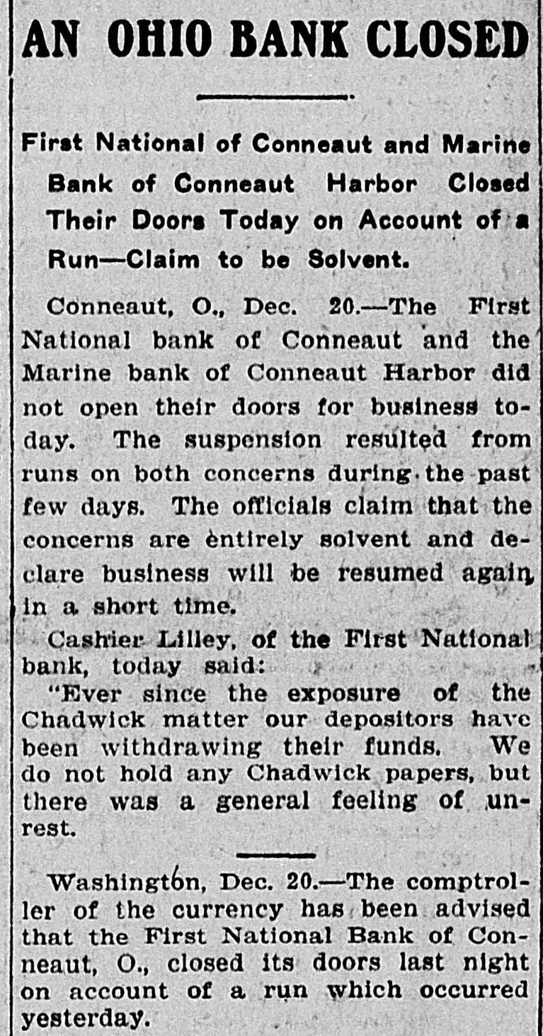 AN OHIO BANK CLOSED First National of Conneaut and Marine Bank of Conneaut Harbor Closed Their Doors Today on Account of Run-Claim to be Solvent. Conneaut, O., Dec. 20.-The First National bank of Conneaut and the Marine bank of Conneaut Harbor did not open their doors for business today. The suspension resulted from runs on both concerns during. the past few days. The officials claim that the concerns are entirely solvent and declare business will be resumed again in a short time. Cashier Lilley, of the First National bank, today said: "Ever since the exposure of the Chadwick matter our depositors have been withdrawing their funds. We do not hold any Chadwick papers, but there was a general feeling of unrest. Washington, Dec. 20.-The comptroller of the currency has been advised that the First National Bank of Conneaut, O., closed its doors last night on account of a run which occurred yesterday.