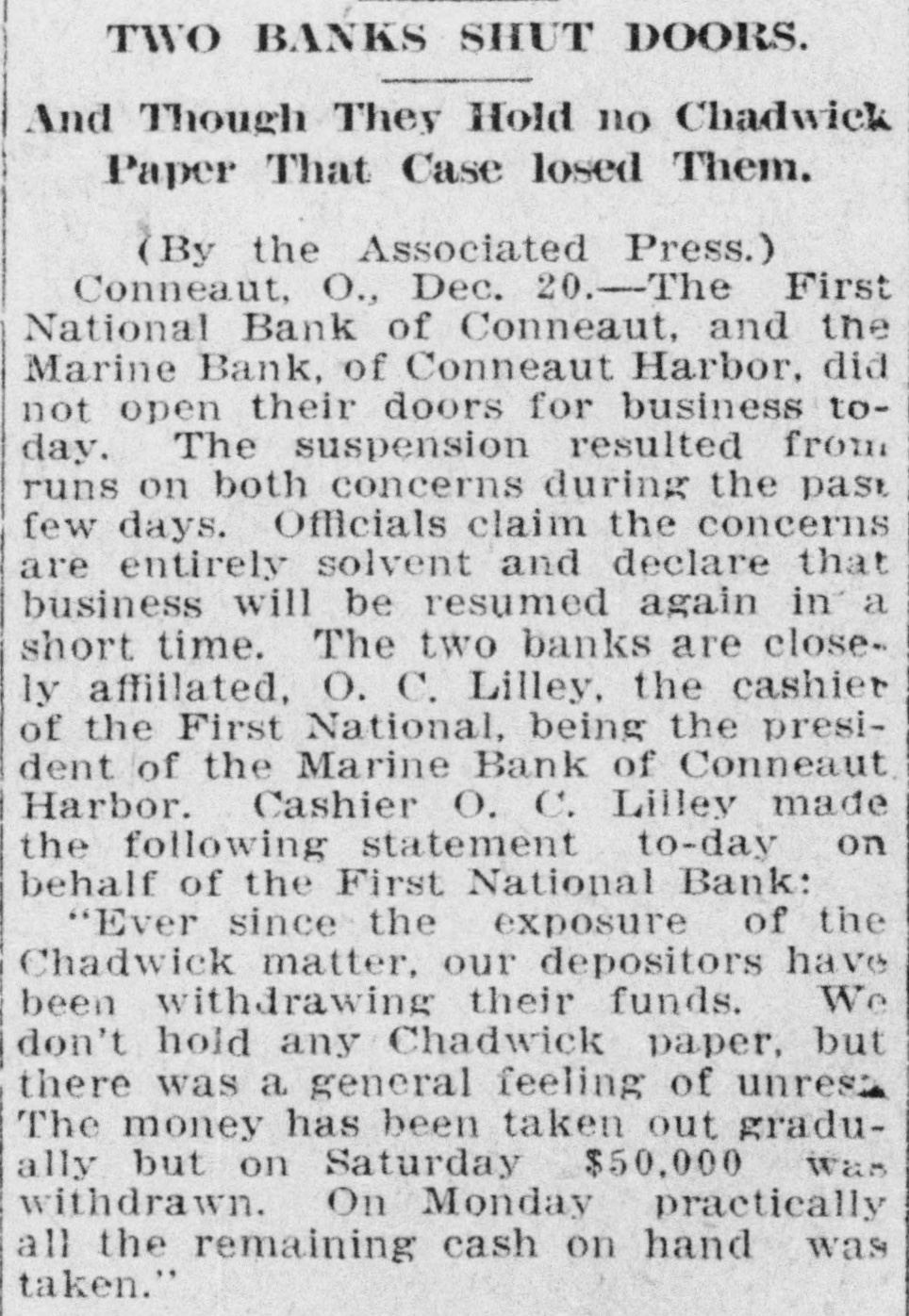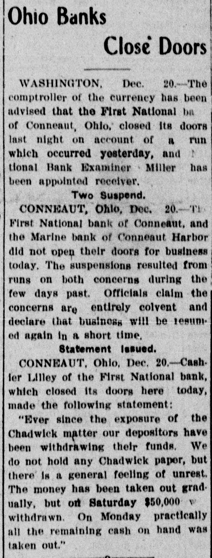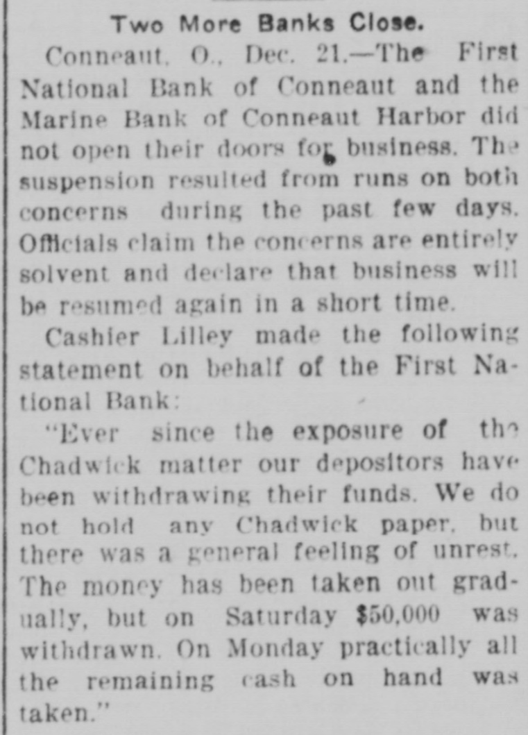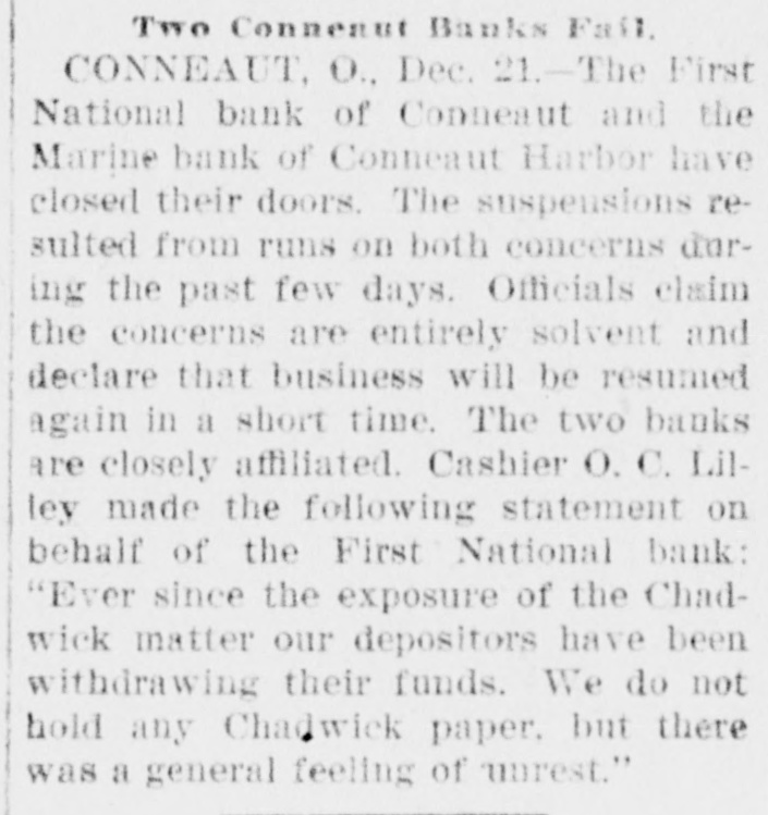 Two More Banks Close. Conneaut. O., Dec. 21.-The First National Bank of Conneaut and the Marine Bank of Conneaut Harbor did not open their doors for business. The suspension resulted from runs on both concerns during the past few days. Officials claim the concerns are entirely solvent and declare that business will be resumed again in a short time. Cashier Lilley made the following statement on behalf of the First National Bank: "Ever since the exposure of the Chadwick matter our depositors have been withdrawing their funds. We do not hold any Chadwick paper. but there was a general feeling of unrest. The money has been taken out gradually, but on Saturday $50,000 was withdrawn. On Monday practically all the remaining cash on hand was taken."