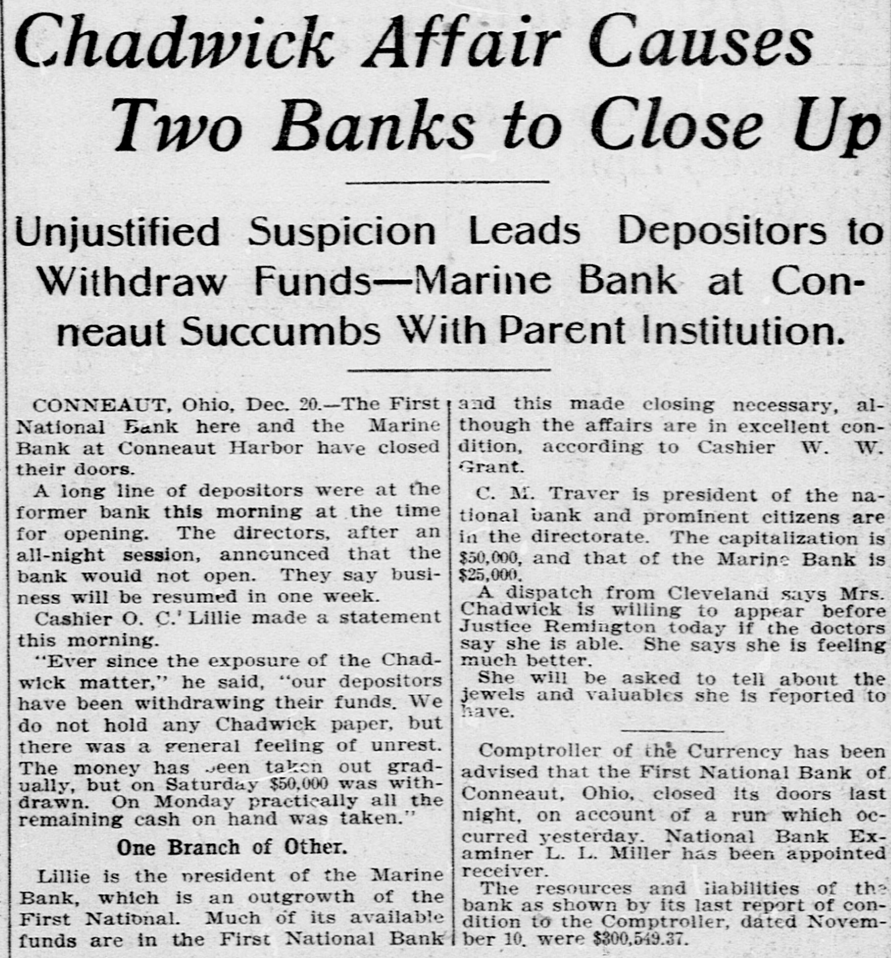 Chadwick Affair Causes Two Banks to Close Up Unjustified Suspicion Leads Depositors to Withdraw Funds-Marine Bank at Conneaut Succumbs With Parent Institution. CONNEAUT, Ohio, Dec. 20.-The First and this made closing necessary, although the affairs are in excellent conNational Bank here and the Marine dition, according to Cashier W. W. Bank at Conneaut Harbor have closed Grant. their doors. A long line of depositors were at the C. M. Traver is president of the naformer bank this morning at the time tional bank and prominent citizens are for opening. The directors, after an in the directorate. The capitalization is all-night session, announced that the $50,000, and that of the Marine Bank is $25,000. bank would not open. They say busiA dispatch from Cleveland says Mrs. ness will be resumed in one week. Chadwick is willing to appear before Cashier O. C.' Lillie made a statement Justice Remington today if the doctors this morning. say she is able. She says she is feeling much better. "Ever since the exposure of the ChadShe will be asked to tell about the wick matter," he said, "our depositors jewels and valuables she is reported to have been withdrawing their funds. We have. do not hold any Chadwick paper, but there was a general feeling of unrest. Comptroller of the Currency has been The money has Jeen taken out gradadvised that the First National Bank of ually, but on Saturday $50,000 was withConneaut, Ohio, closed its doors last drawn. On Monday practically all the night, on account of a run which ocremaining cash on hand was taken." curred yesterday. National Bank ExOne Branch of Other. aminer L. L. Miller has been appointed receiver. Lillie is the president of the Marine The resources and liabilities of the Bank, which is an outgrowth of the bank as shown by its last report of conFirst National. Much of its available dition to the Comptroller, dated November 10. were $300,549.37. funds are in the First National Bank